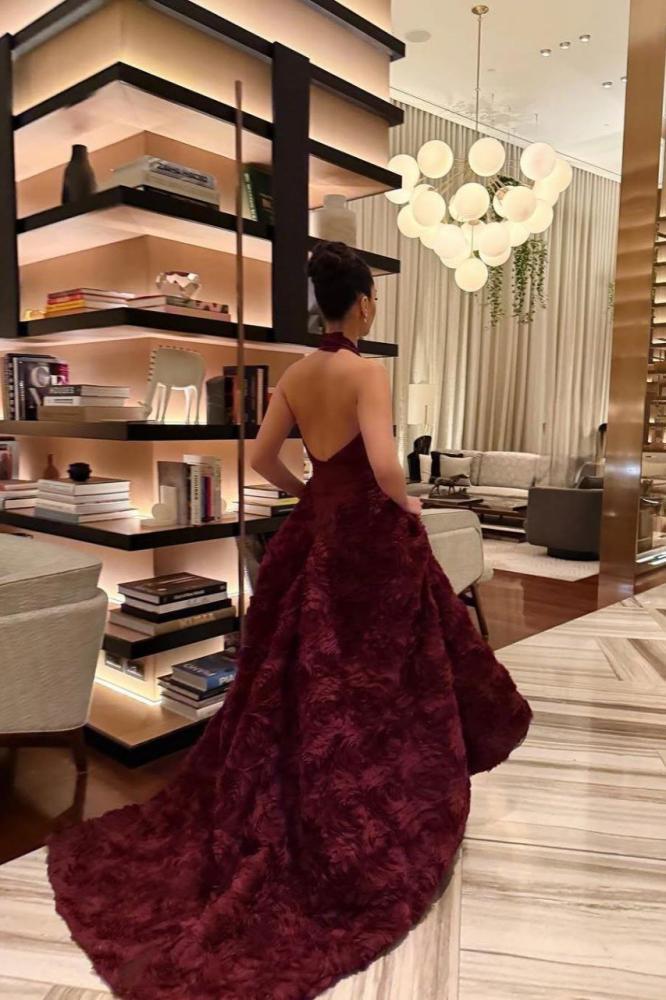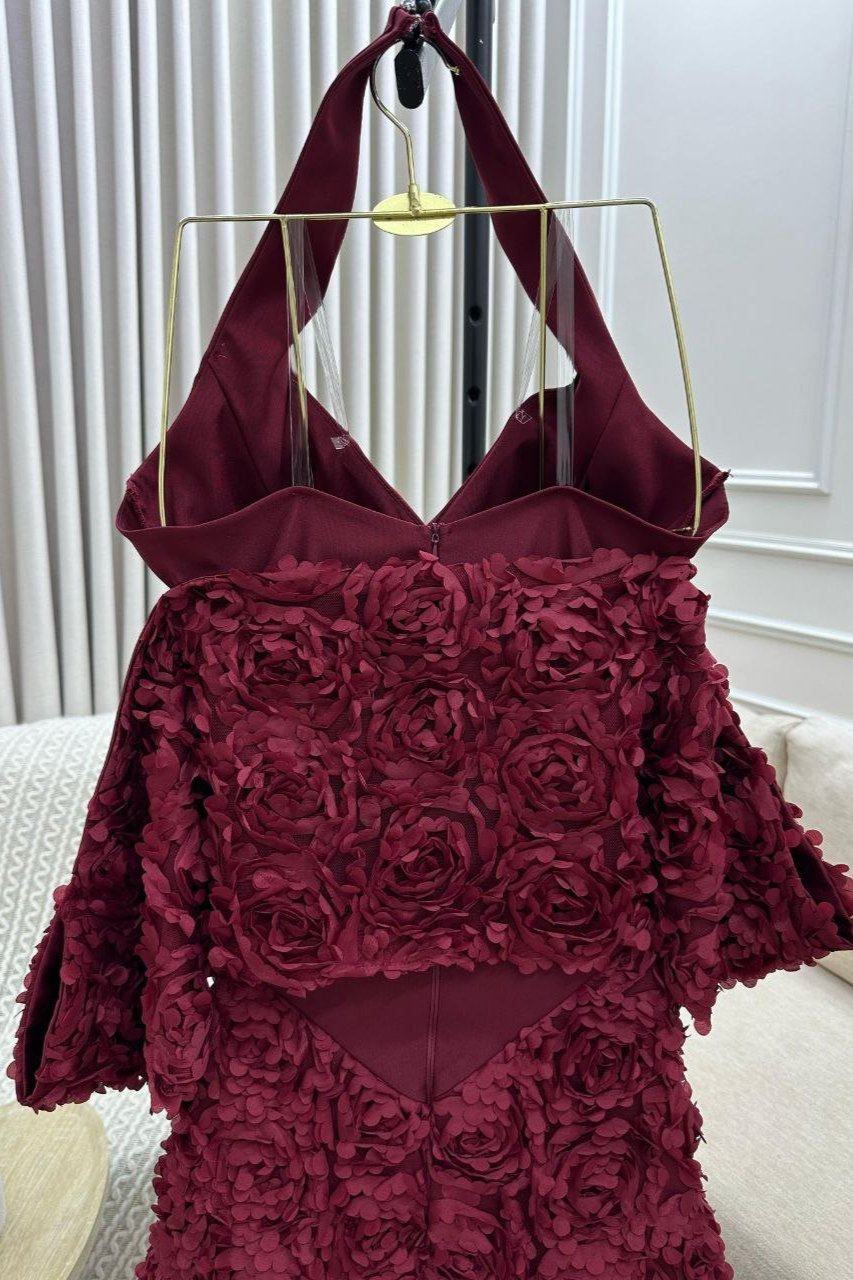 تألقي بإطلالة فاخرة مع هذا الفستان المذهل بلون البورغندي العميق، يتميز بقصة ضيقة عند الخصر وتنورة واسعة مزينة بتفاصيل ورود ثلاثية الأبعاد لمظهر أنثوي راقٍ. التصميم بدون أكمام وبياقة على الرقبة يضفي لمسة كلاسيكية جذابة، مما يجعله خيارًا مثالياً للمناسبات الفاخرة والسهرات المميزة.