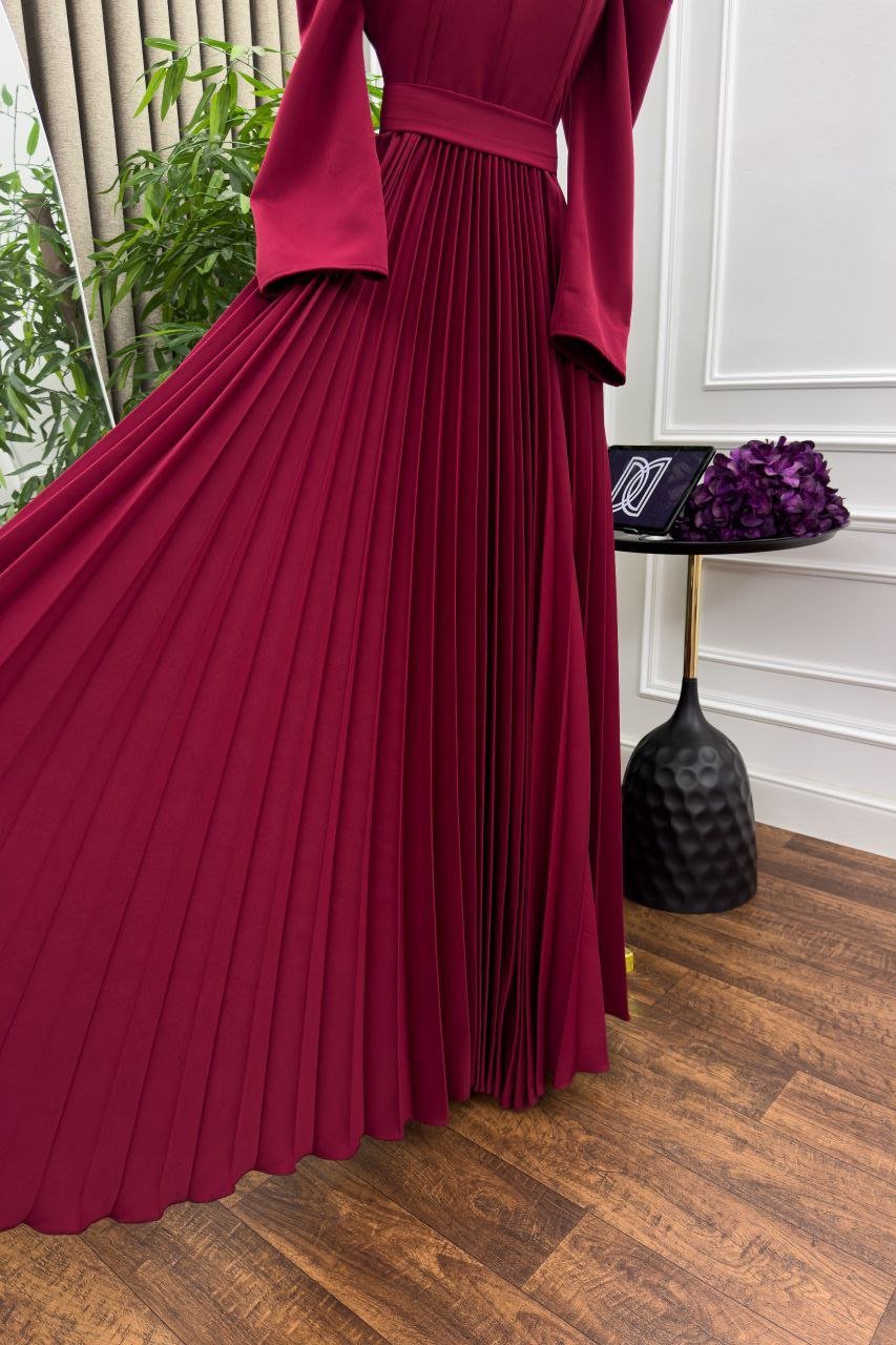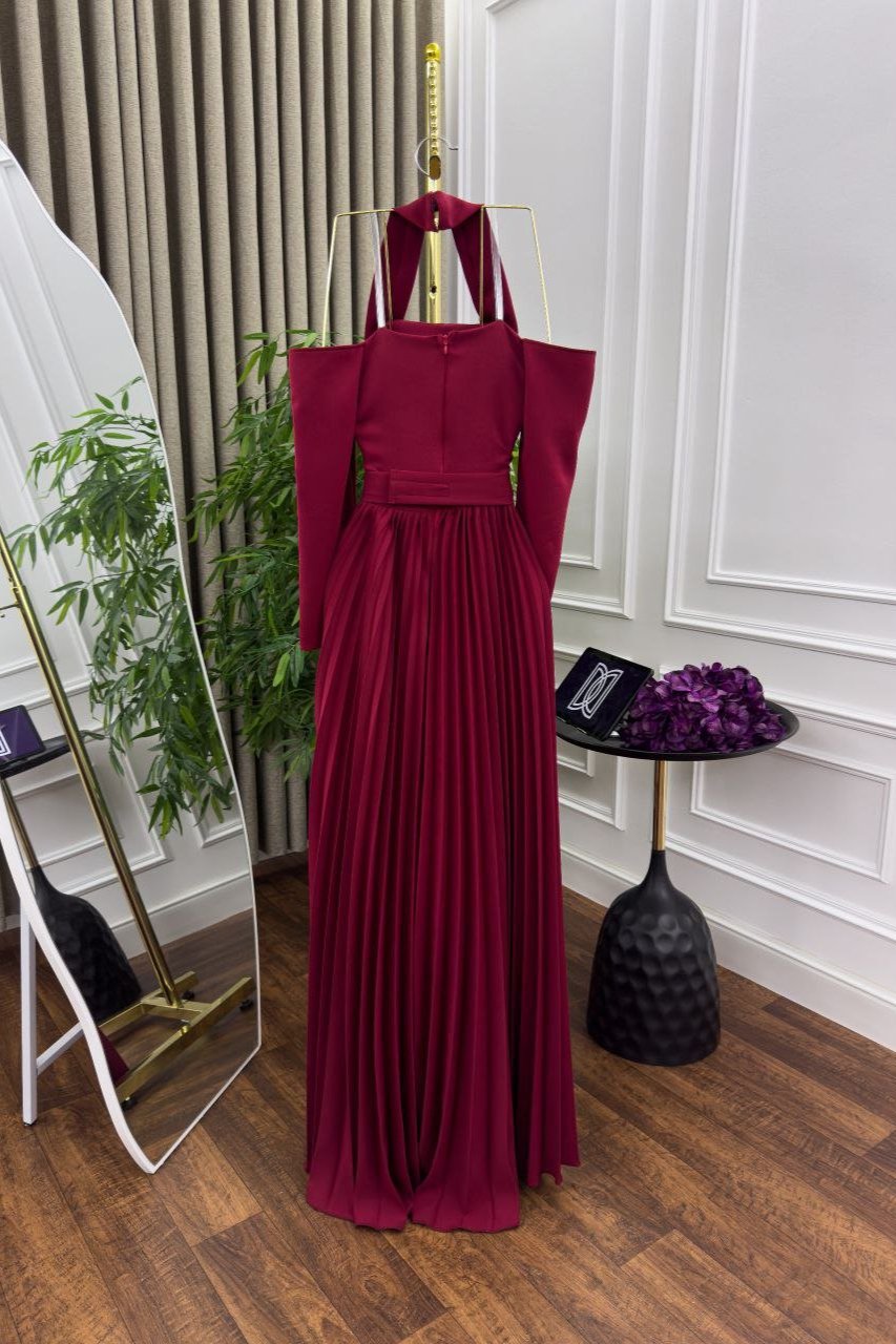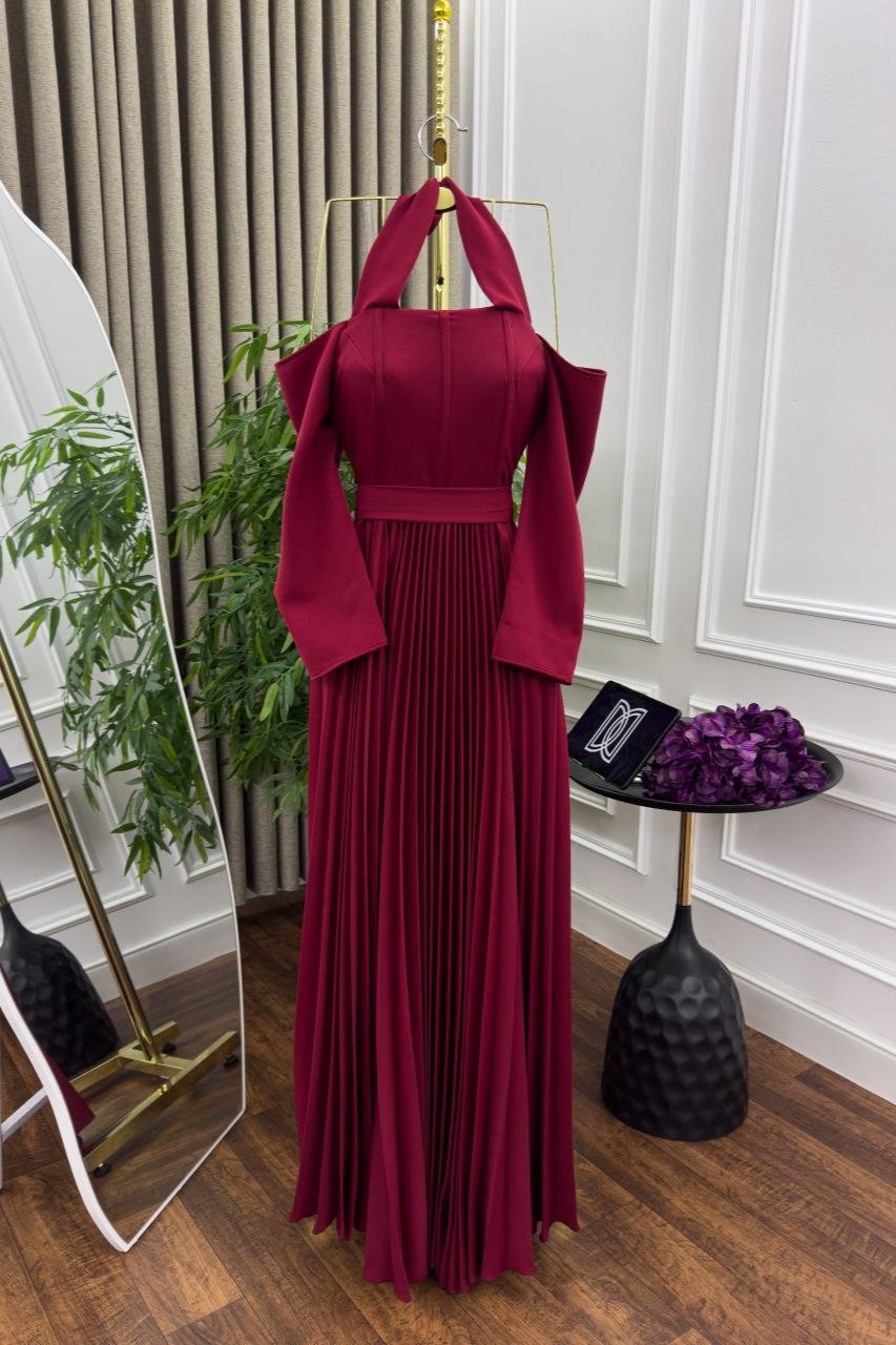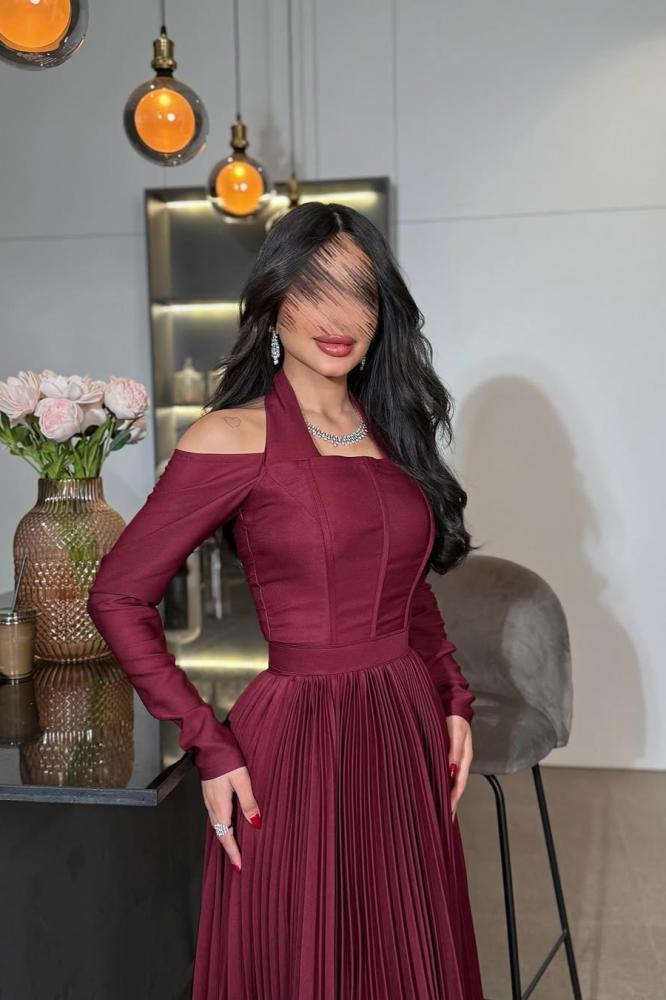 فستان أنيق باللون العنابي يتميز بتصميم راقٍ بقصة الأكتاف المكشوفة وأكمام طويلة لمظهر جذاب ومتناسق. التنورة ذات الكسرات تضفي لمسة كلاسيكية وحركة راقية، مما يجعله خيارًا مثاليًا للمناسبات الفاخرة. تصميمه يعكس الأنوثة بأسلوب عصري ومميز.