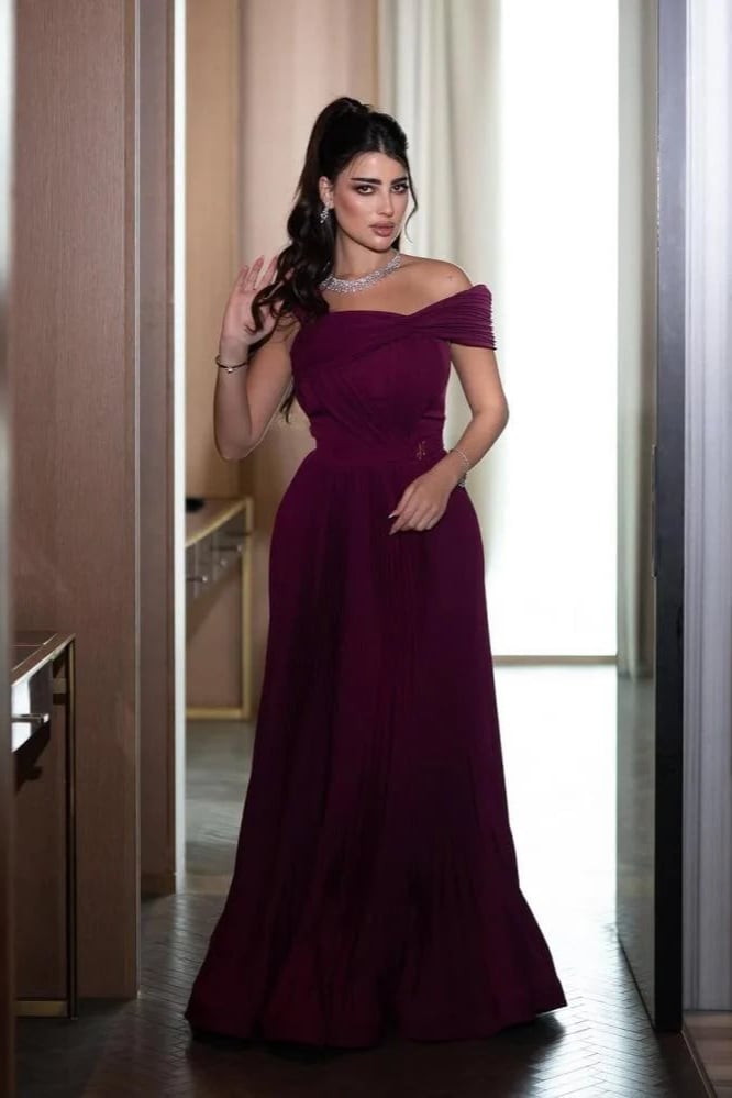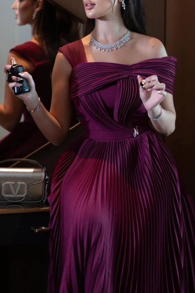 فستان سهرة برغندي طويل مطوي بكشكة منسدلة