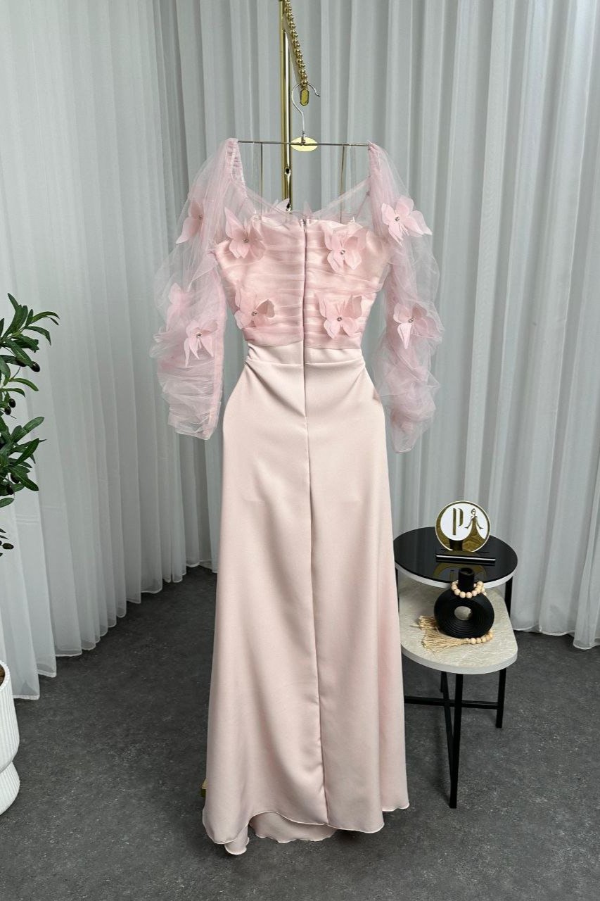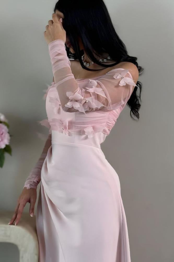 فستان أنثوي ناعم بتصميم مكشوف الأكتاف وأكمام شفافة طويلة مزينة بتفاصيل الفراشات المميزة، مما يمنحه لمسة ساحرة ورقيقة.