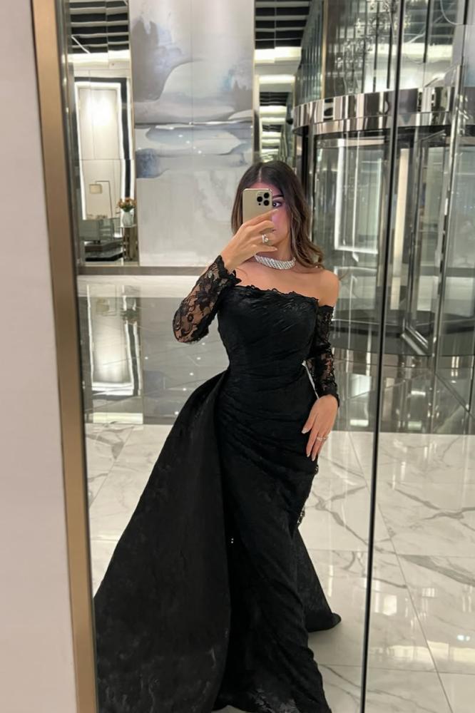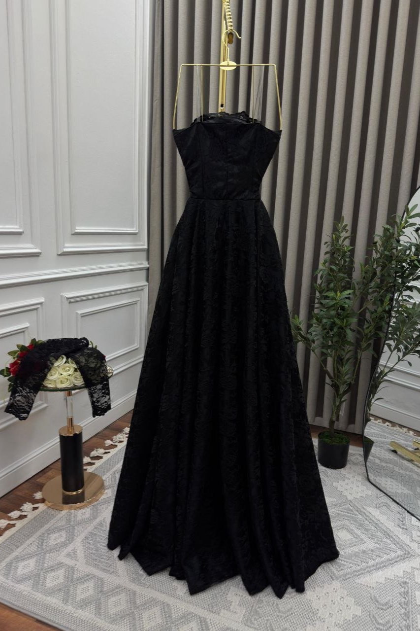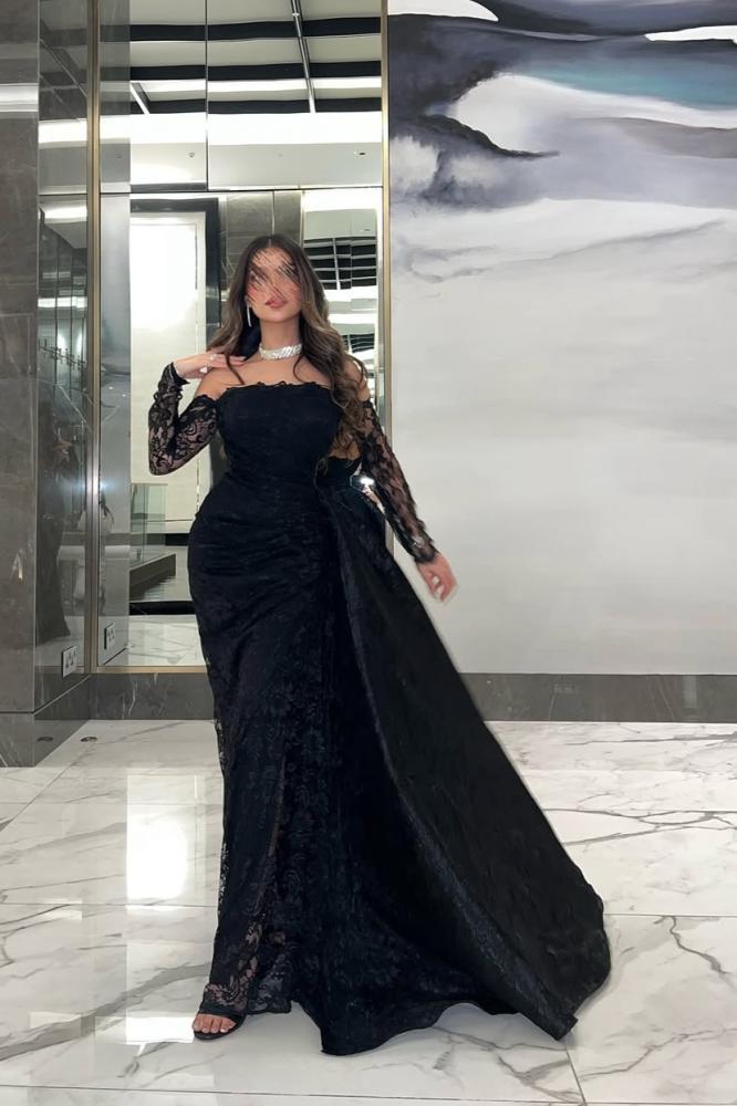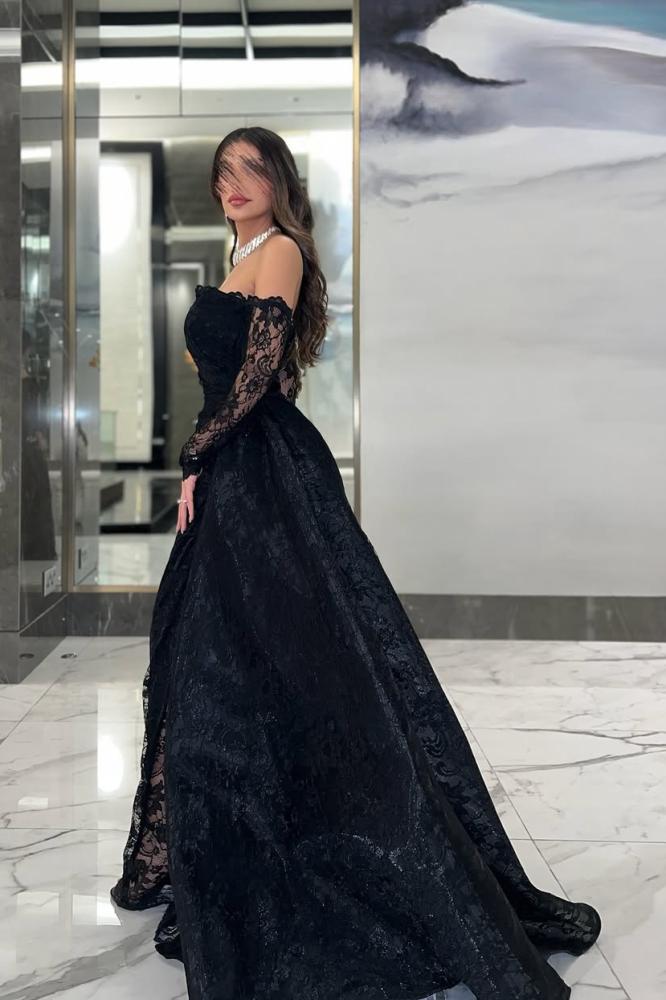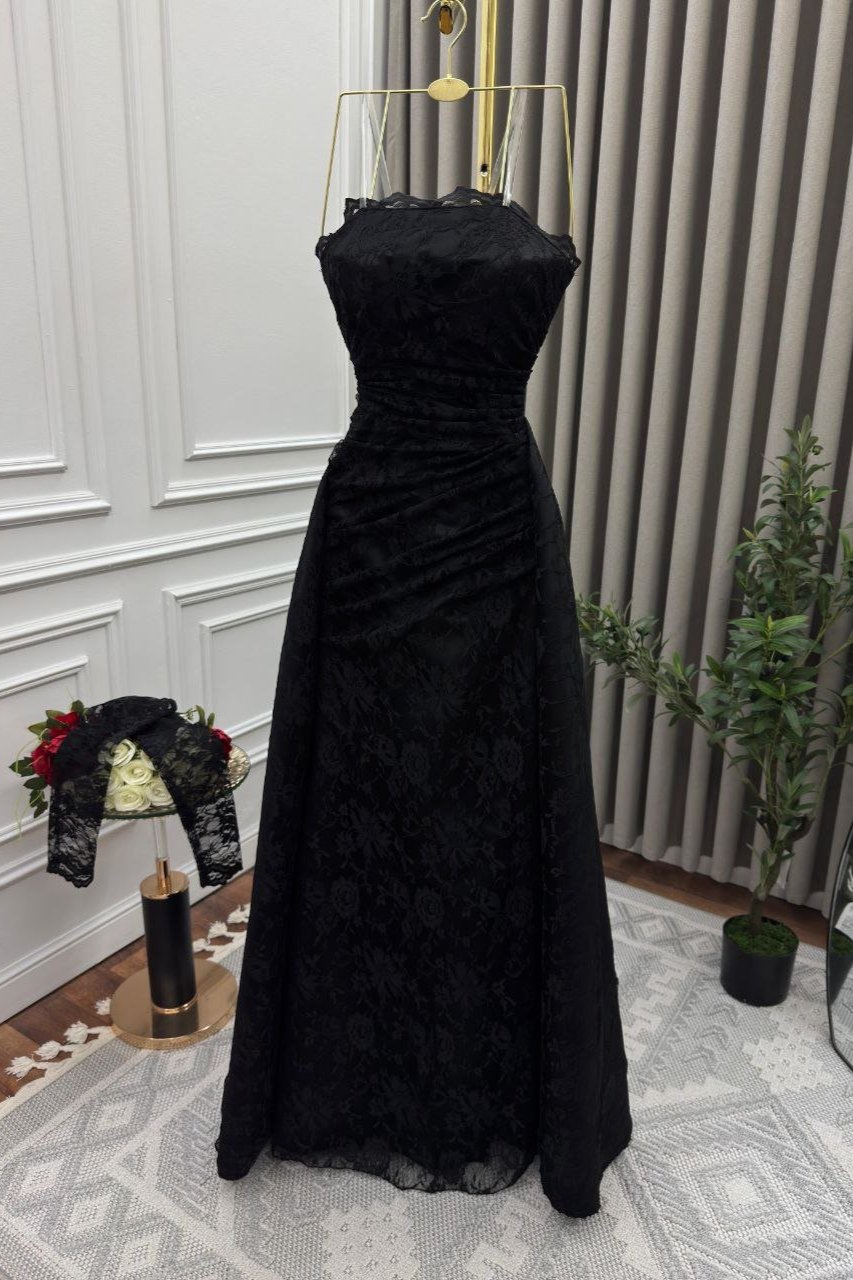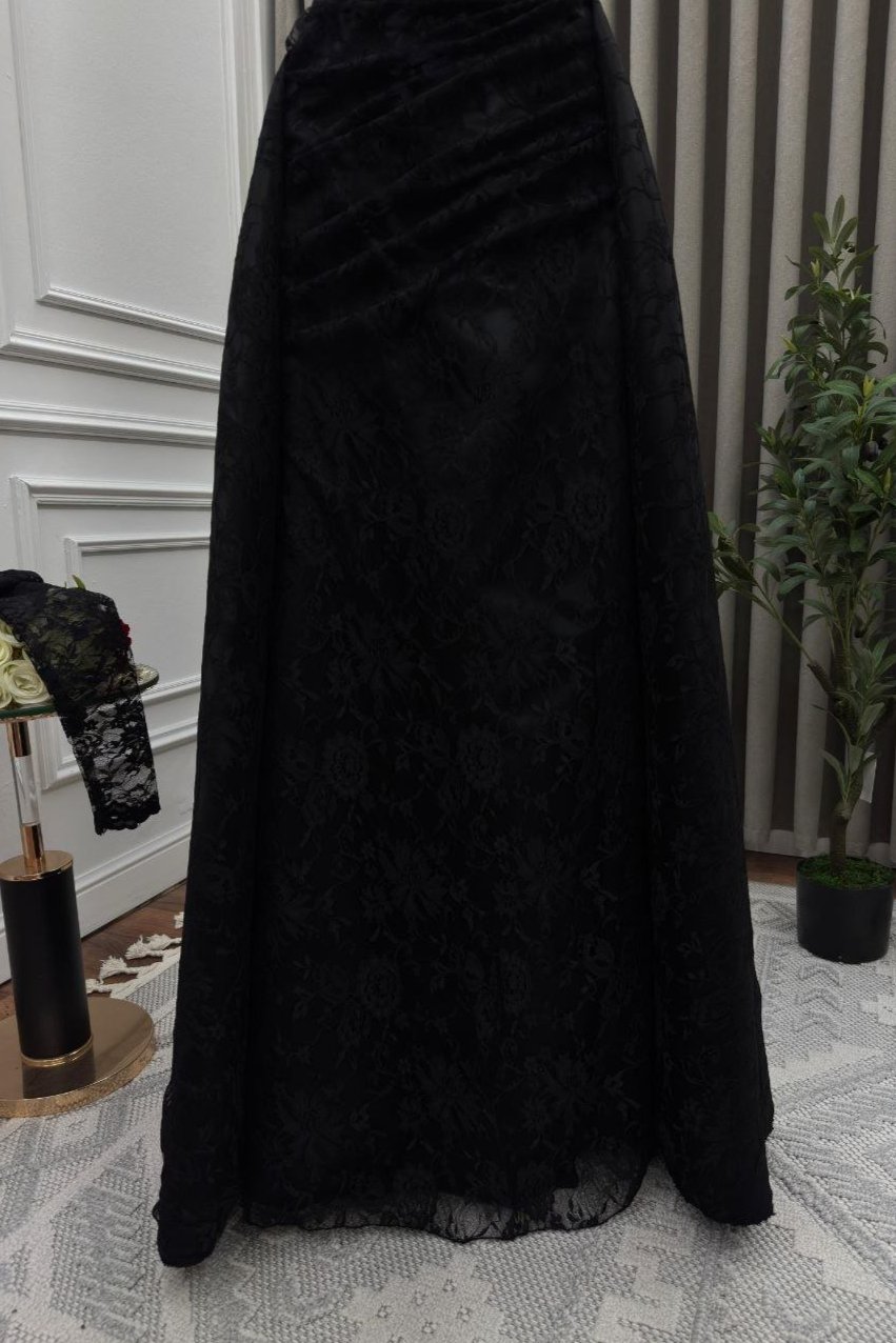 فستان سهرة دانتيل أسود مع فتحة جانبية