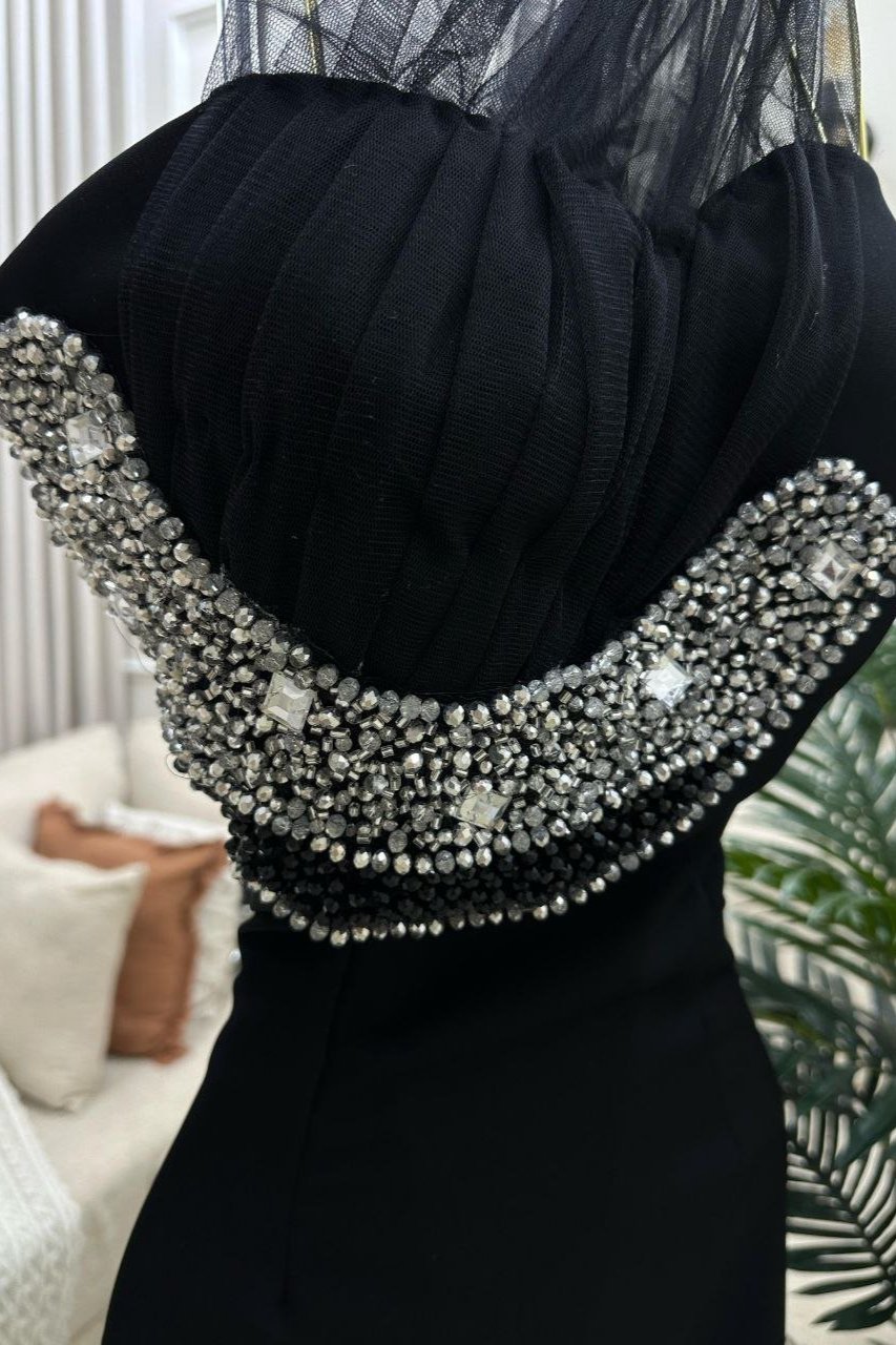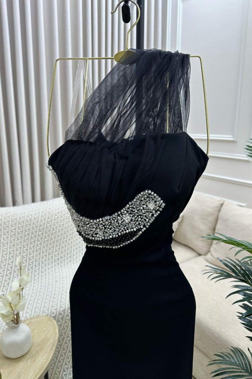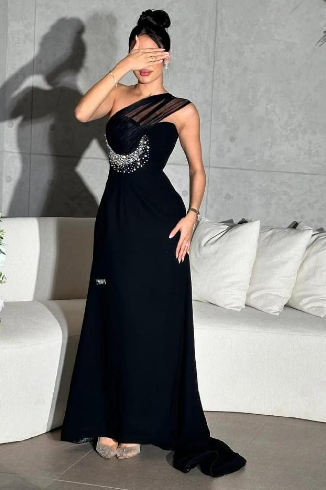 فستان سهرة أنيق باللون الأسود، مصمم بكتف واحد شفاف يضيف لمسة فريدة للإطلالة. يتميز بتطريز فاخر على الصدر يعكس الفخامة،