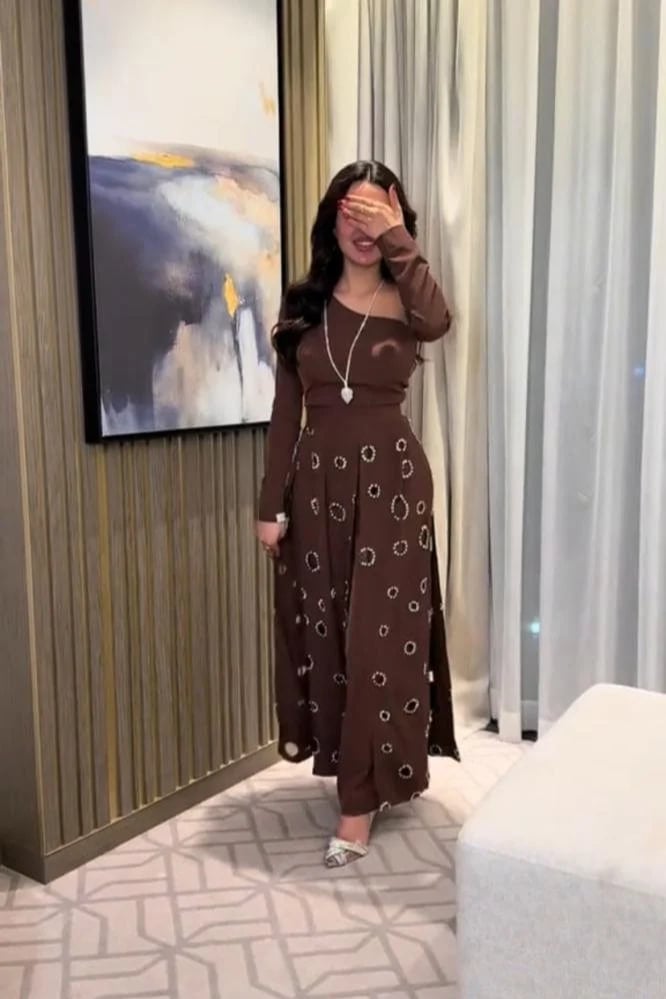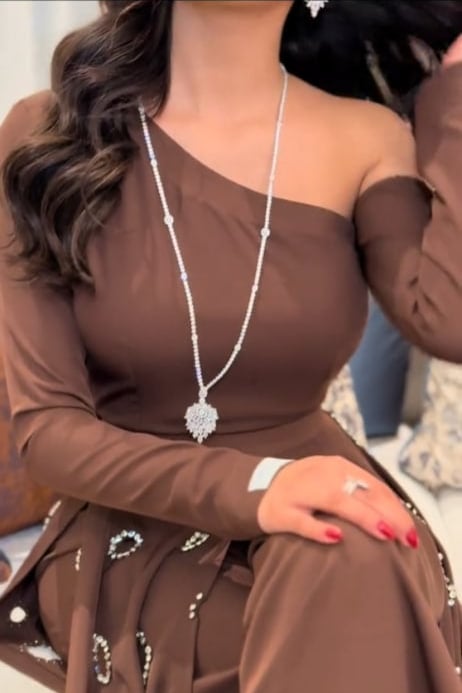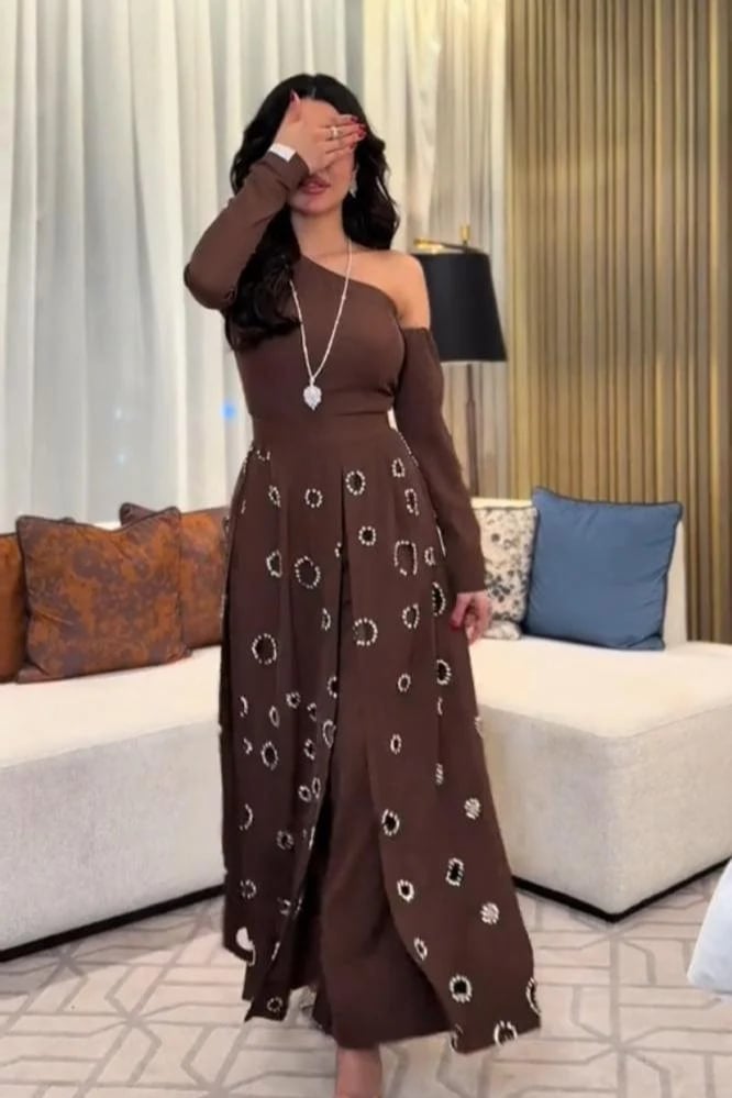 جمبسوت بني طويل أوف شولدر مطرز بكريستال