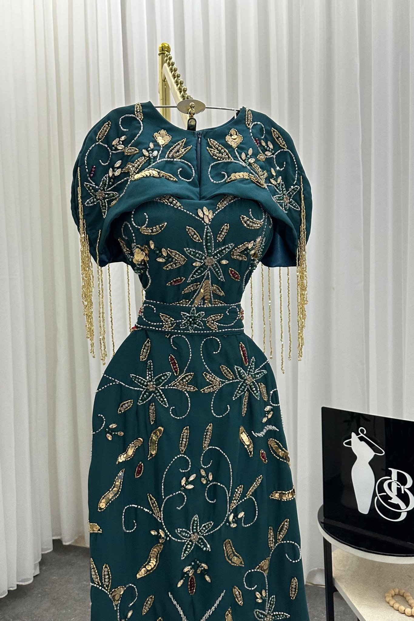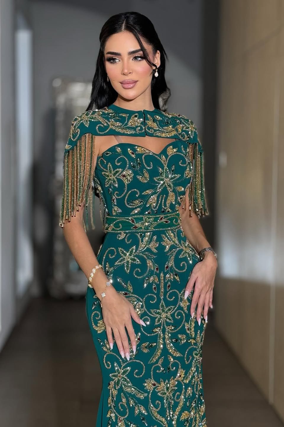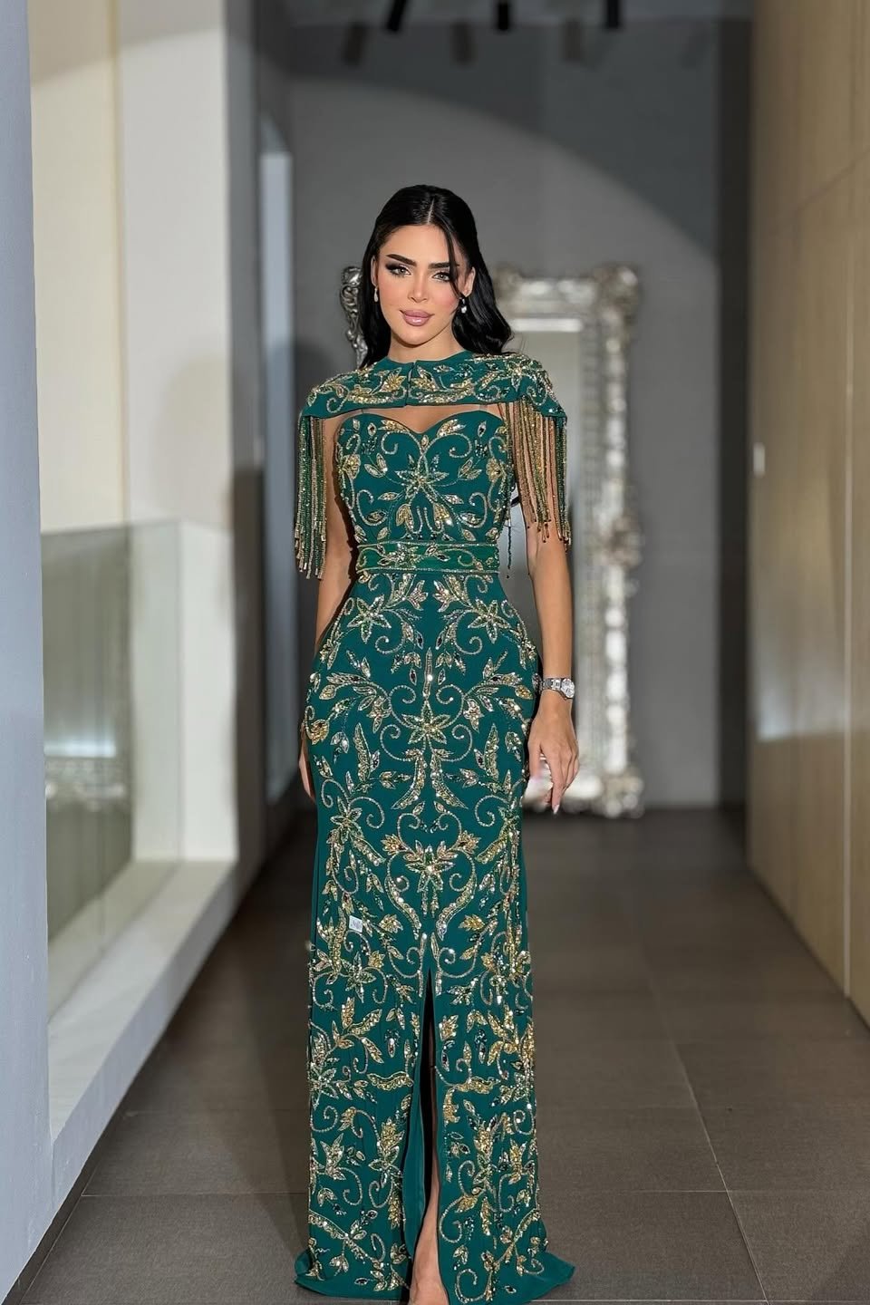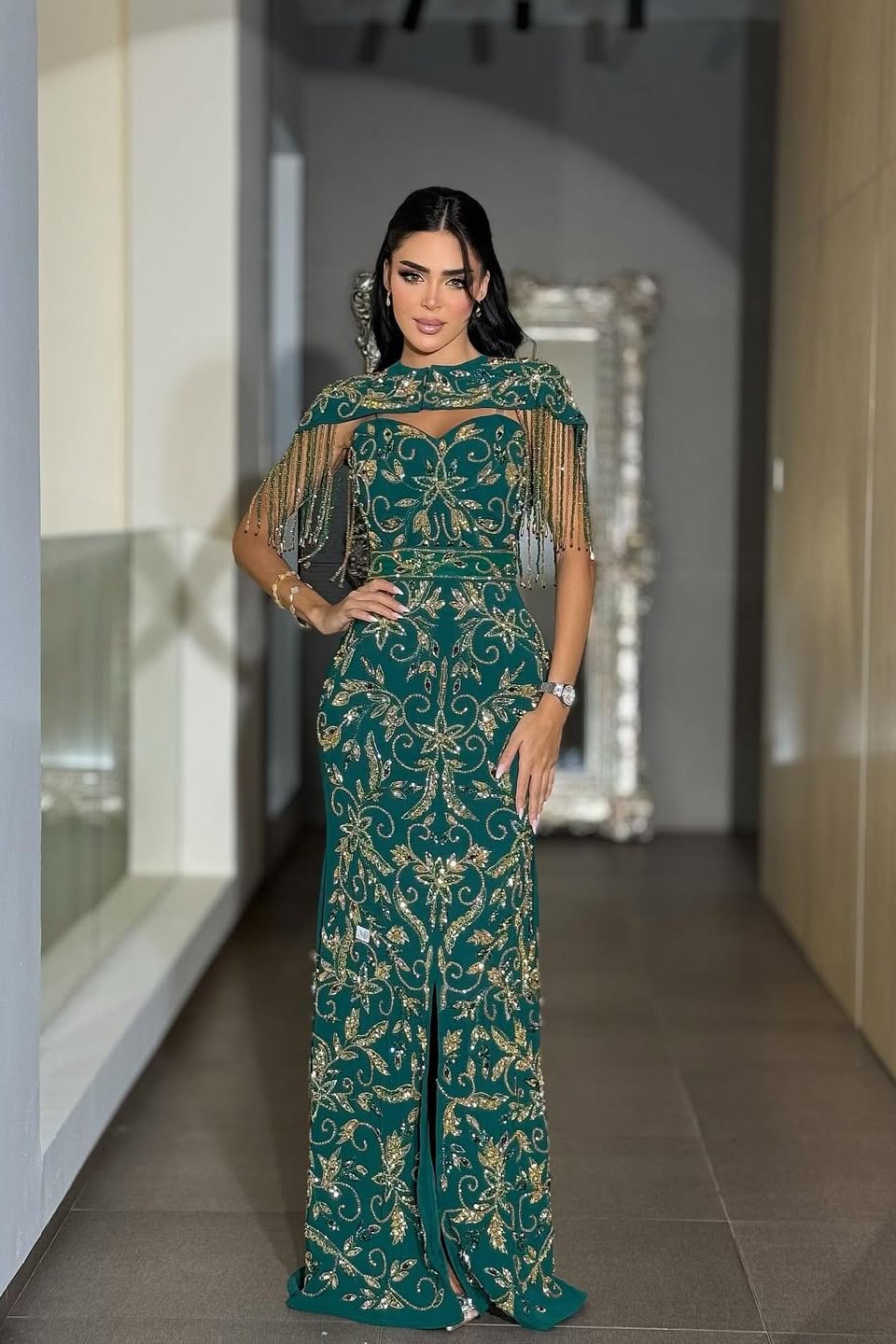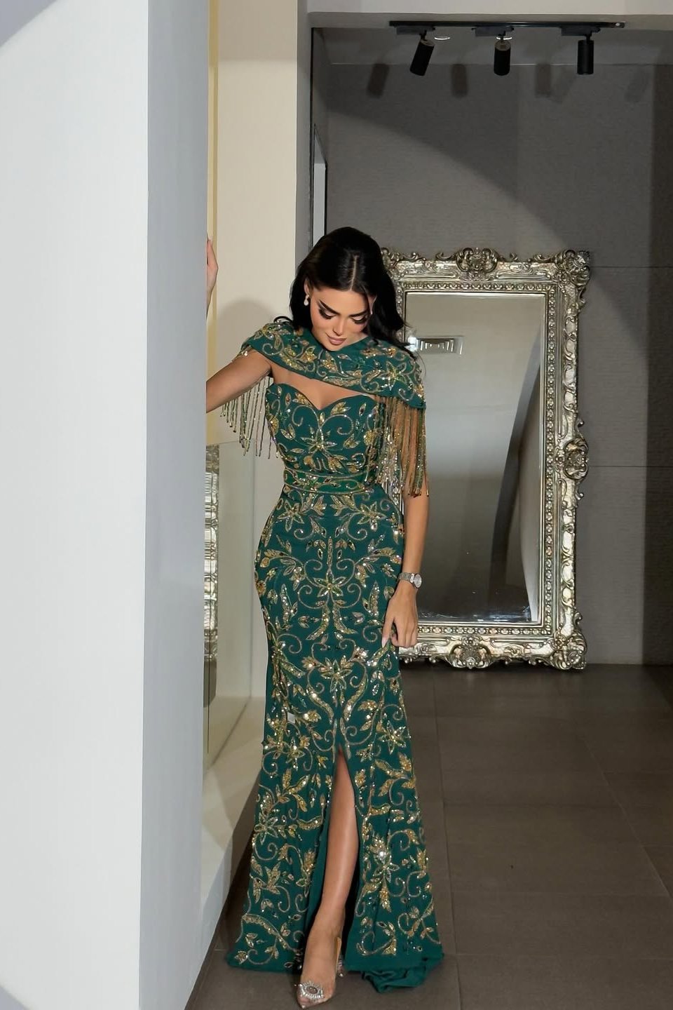 فستان سهرة أخضر زمردي مطرز بالذهبي مع لمسات متدلية أنيقة على الأكتاف