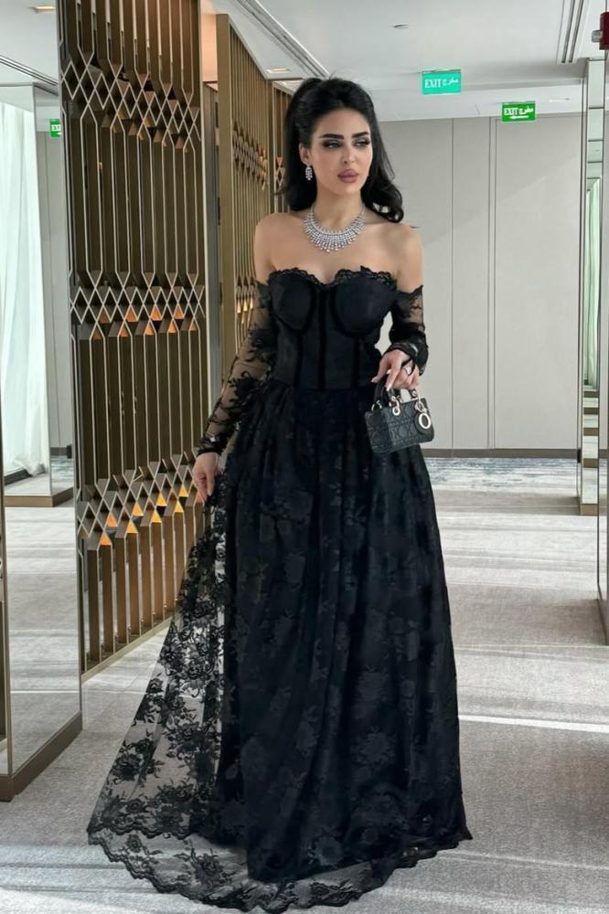 فستان أنيق باللون الأسود مصمم بقصة أنثوية راقية مع تفاصيل الدانتيل الفاخرة التي تغطي كامل التصميم. يتميز بفتحة صدر جذابة وأكمام شفافة تضيف لمسة من الغموض والرقي. القصة الطويلة مع انسدال فخم تجعله خيارًا مثالياً للمناسبات الخاصة والسهرات الفاخرة.