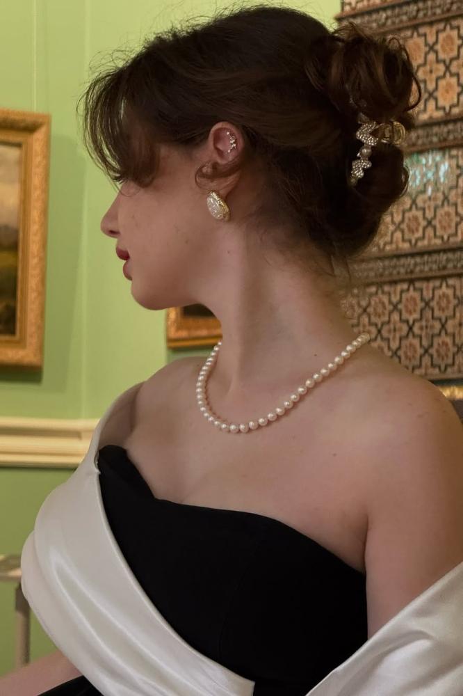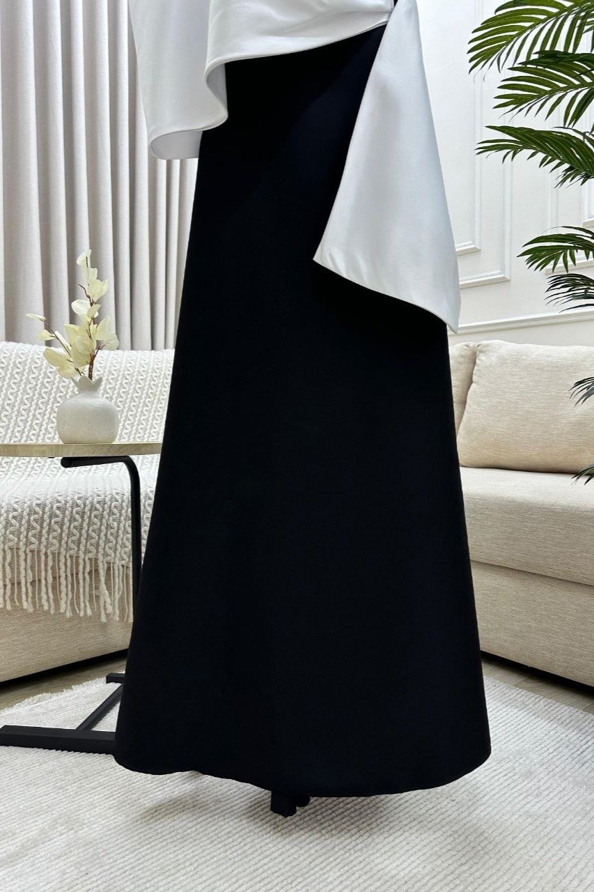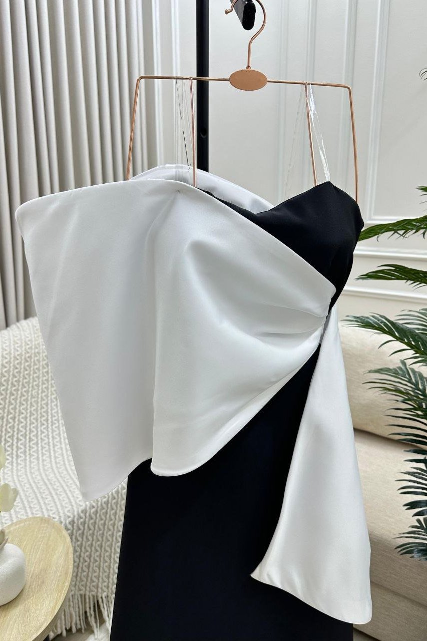 مع وشاح أبيض ملفوف حول الكتفين يضفي لمسة من الرقي والفخامة. خيار مثالي للمناسبات الرسمية والسهرات المميزة.