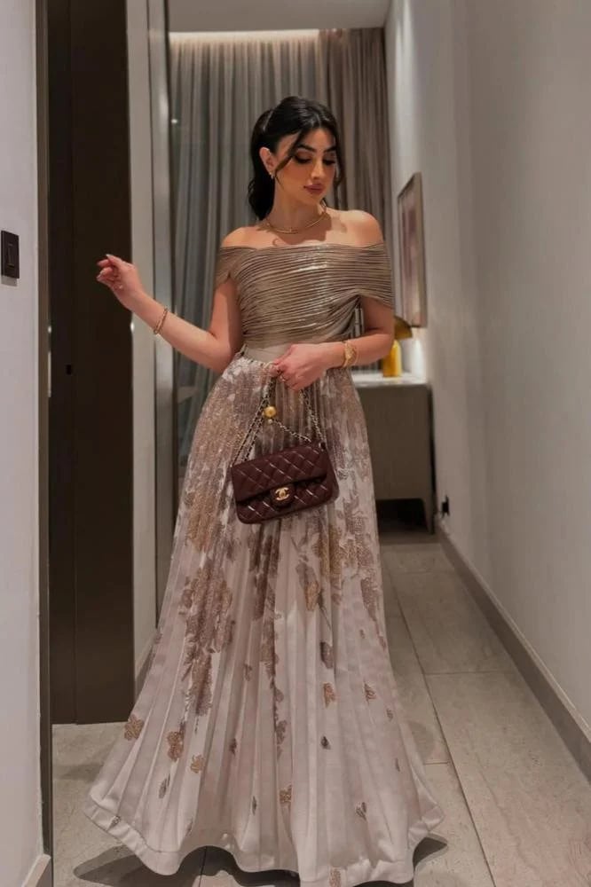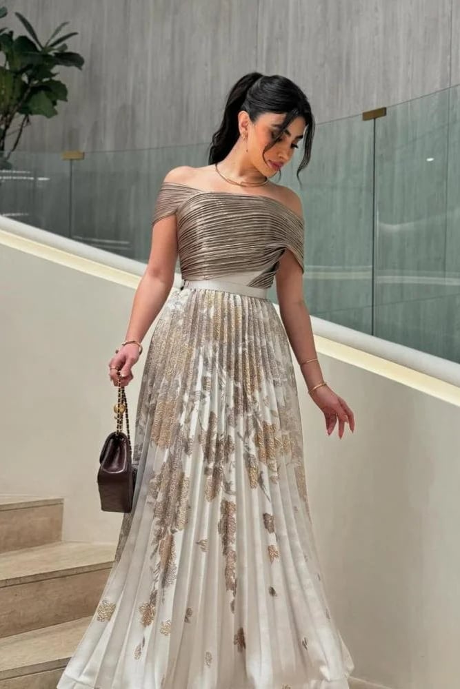 فستان سهرة أوف شولدر ذهبي وأبيض مطرز بنقوش فاخرة