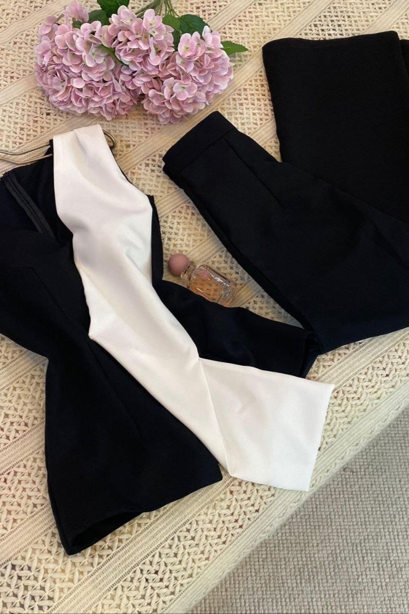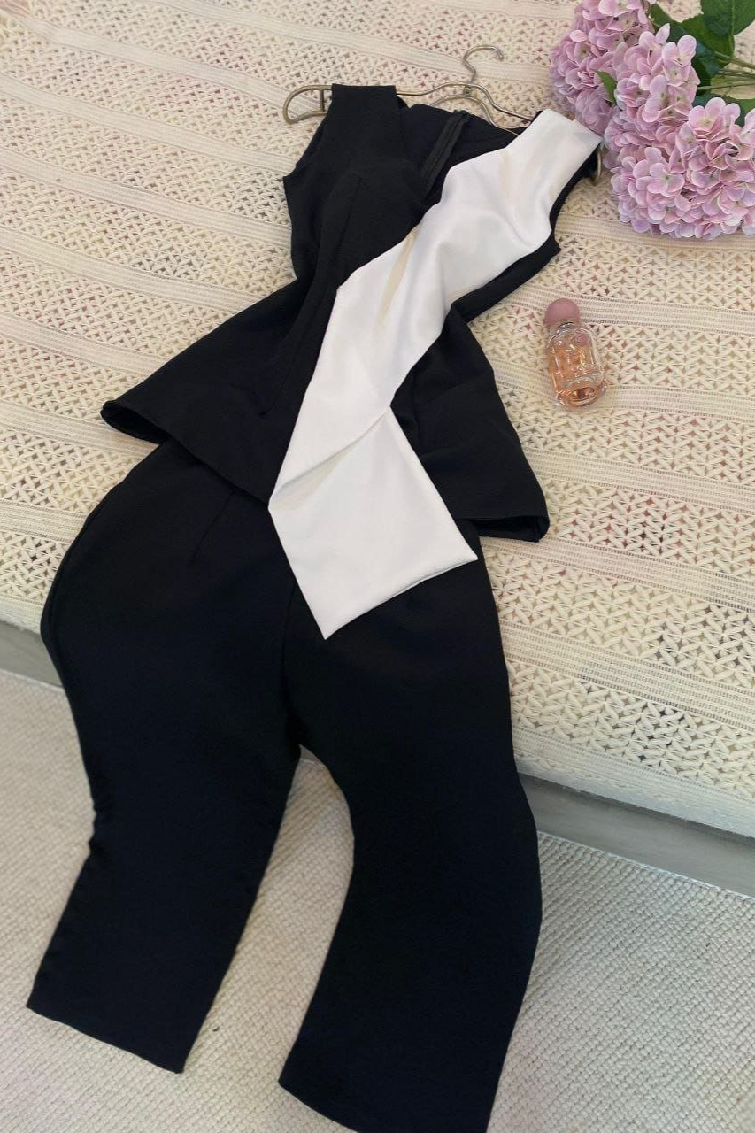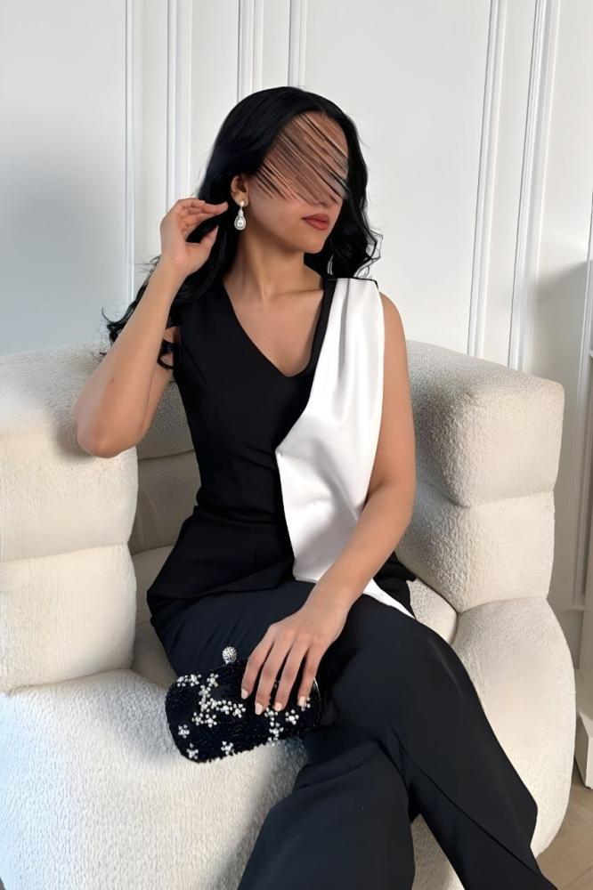 جمبسوت أنيق بقصة كلاسيكية مميزة، يتميز بتصميم بدون أكمام وياقة على شكل V، مع تفاصيل جريئة بلون متباين على الصدر لإضفاء لمسة عصرية. خيار مثالي للسهرات والمناسبات الرسمية.خامة كريب استرتش