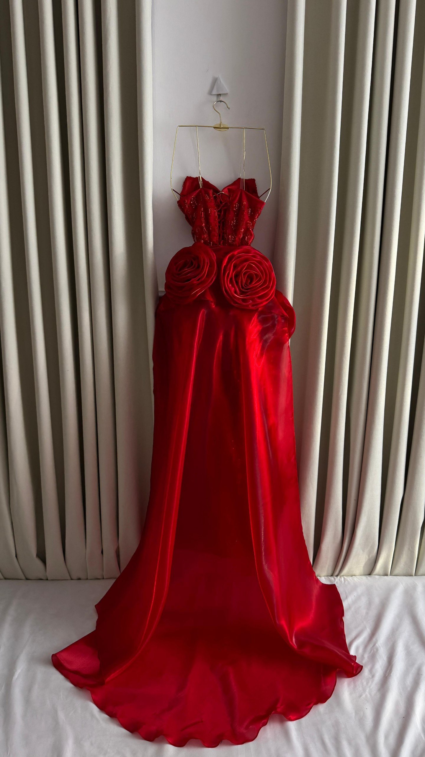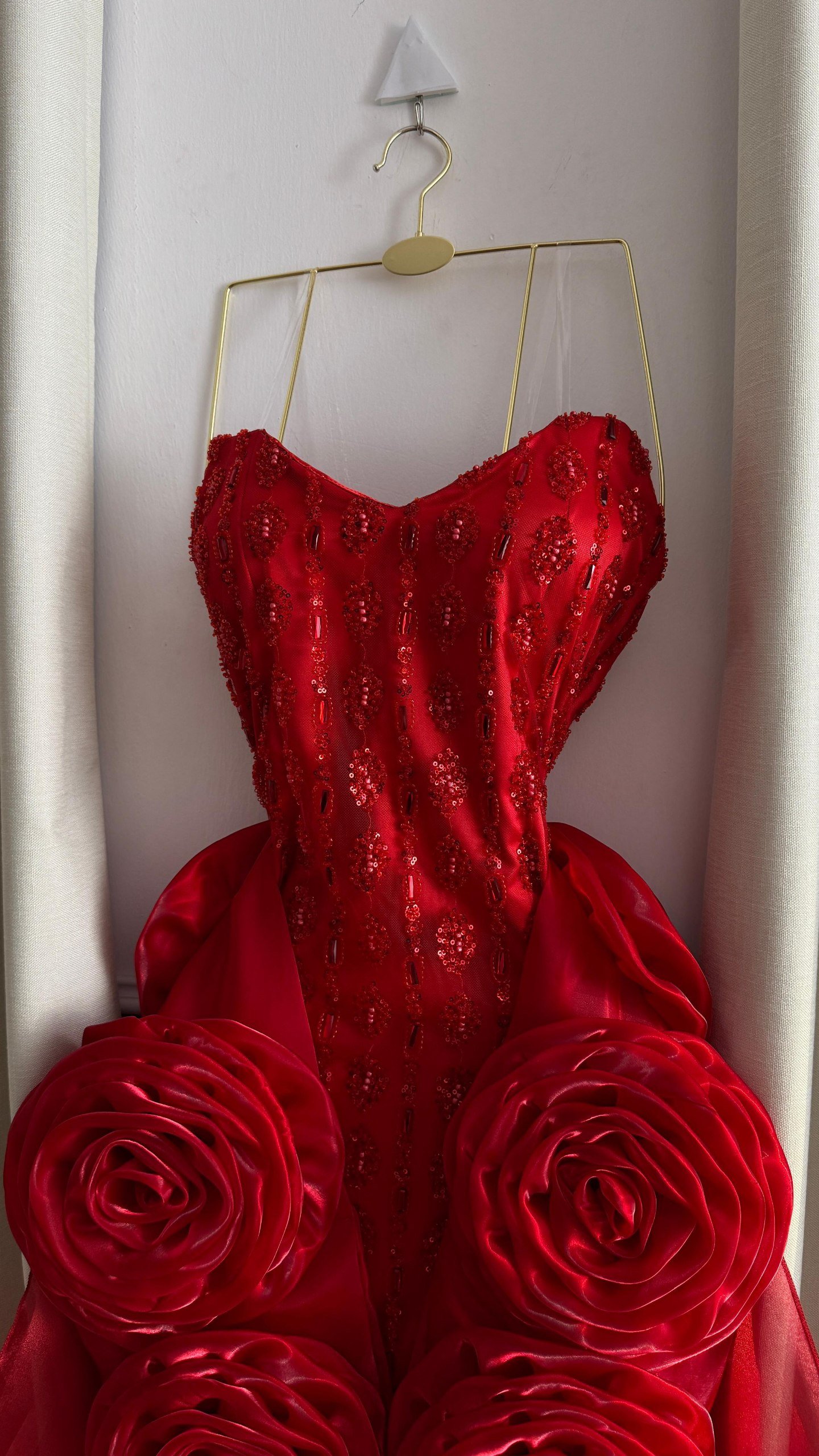 فستان سهرة أحمر مطرز بكورسيه مع كاب ورود فخم