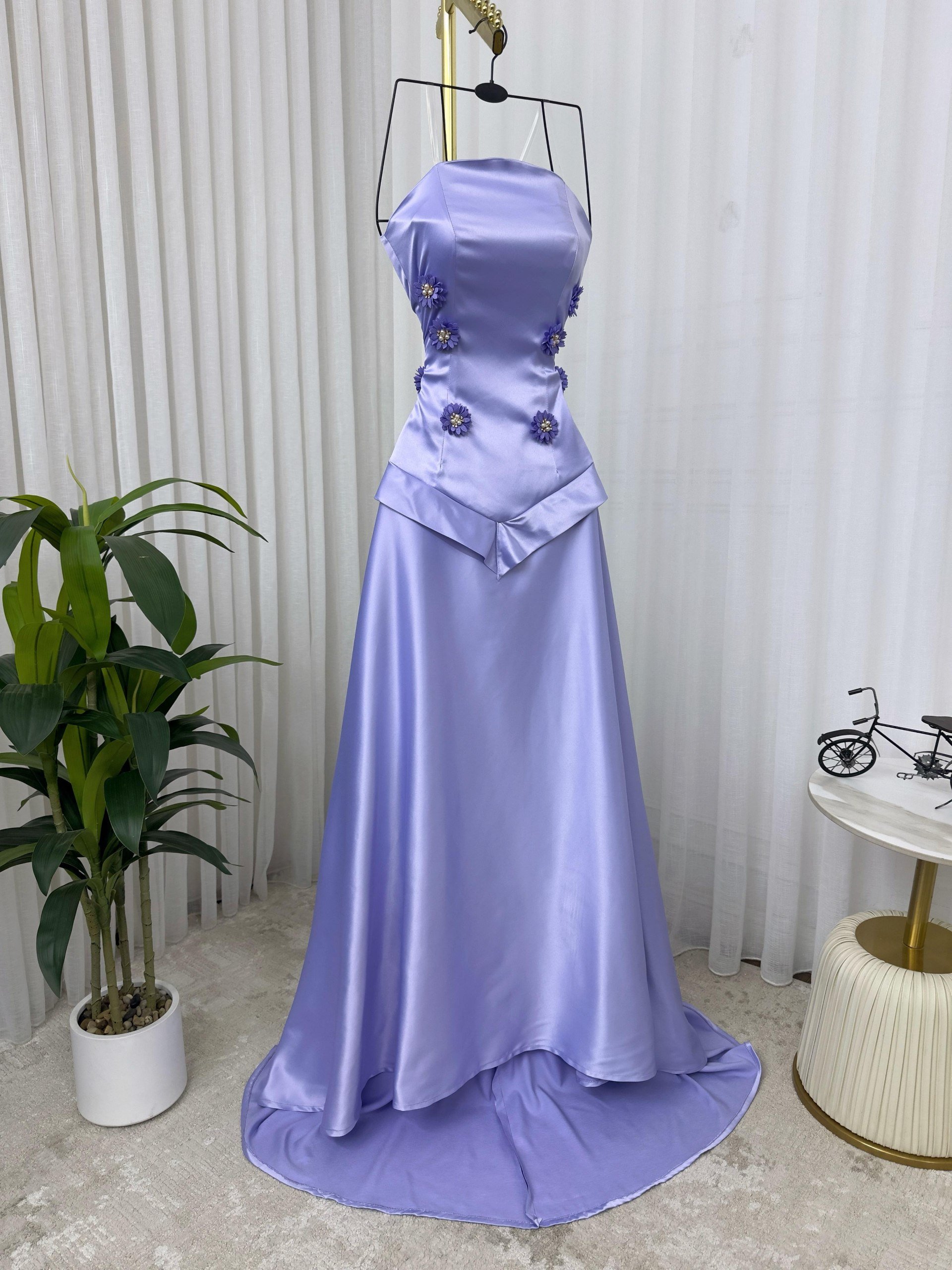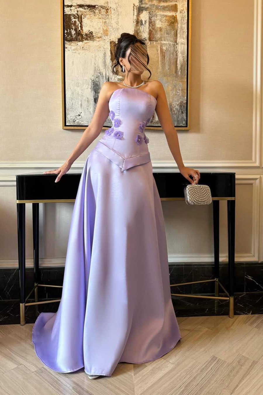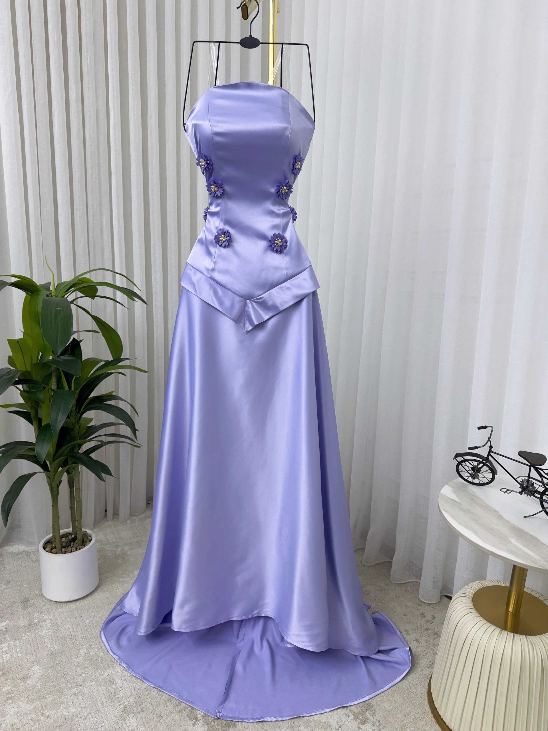 فستان سهرة بنفسجي فاتح طويل بدون أكمام مطرز بالورود