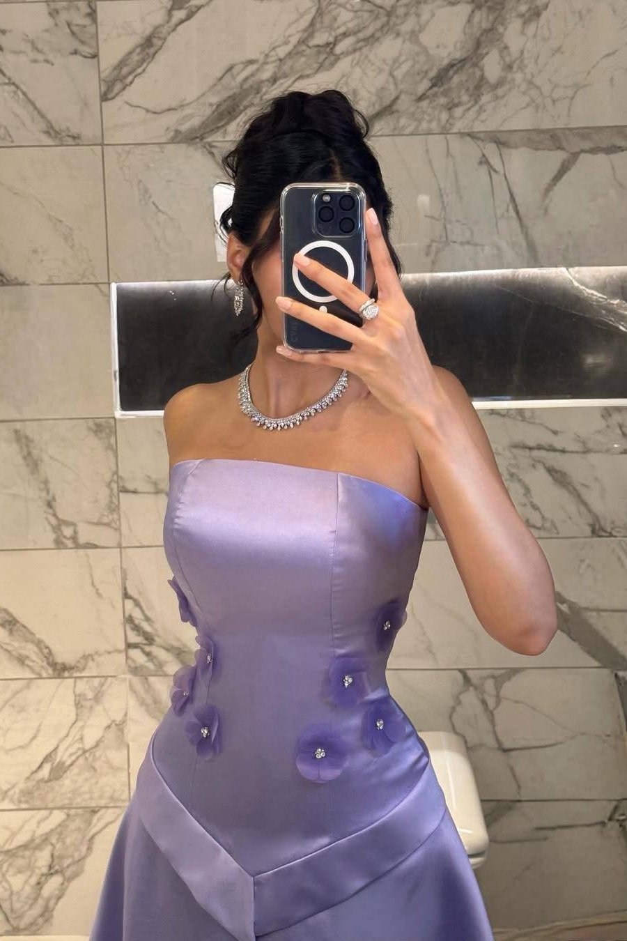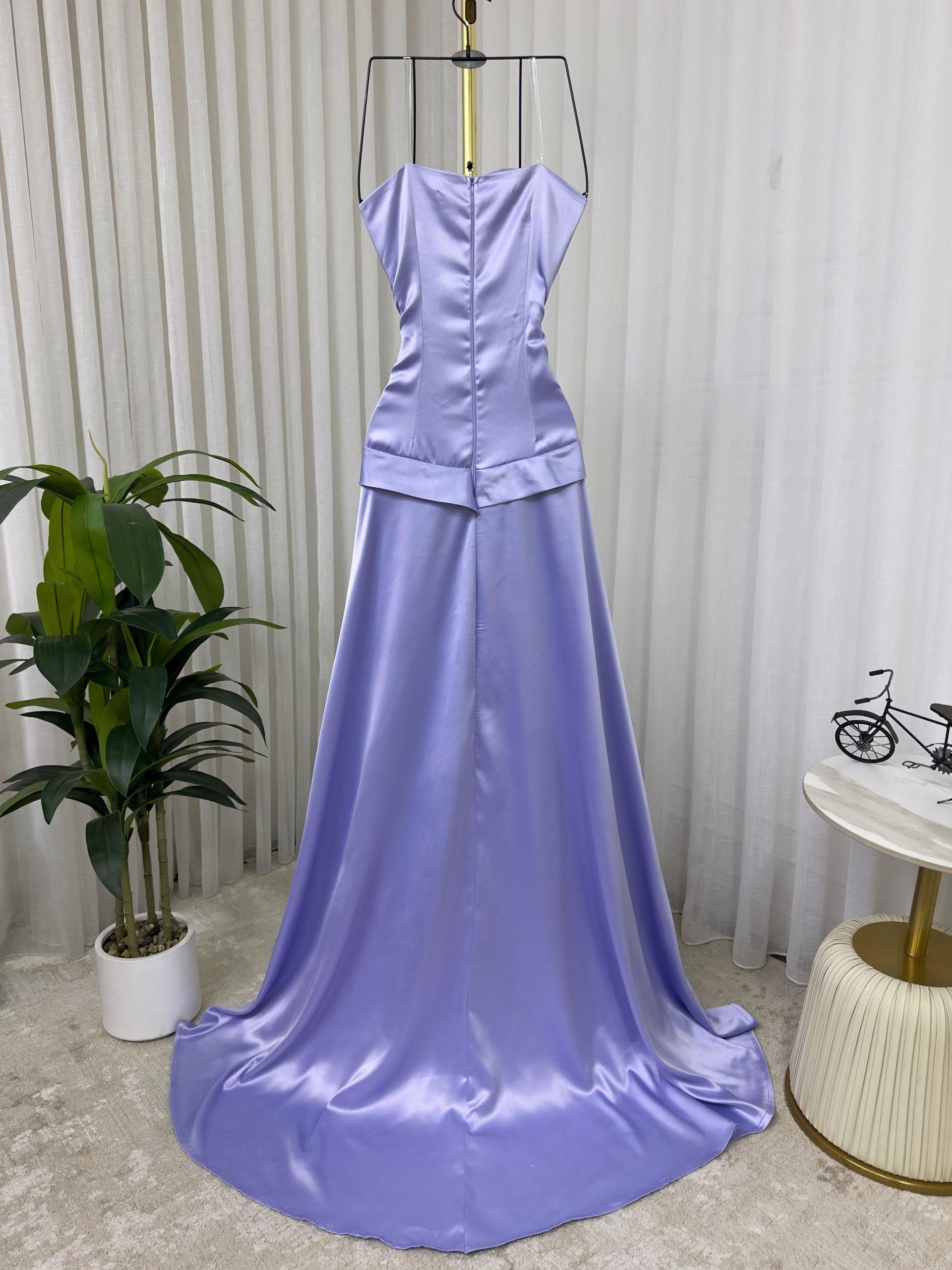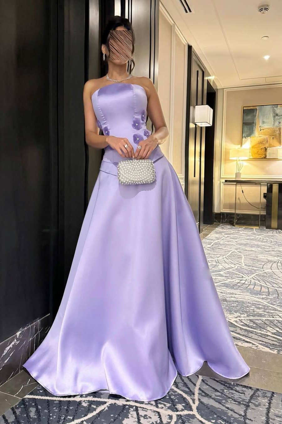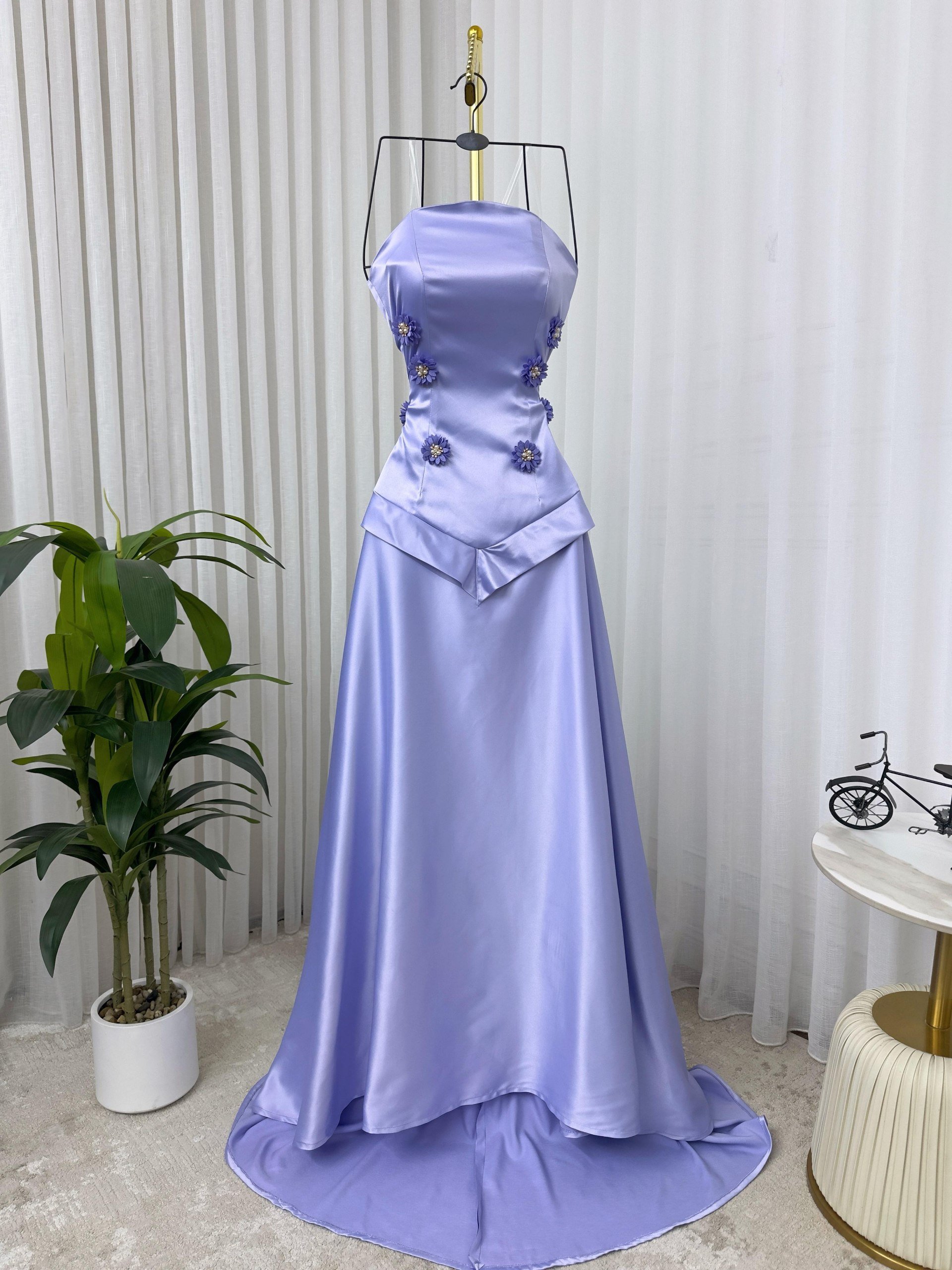 فستان سهرة بنفسجي فاتح طويل بدون أكمام مطرز بالورود