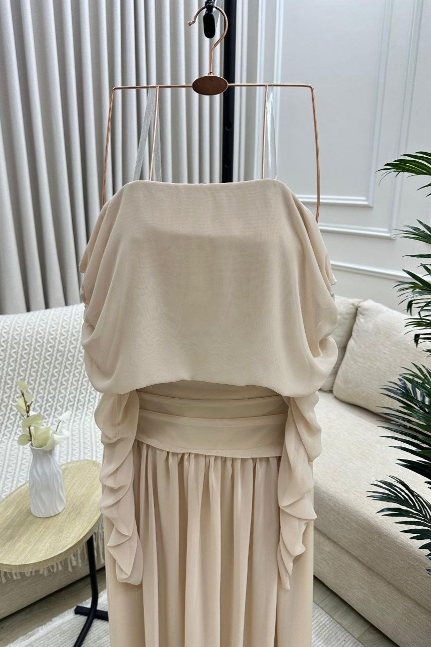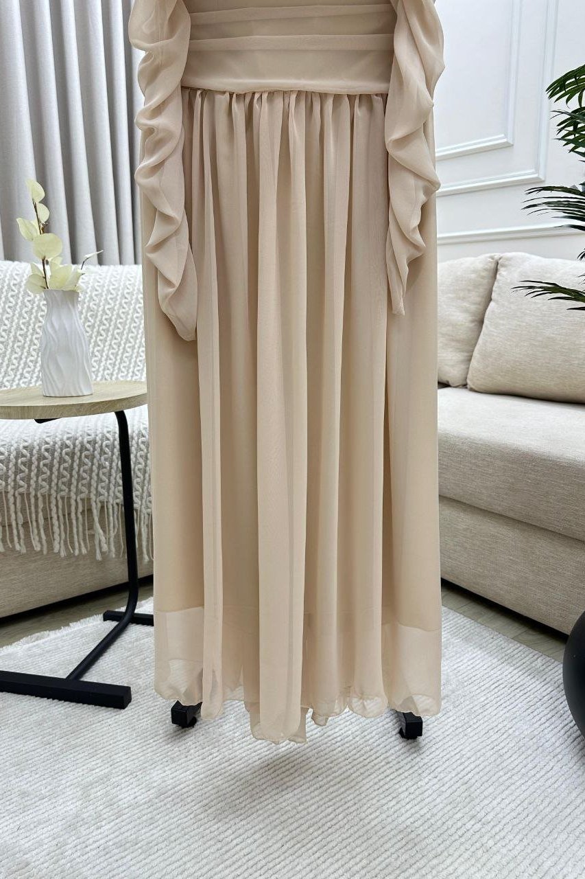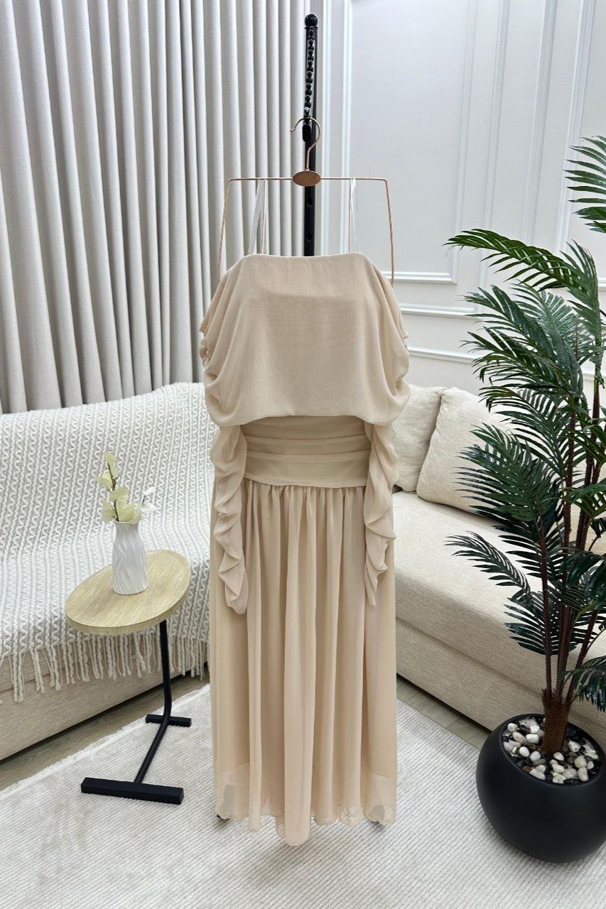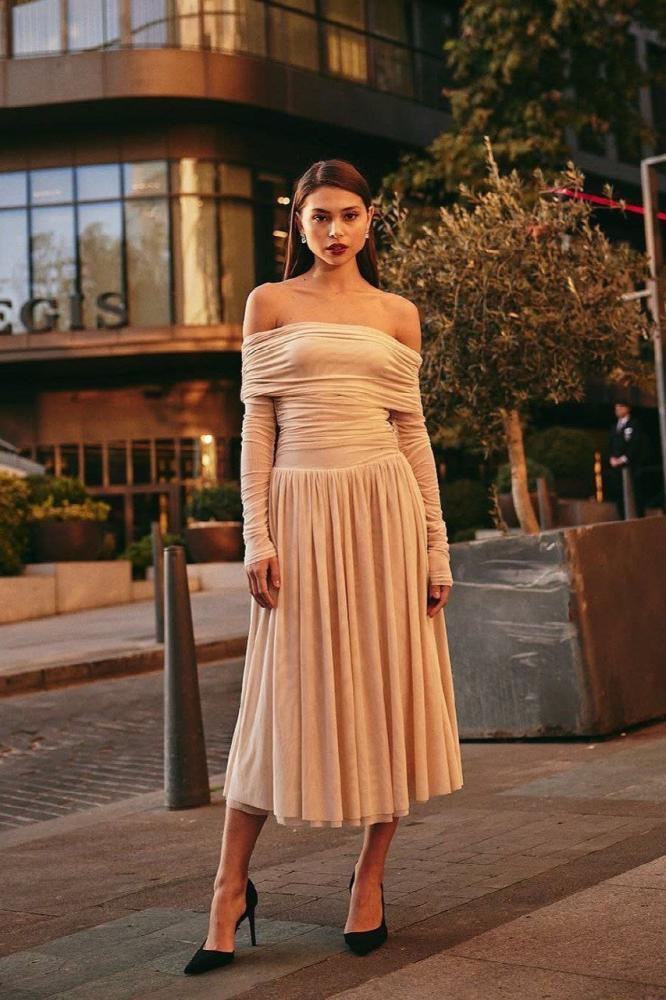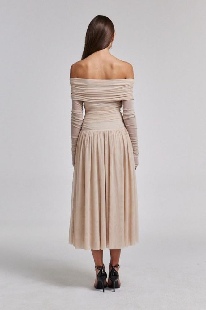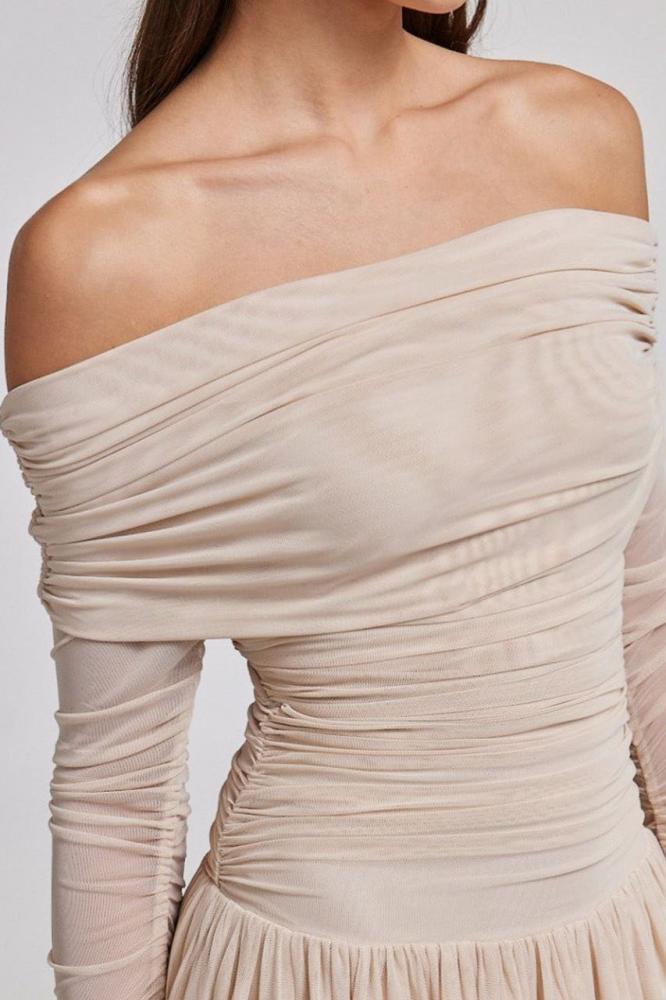 تألقي بإطلالة ساحرة مع هذا الفستان الأنيق. يتميز بقصة أوف شولدر جذابة مع أكمام طويلة يضفي لمسة فريدة من الأنوثة.