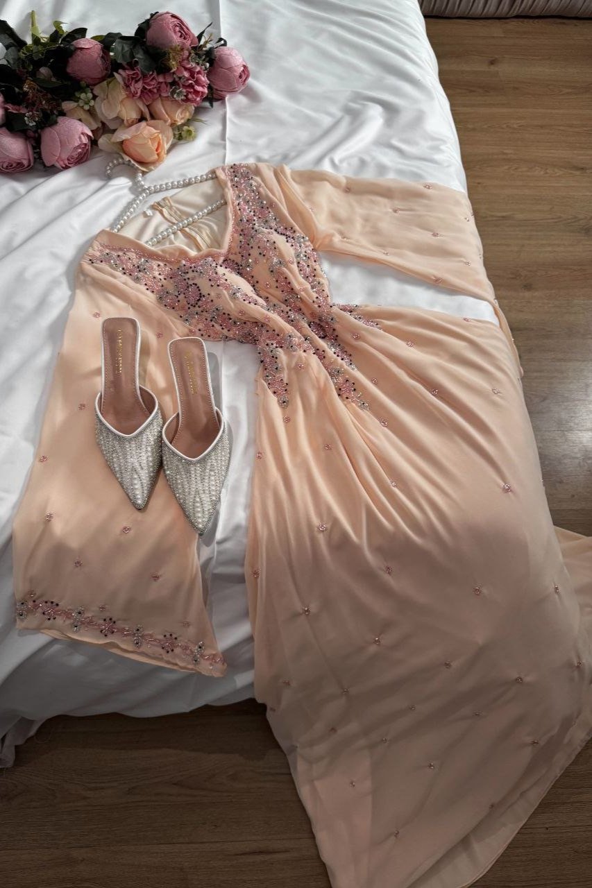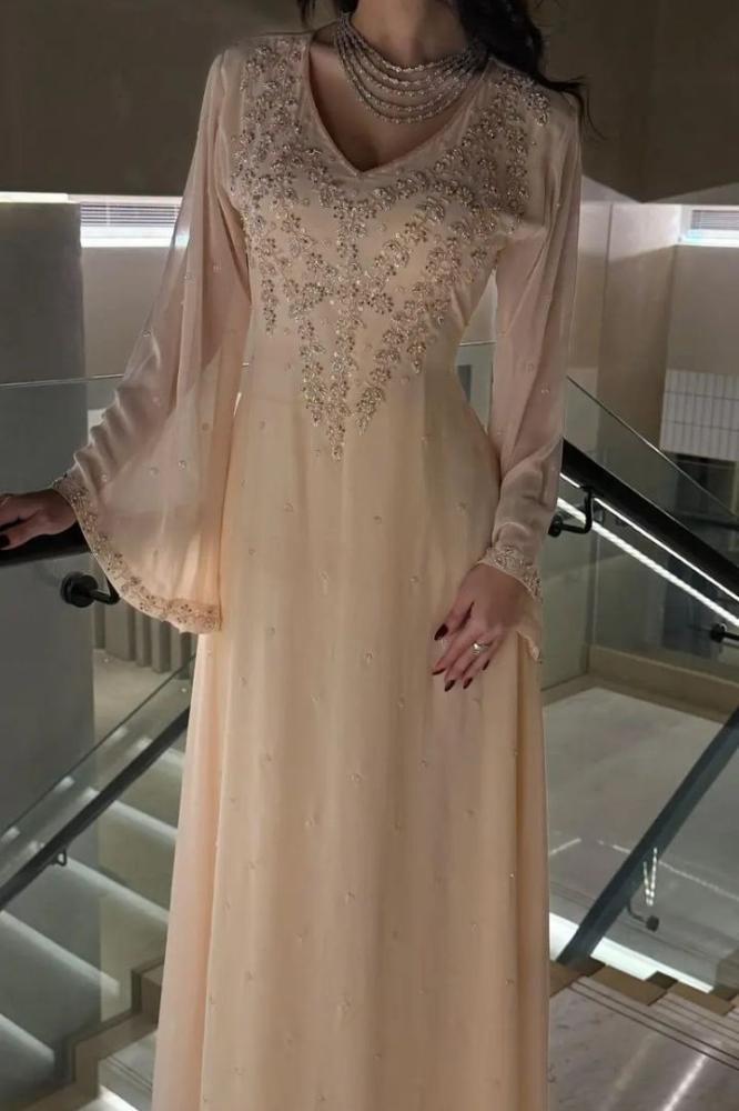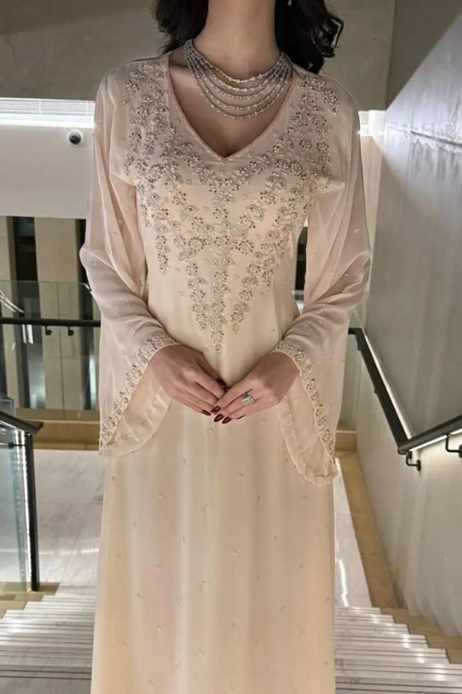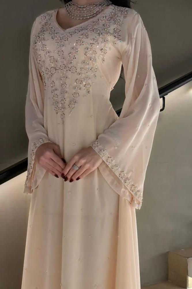 فستان ناعم طويل يتميز بتطريزات تضيف لمسة من الفخامة والرقي على التصميم. يأتي الفستان بأكمام واسعة وشفافة تضفي إحساساً بالنعومة والأنوثة، مع تفاصيل لامعة تبرز جمال القماش. يتميز بقصة انسيابية تمنحك إطلالة أنيقة ومثالية للمناسبات الخاصة والاحتفالات الراقية.