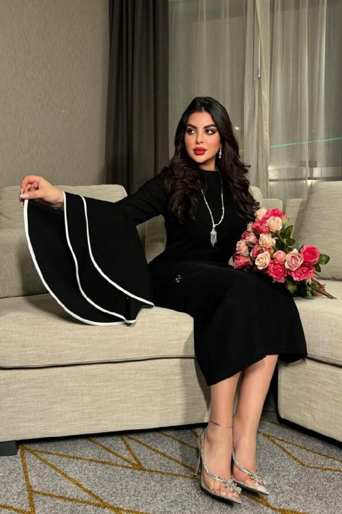 فستان سهرة أنيق باللون الأسود بتصميم راقٍ يبرز أنوثتك. يأتي بأكمام طويلة واسعة مزينة بحواف بيضاء تضيف لمسة جمالية راقية. يتميز بقصة ضيقة على الجسم تعزز من تناسق القوام، مع لمسة ناعمة تعكس الفخامة في كل تفاصيله. مناسب للمناسبات الخاصة والسهرات.