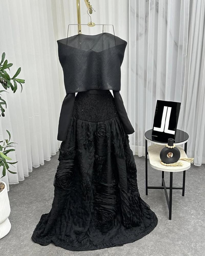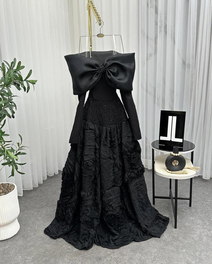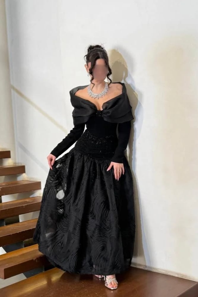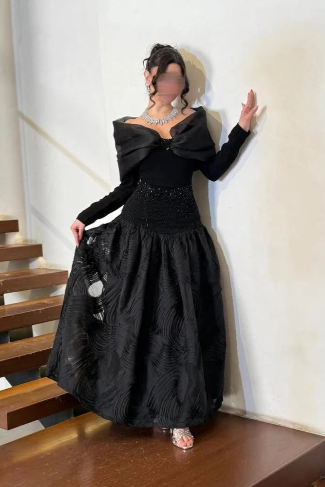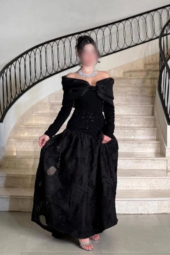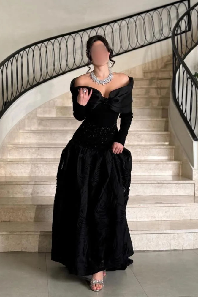 فستان سهرة أسود طويل أوف شولدر مطرز بأكمام طويلة