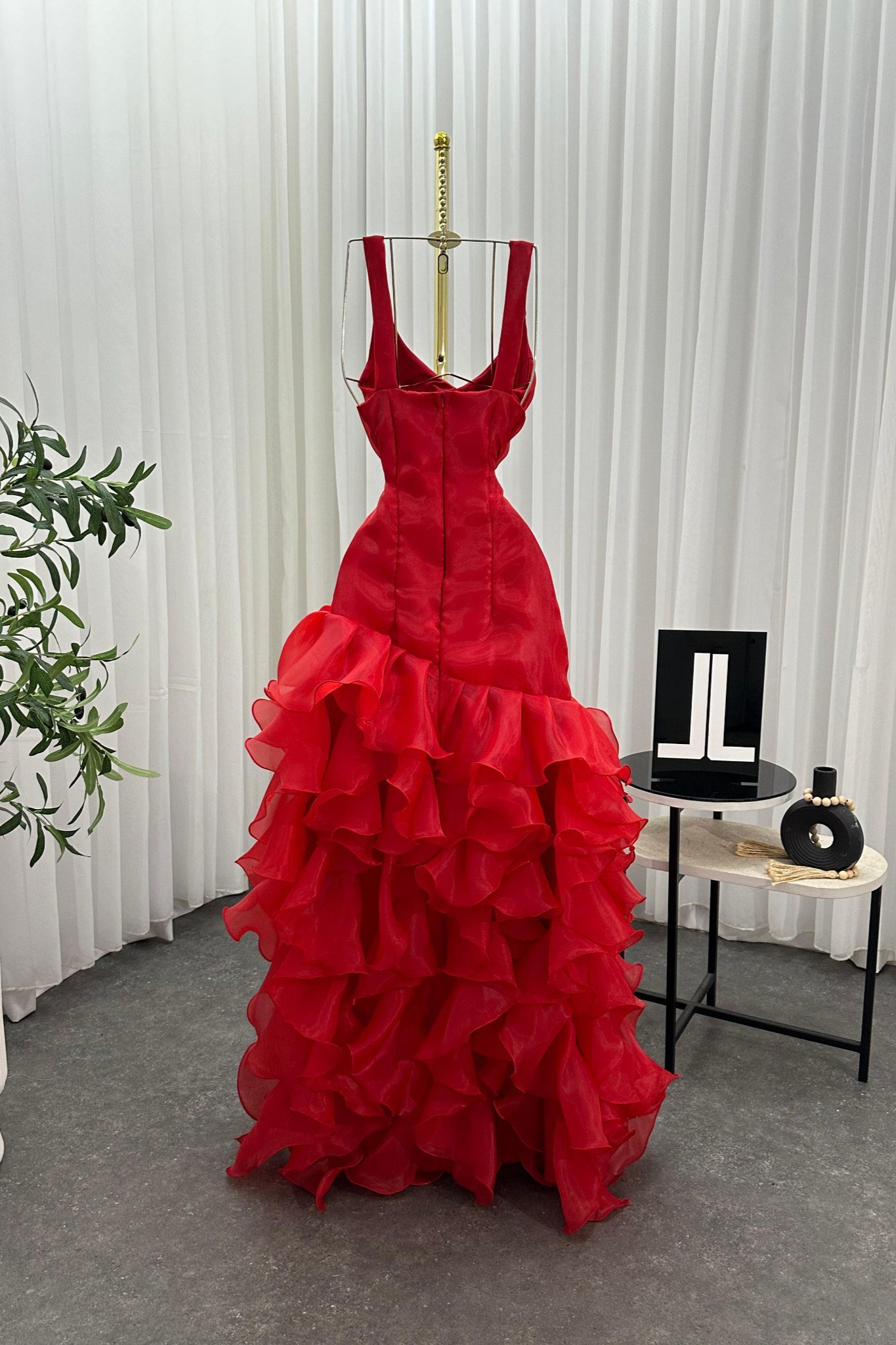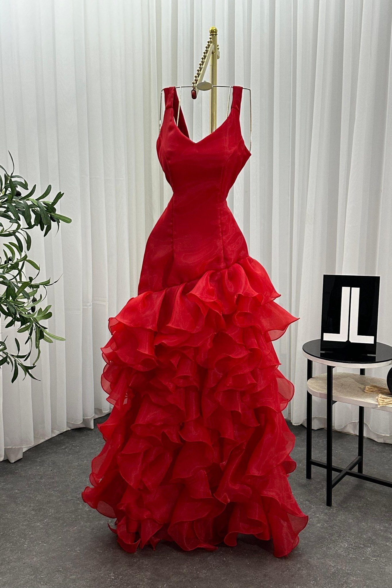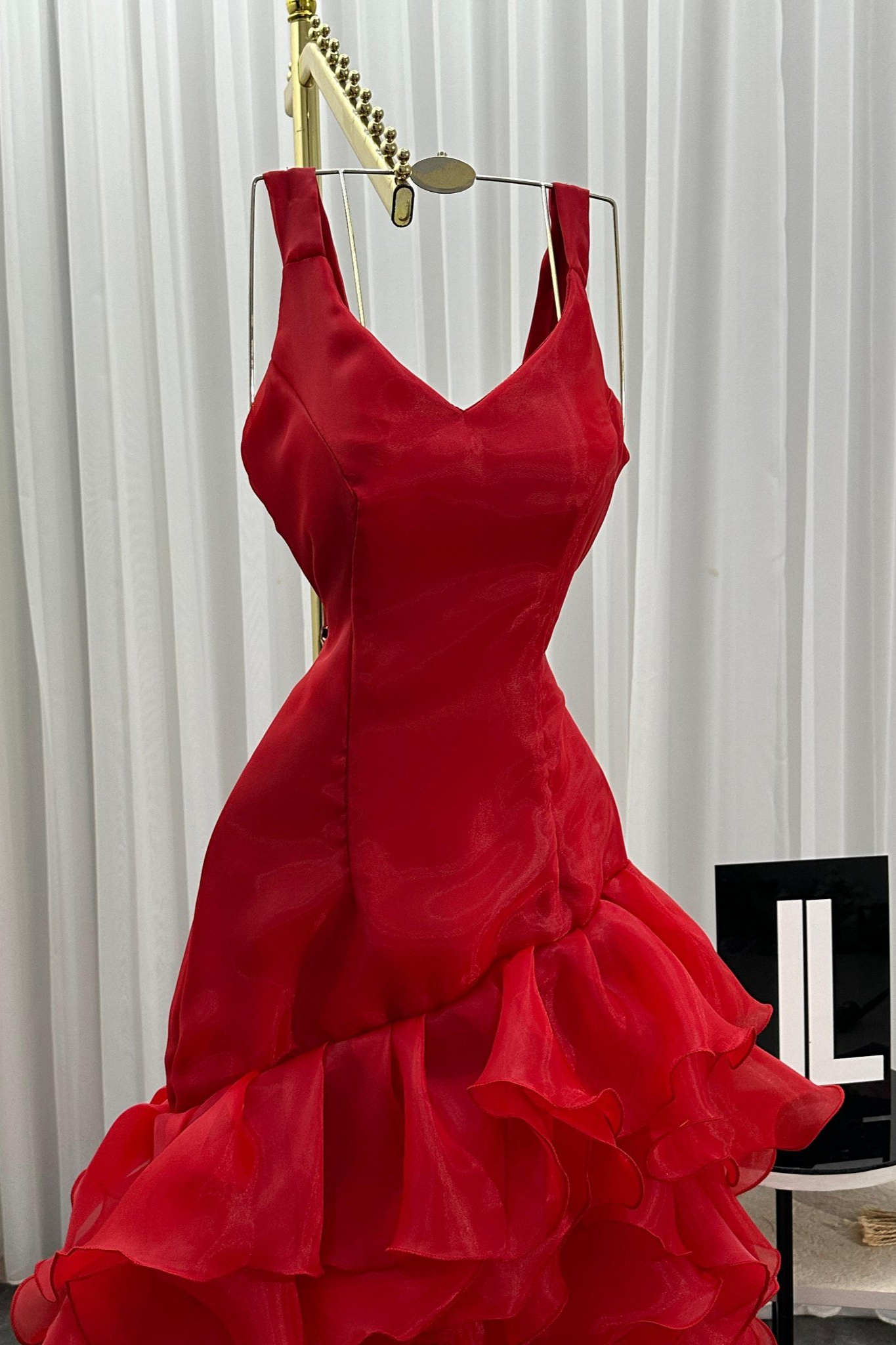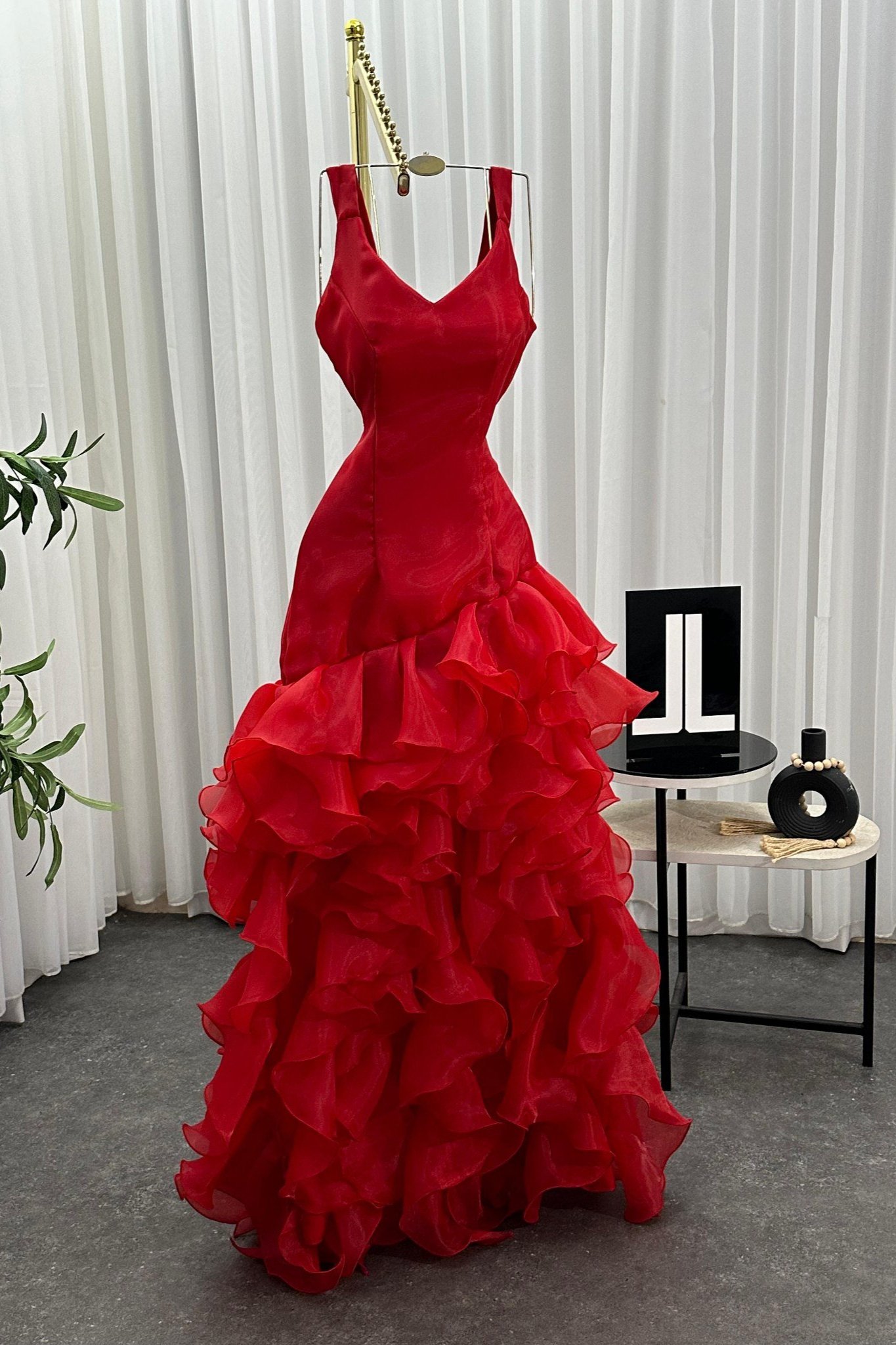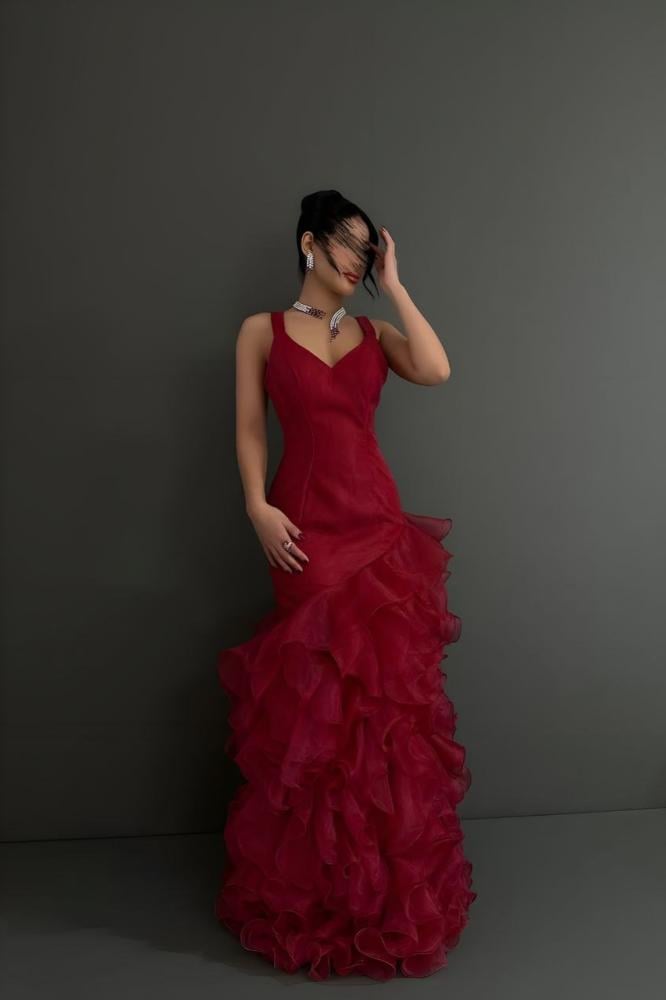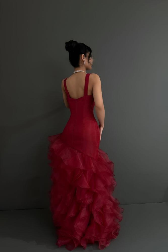 فستان سهرة احمر بتفاصيل كشكش أنيقة