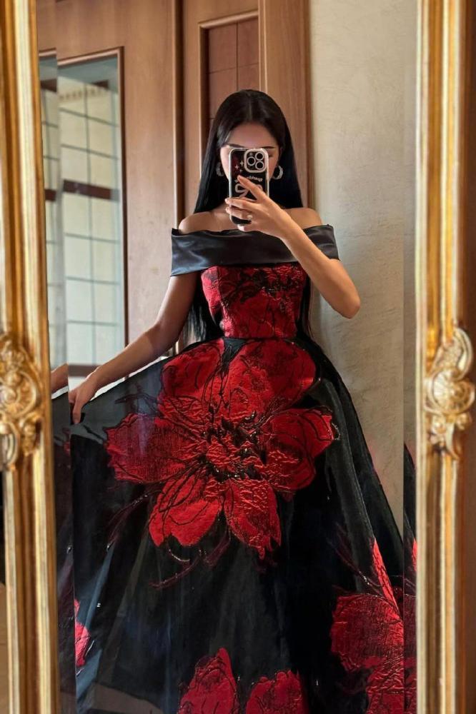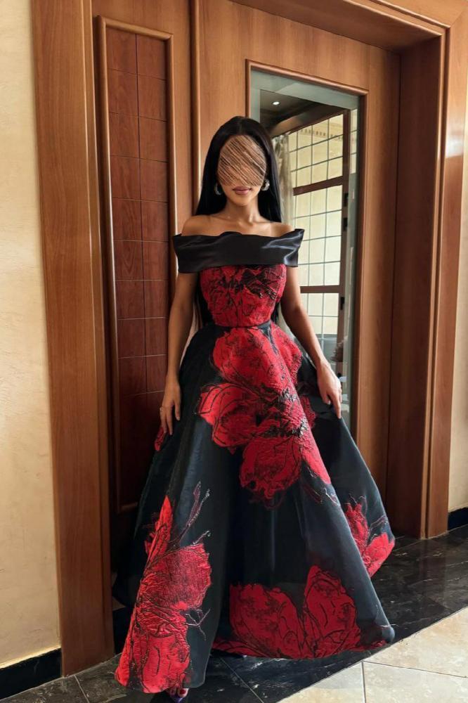 فستان اسود منفوش بتفاصيل ورود حمراء