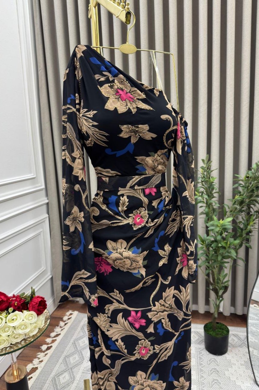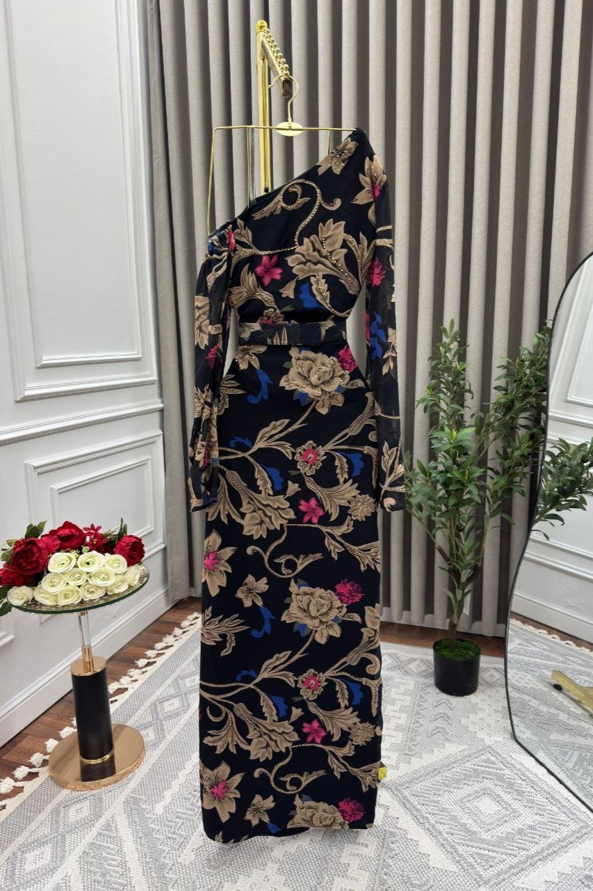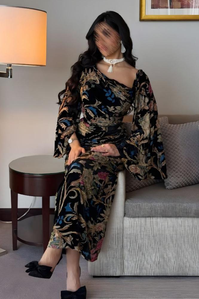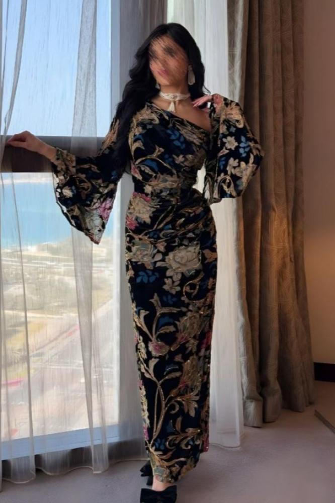 إطلالة ملكية مع هذا الفستان الفاخر، الذي يتميز بنقشات الزهور المتداخلة على خلفية داكنة لإضفاء لمسة راقية وجذابة.