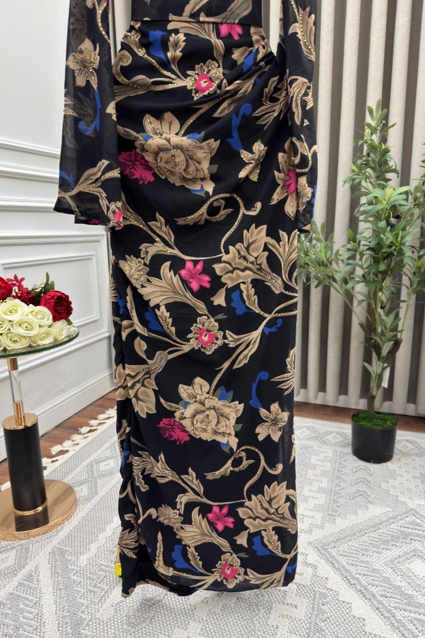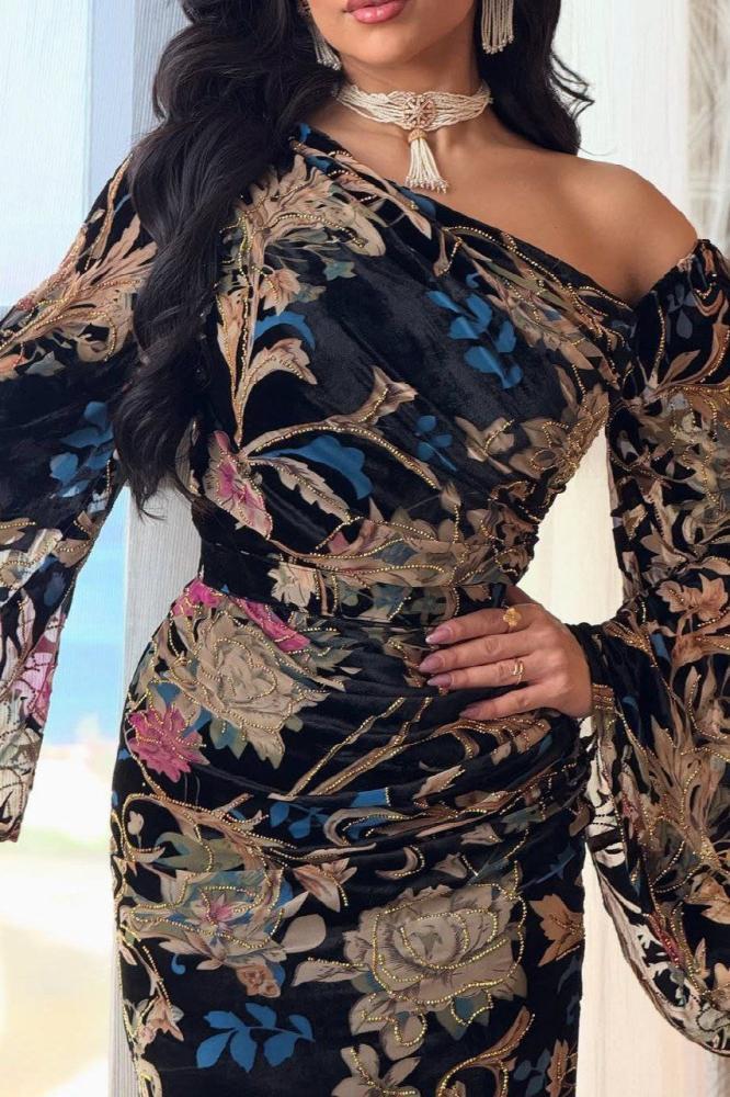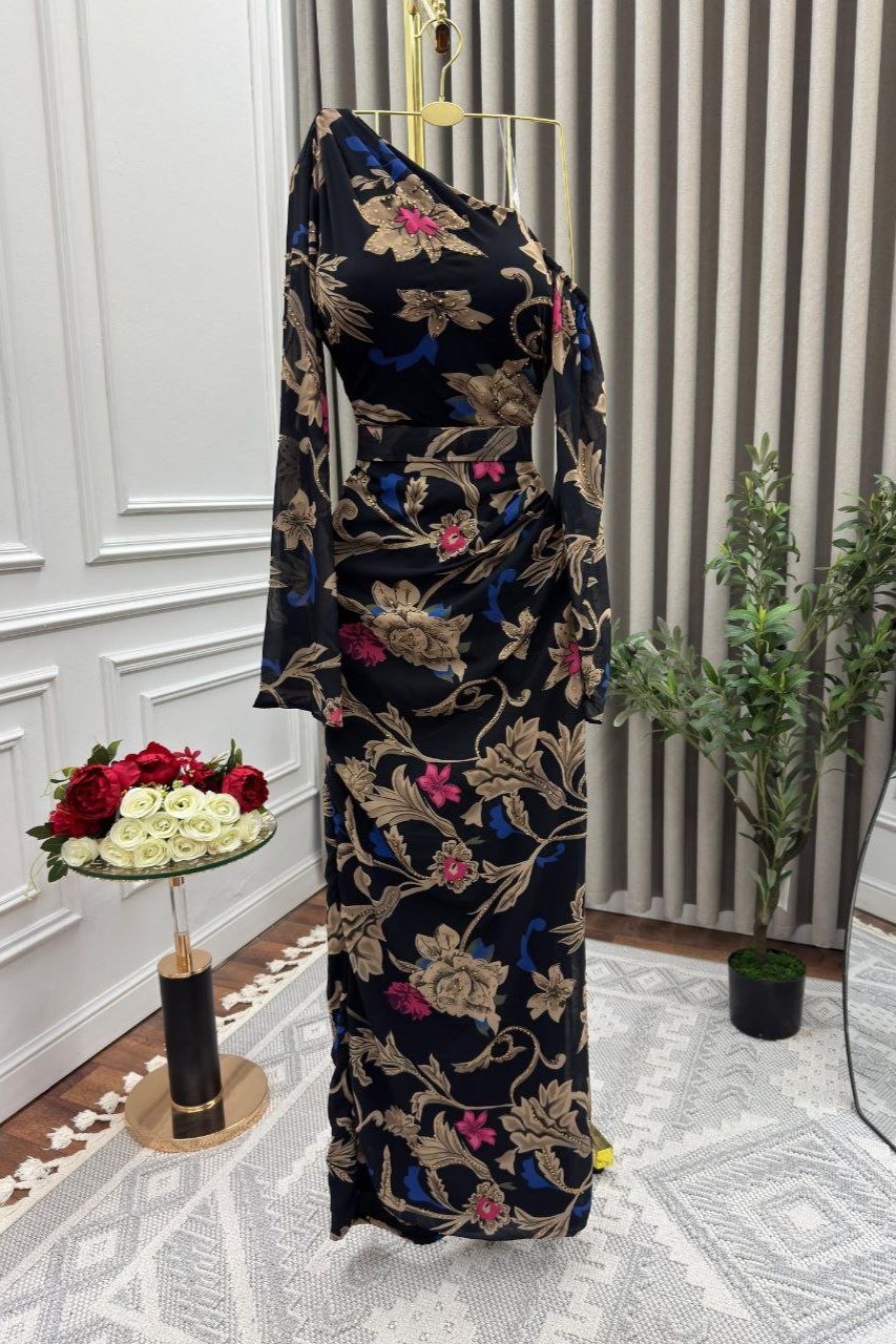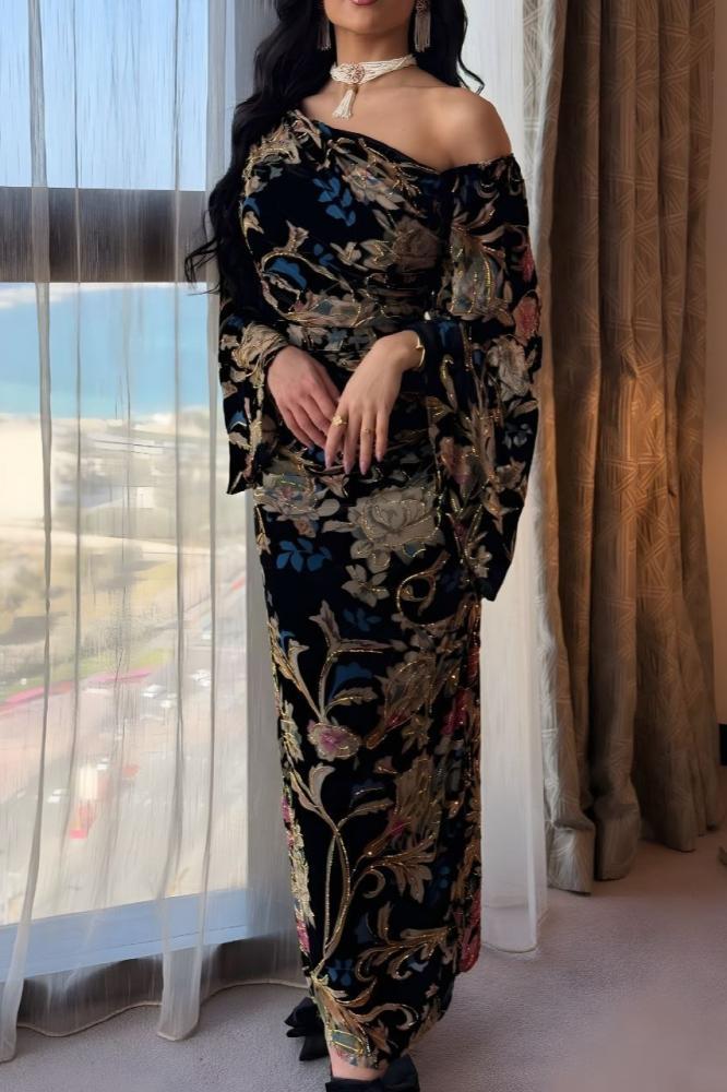 إطلالة ملكية مع هذا الفستان الفاخر، الذي يتميز بنقشات الزهور المتداخلة على خلفية داكنة لإضفاء لمسة راقية وجذابة.
