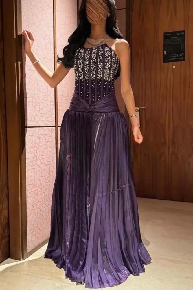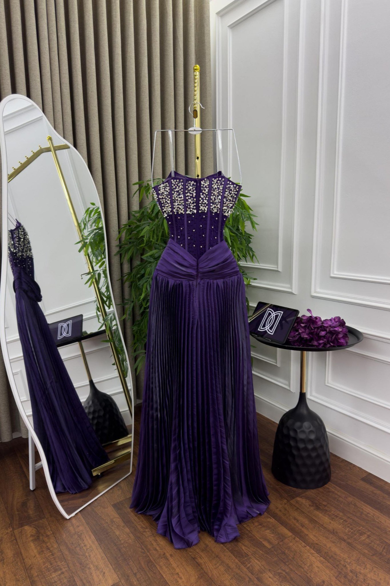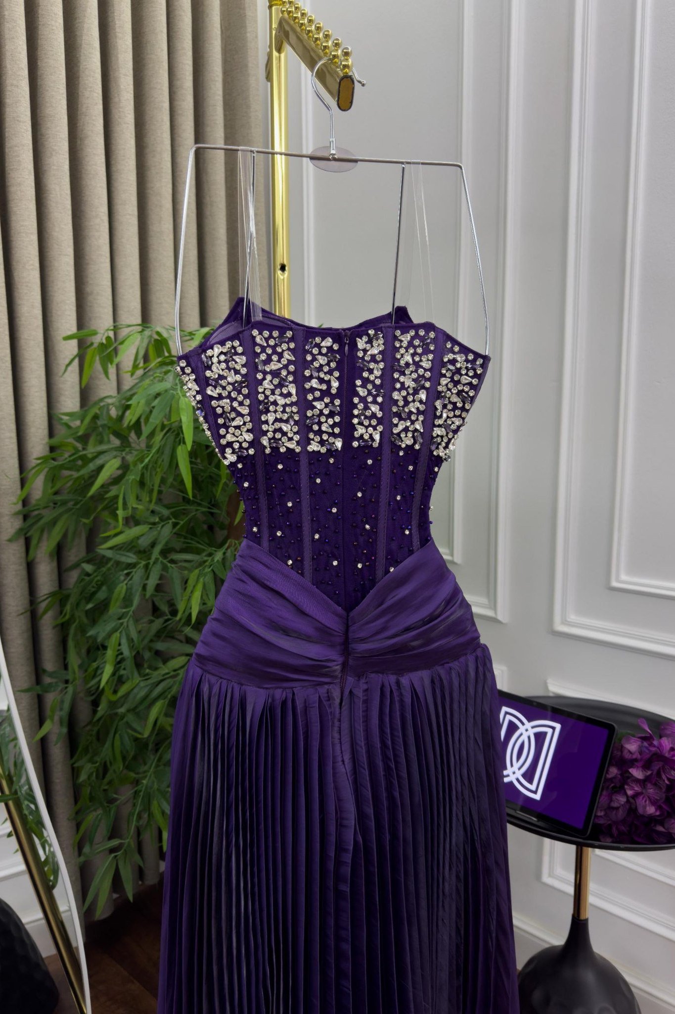فستان سهرة بنفسجي طويل مطرز بكريستالات