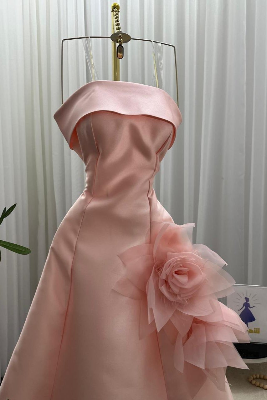 فستان سهرة وردي ساتان مزين بورود ثلاثية الأبعاد