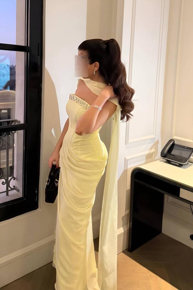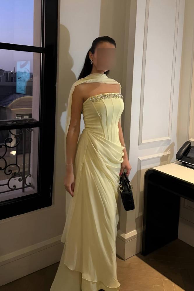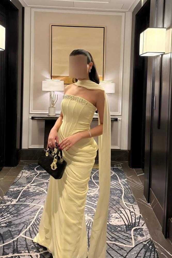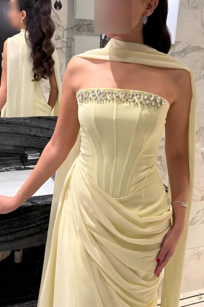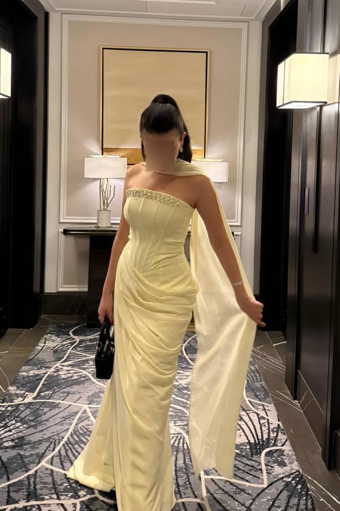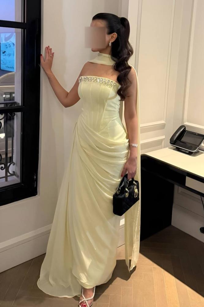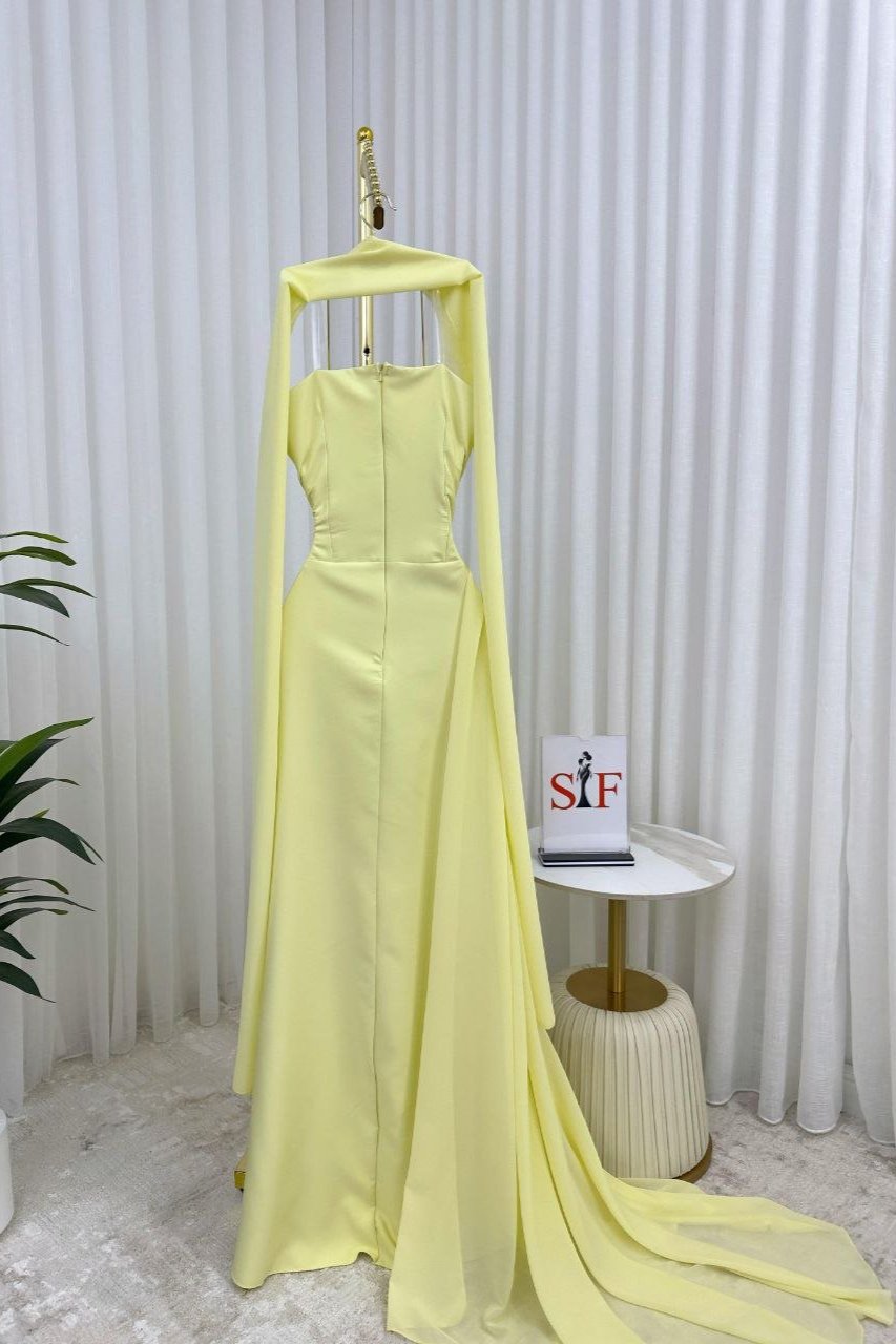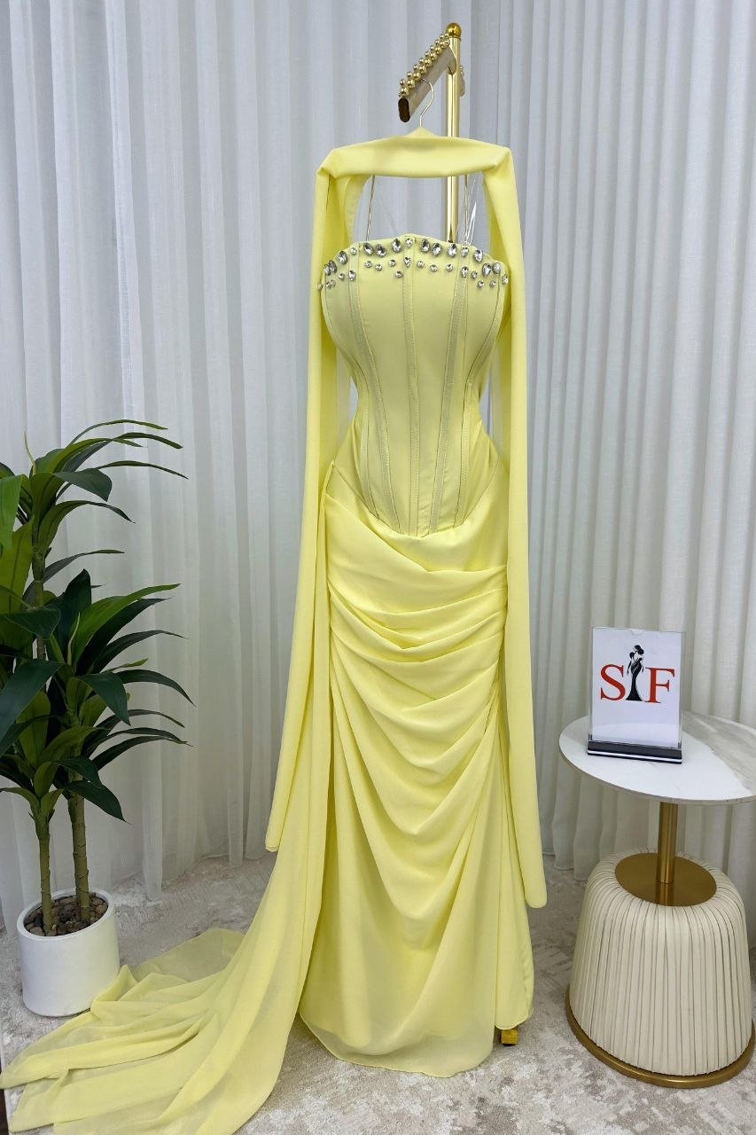 فستان سهرة أصفر باستيل طويل مطرز بكريستال مع وشاح ملكي