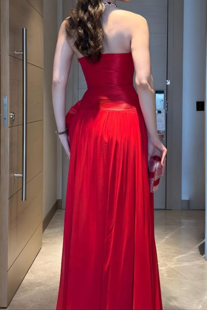 فستان سهرة طويل أحمر بدون أكمام بتصميم درابيه وتطريز جانبي