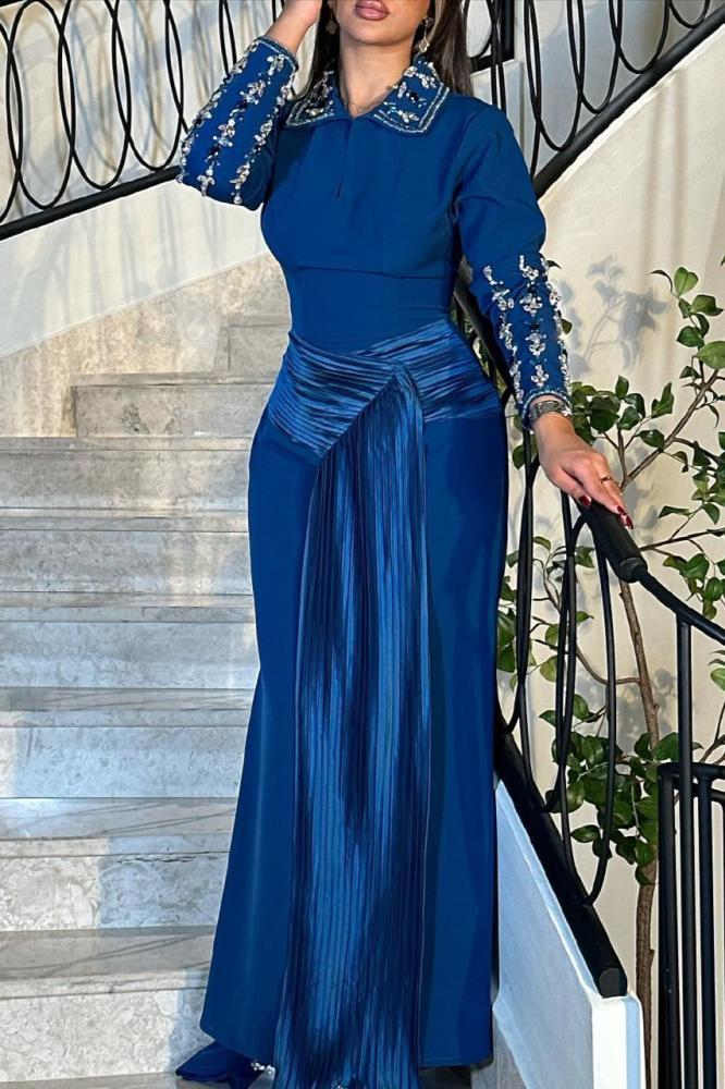فستان سهرة ازرق ملكي بياقة واكمام كريستال