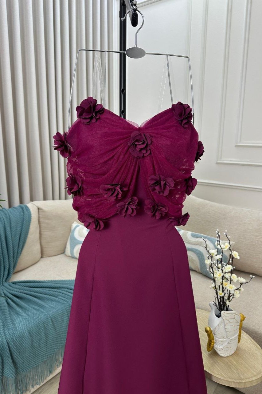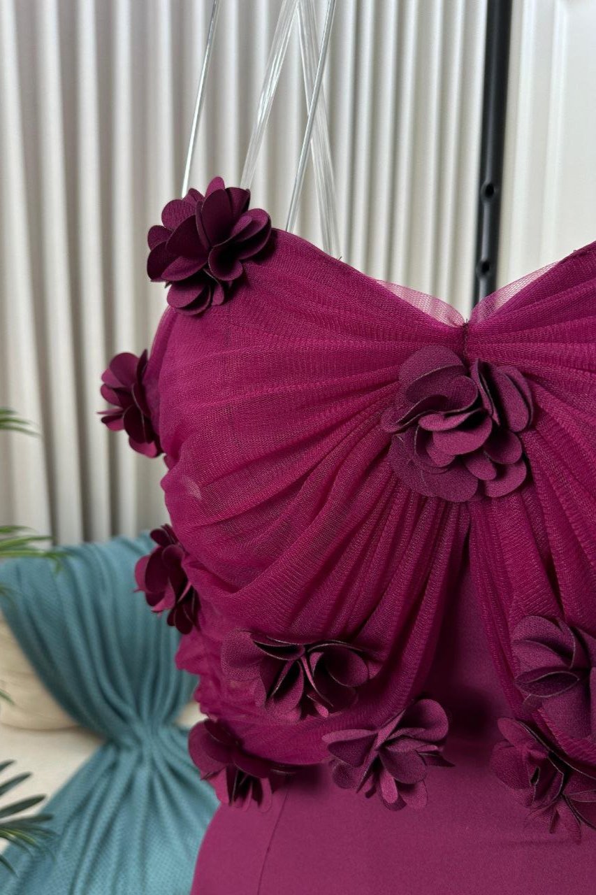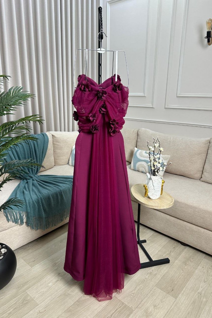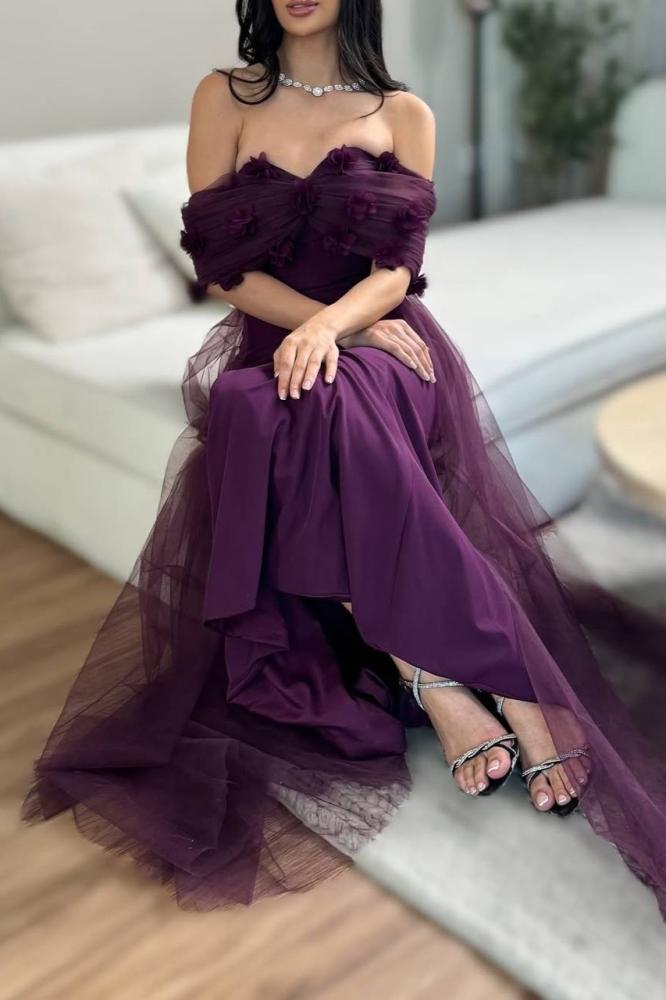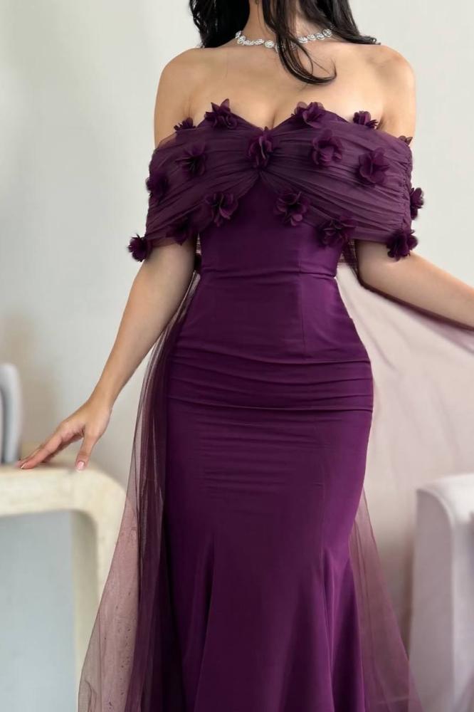 فستان سهرة أوف شولدر باللون البنفسجي الداكن مزين بالزهور وذيل تول ملكي