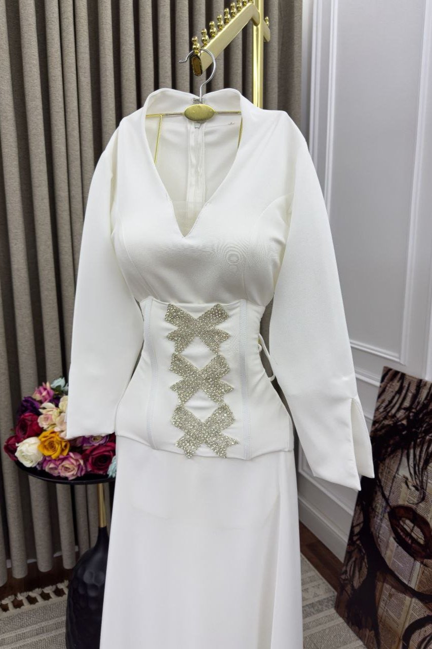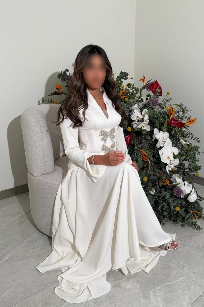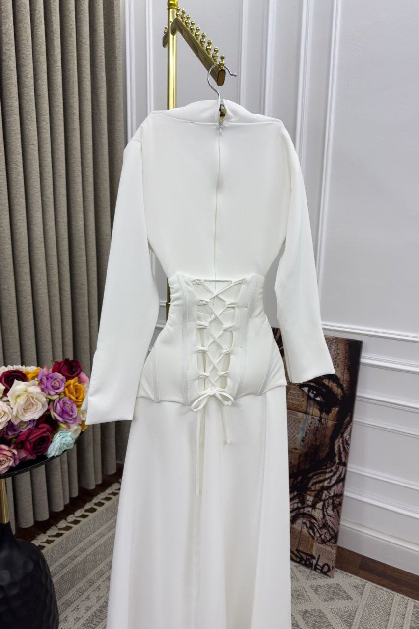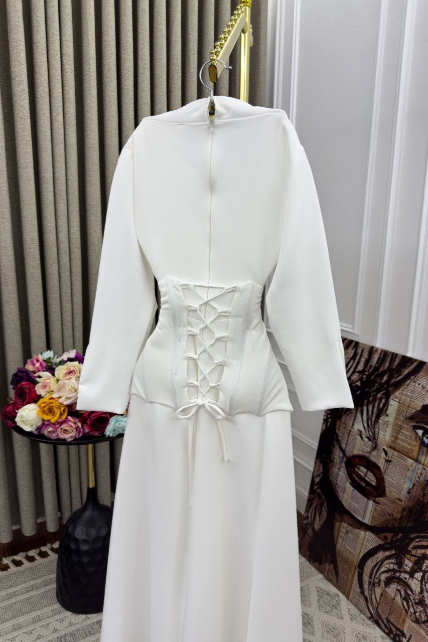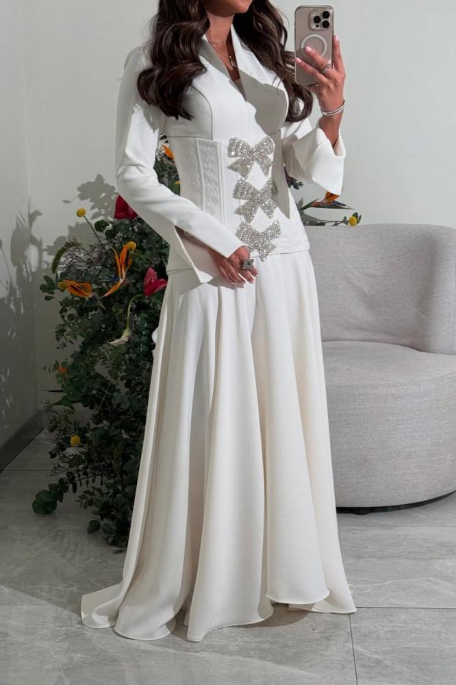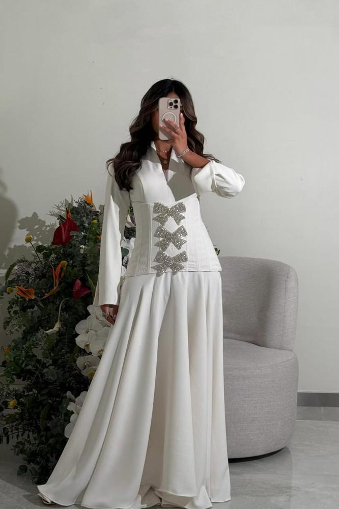 فستان أبيض أنيق يتميز بتصميم عصري يجمع بين الجاكيت الرسمي والتنورة الواسعة المتدفقة. مزين بفيونكات لامعة على الخصر تمنحه لمسة فاخرة تناسب المناسبات المميزة. القصة المحتشمة مع الأكمام الطويلة تضيف إليه لمسة من الرقي والكلاسيكية.