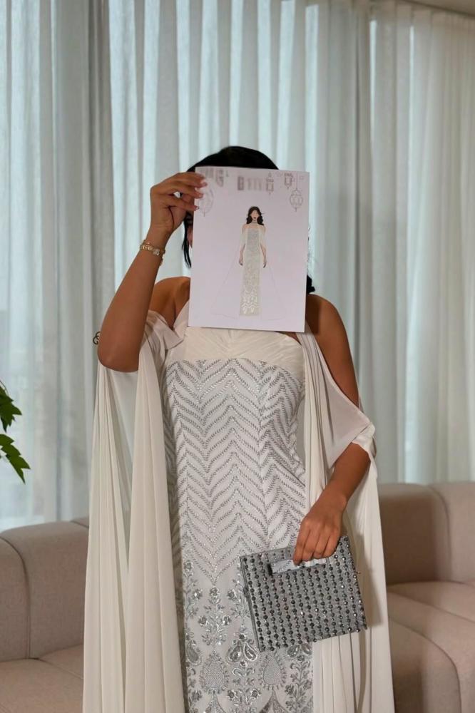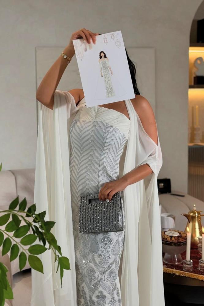 جلابية بيضاء بتطريز فضي وشيفون قطعتين