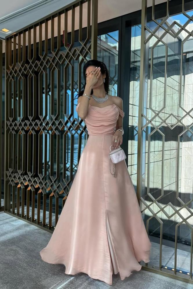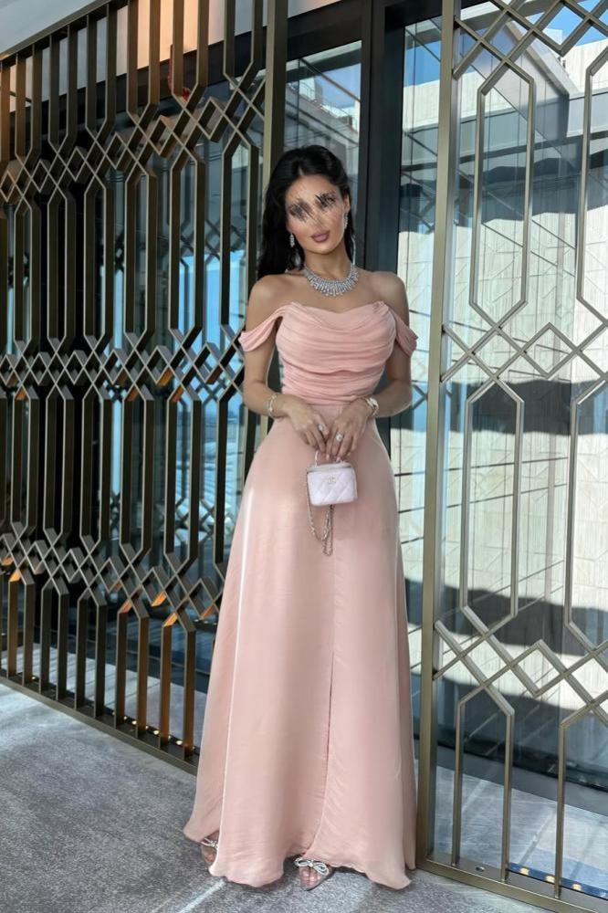 فستان أنيق بقصة جذابة، يتميز بأكتاف مكشوفة مع تصميم درابيه على الصدر يمنح لمسة من الفخامة والأنوثة.