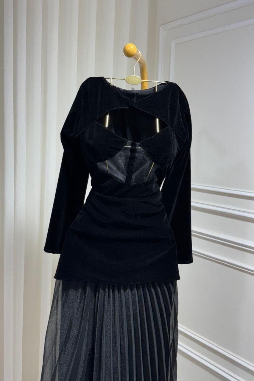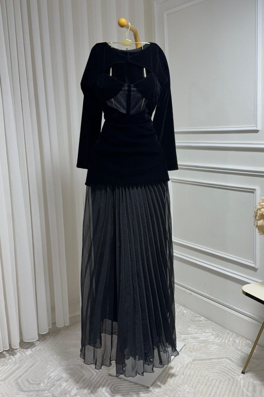 بينما تضيف التنورة البليسيه المنسدلة لمسة أنثوية ساحرة. التفاصيل العلوية المميزة تمنح الفستان طابعًا عصريًا يناسب المناسبات الفاخرة والسهرات.