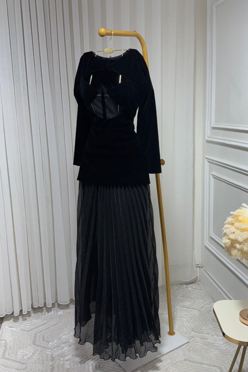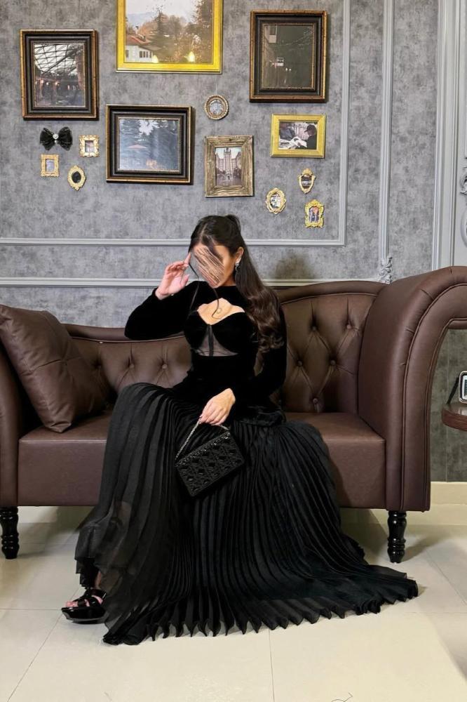 تصميم أنيق باللون الأسود يجمع بين الفخامة والرقي. يأتي الفستان بأكمام طويلة مع قصة ضيقة عند الخصر تعزز من جمال القوام،