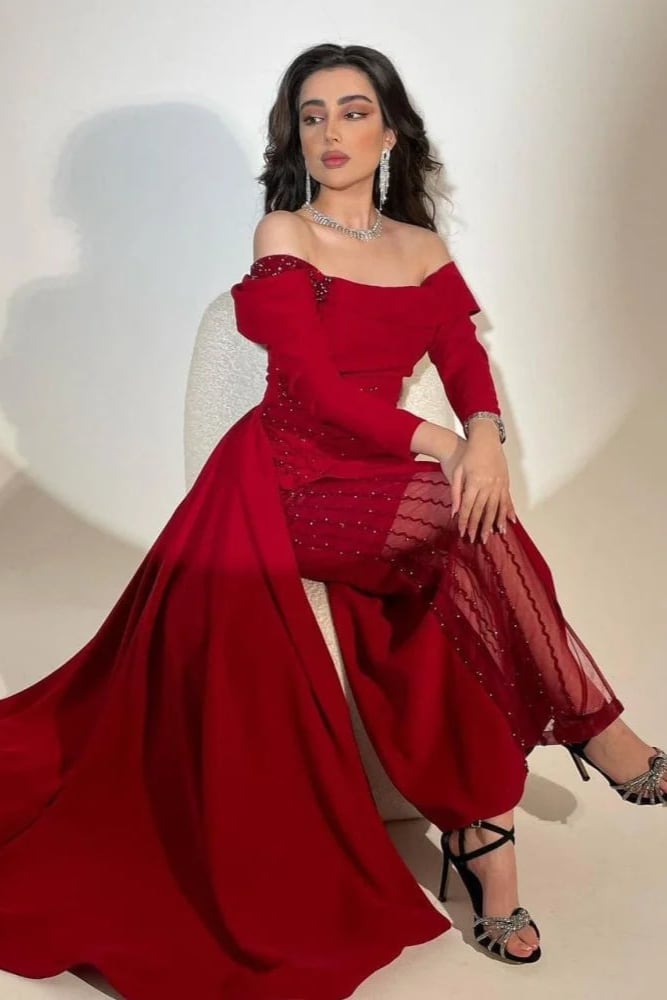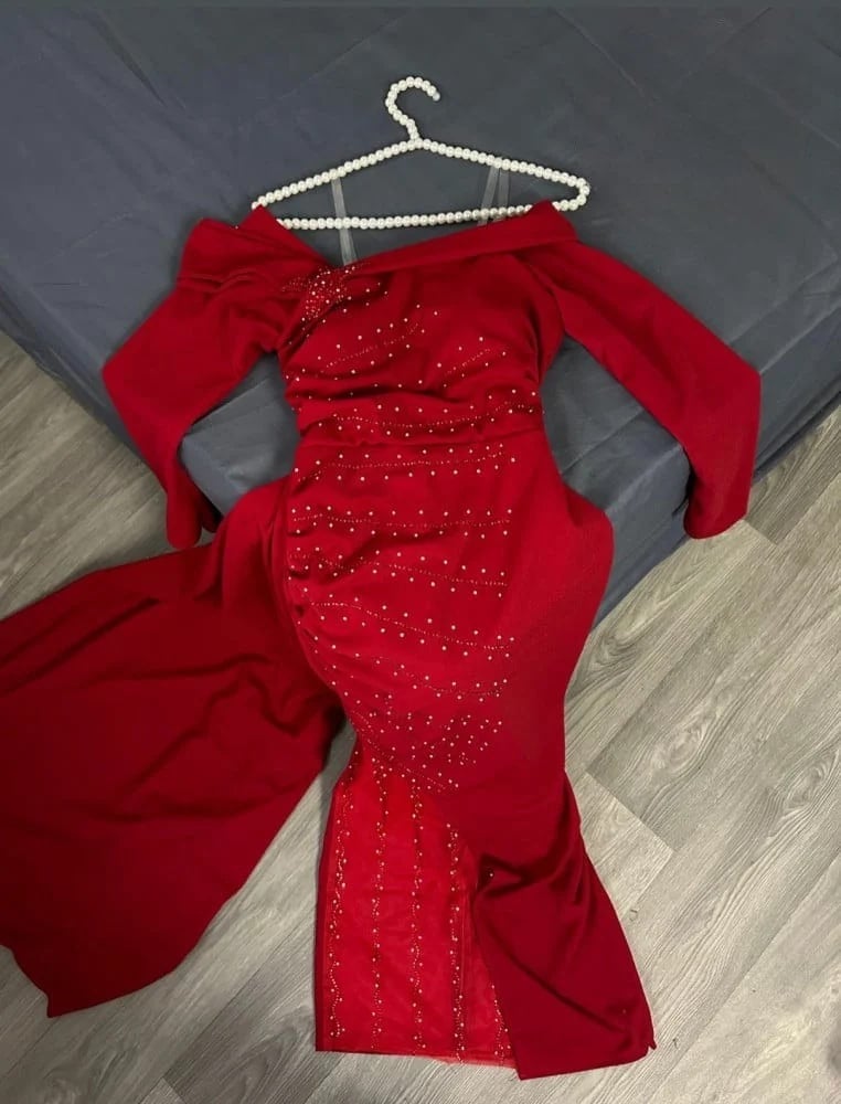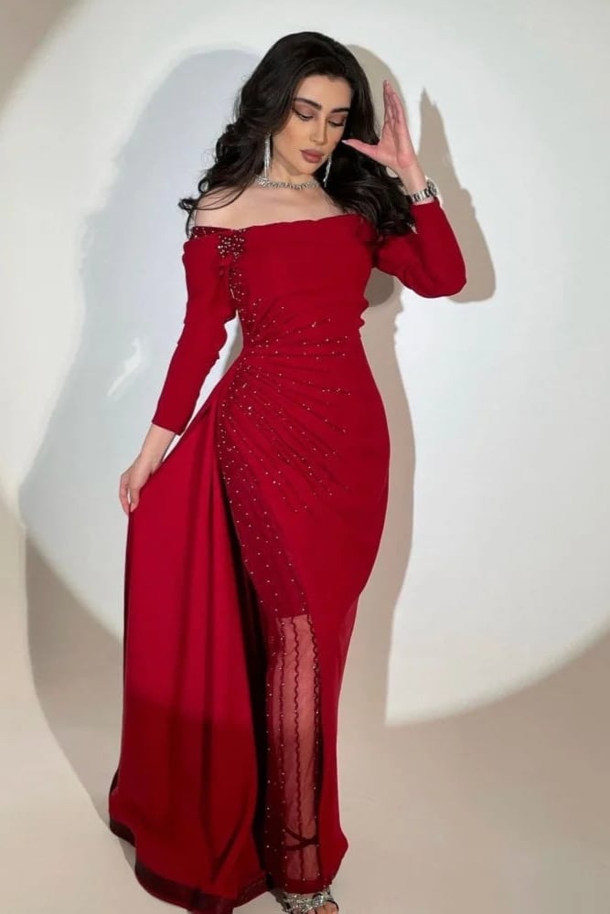 فستان سهرة أحمر طويل بأكمام طويلة مع شق جانبي شفاف