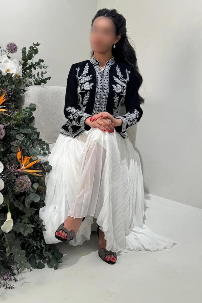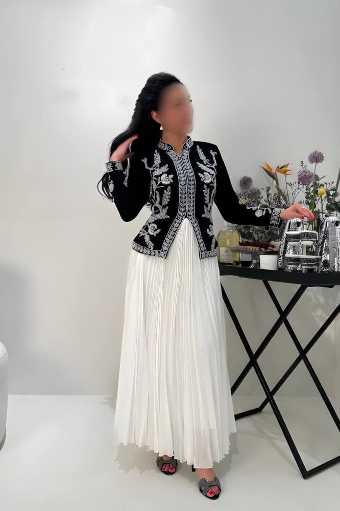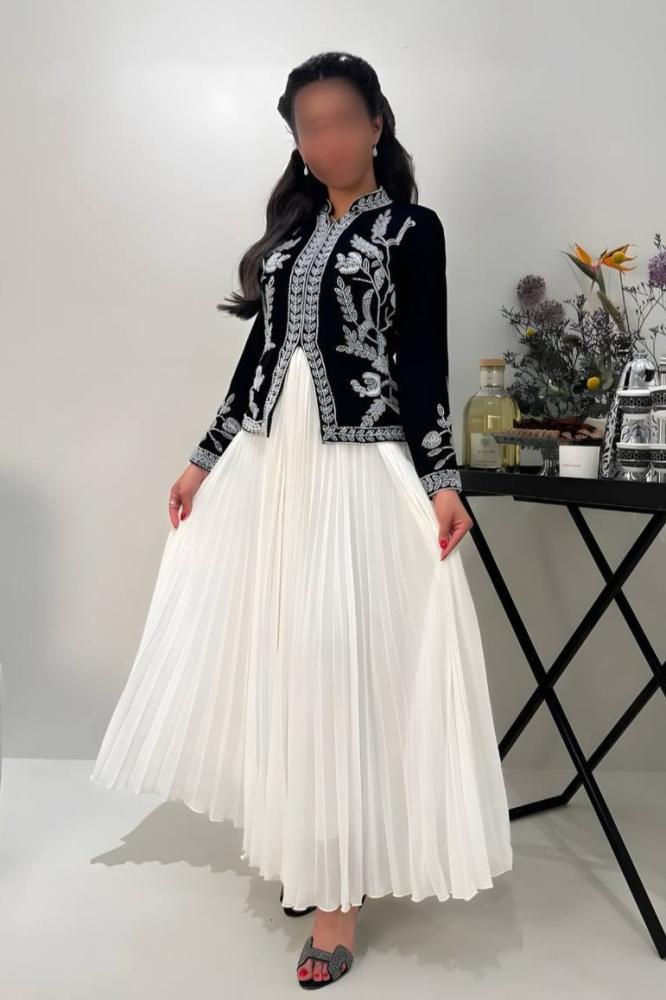 فستان أنيق يجمع بين الفخامة والأناقة، يتميز بتنورة بكسرات ناعمة تمنح انسيابية راقية للحركة. يأتي مع جاكيت فاخر مزين بتطريزات دقيقة تعكس تفاصيل فنية أنيقة، مما يضفي لمسة من الفخامة على الإطلالة. خيار مثالي للمناسبات الفاخرة والإطلالات الرسمية بأسلوب راقٍ ومميز.