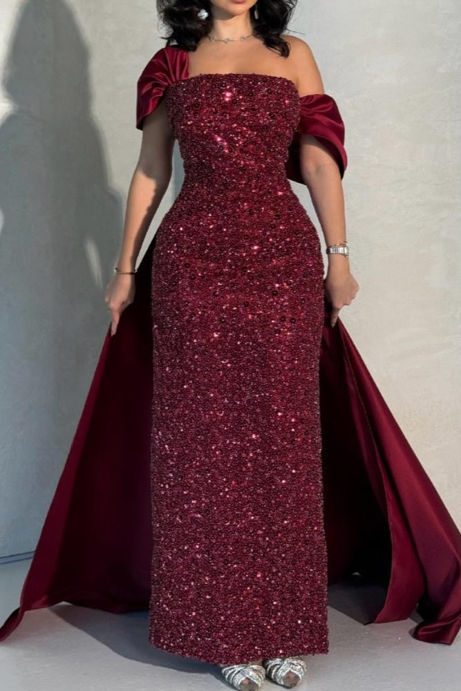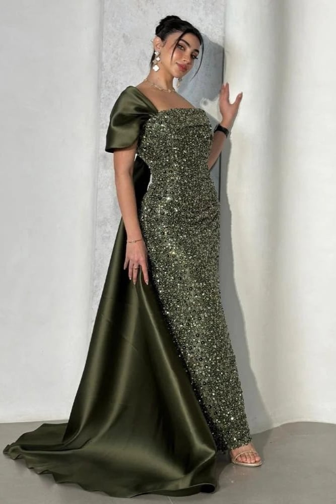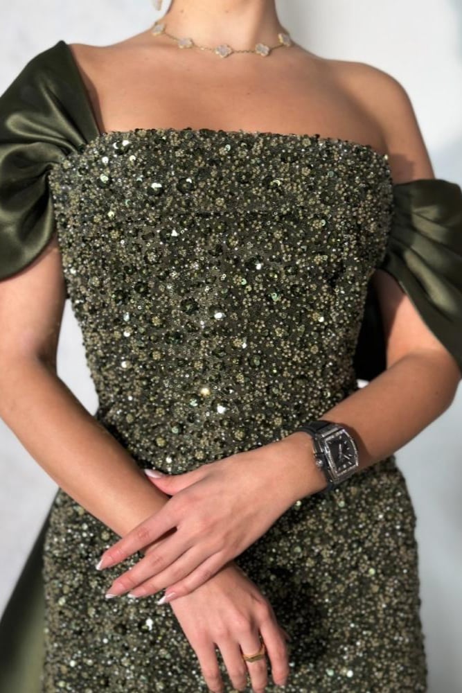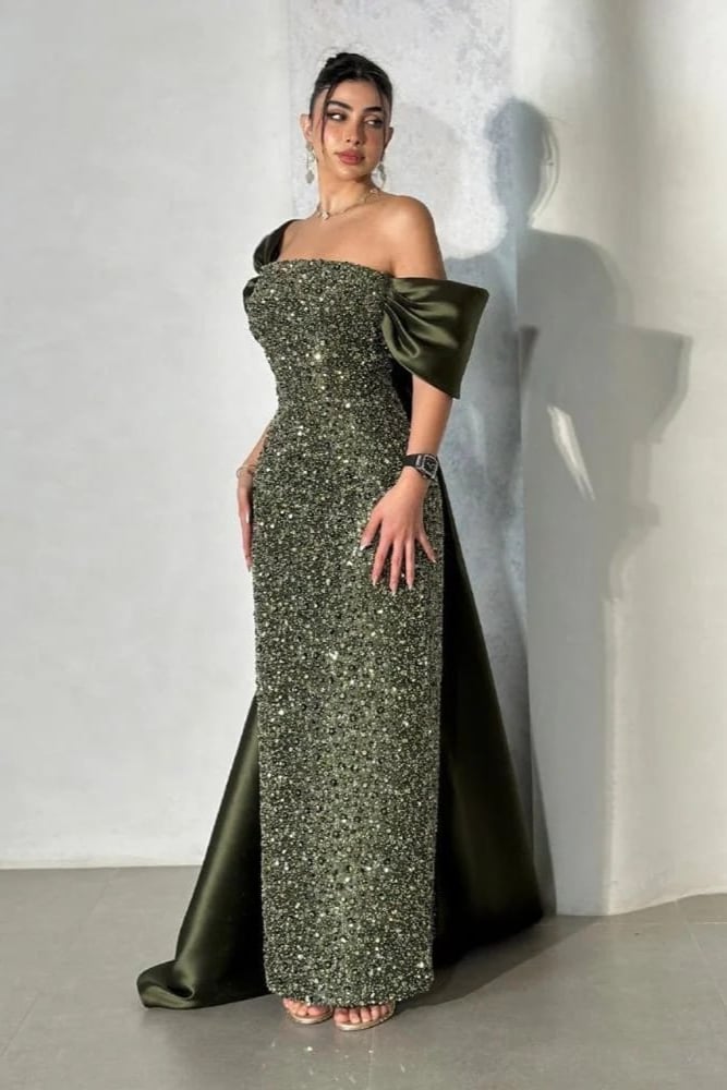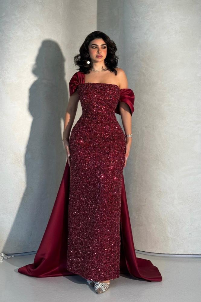 فستان سهرة أوف شولدر مطرز بالكامل بالترتر اللامع