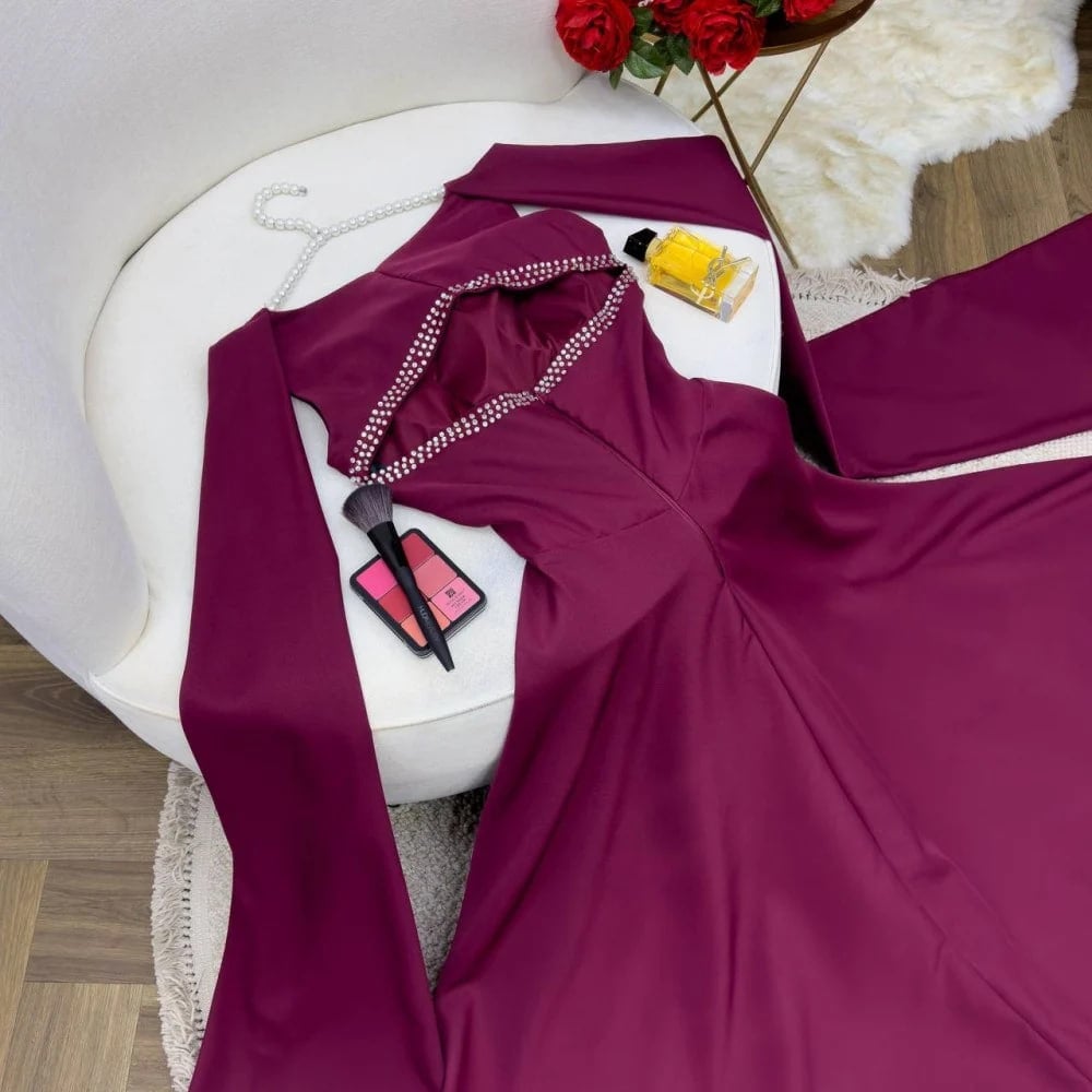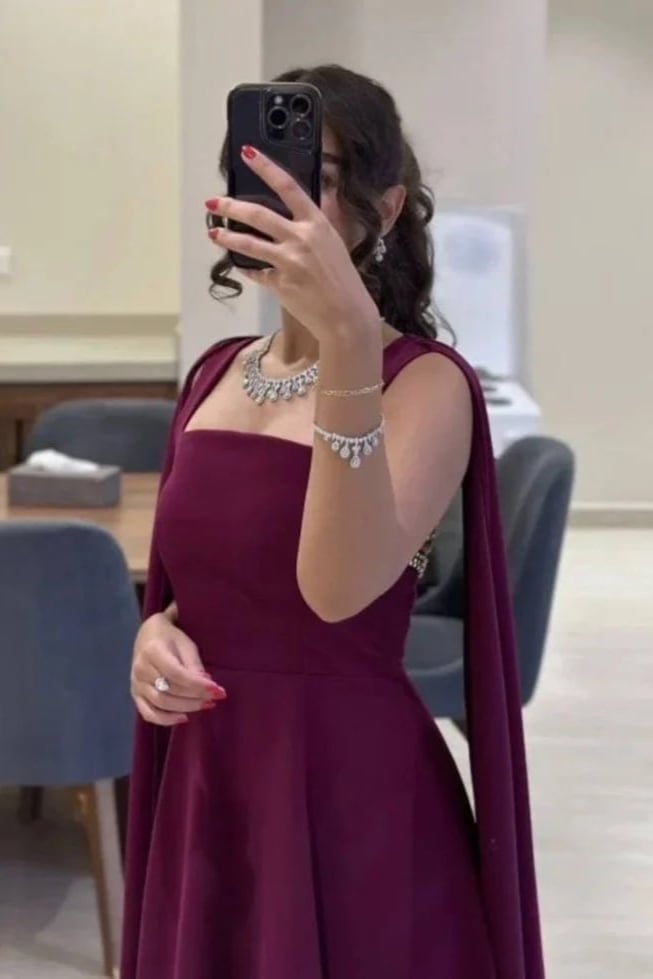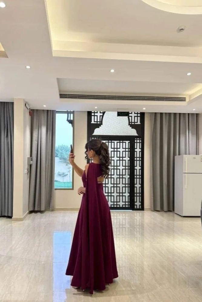 فستان سهرة عنابي طويل بكاب ملكي أنيق بدون أكمام