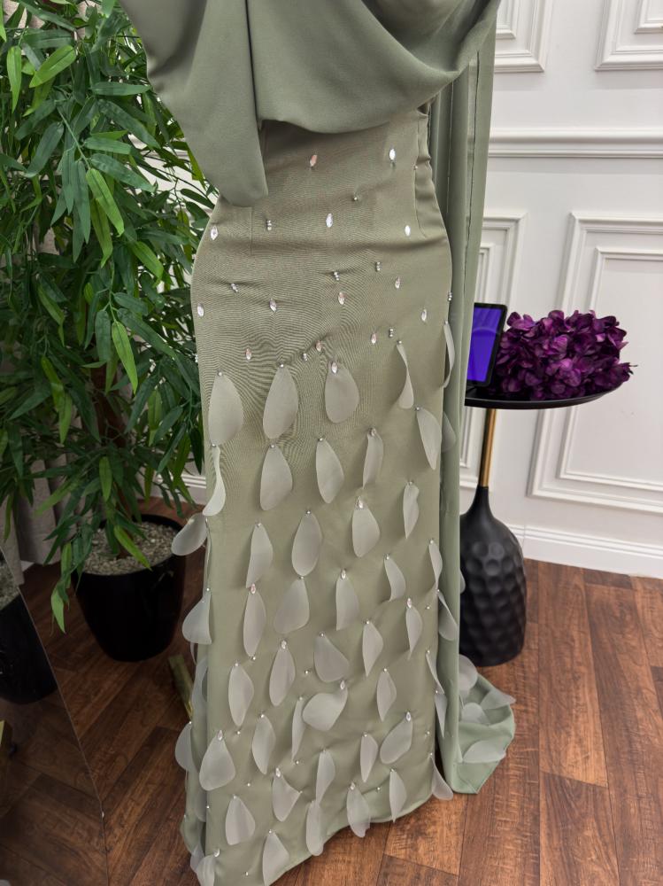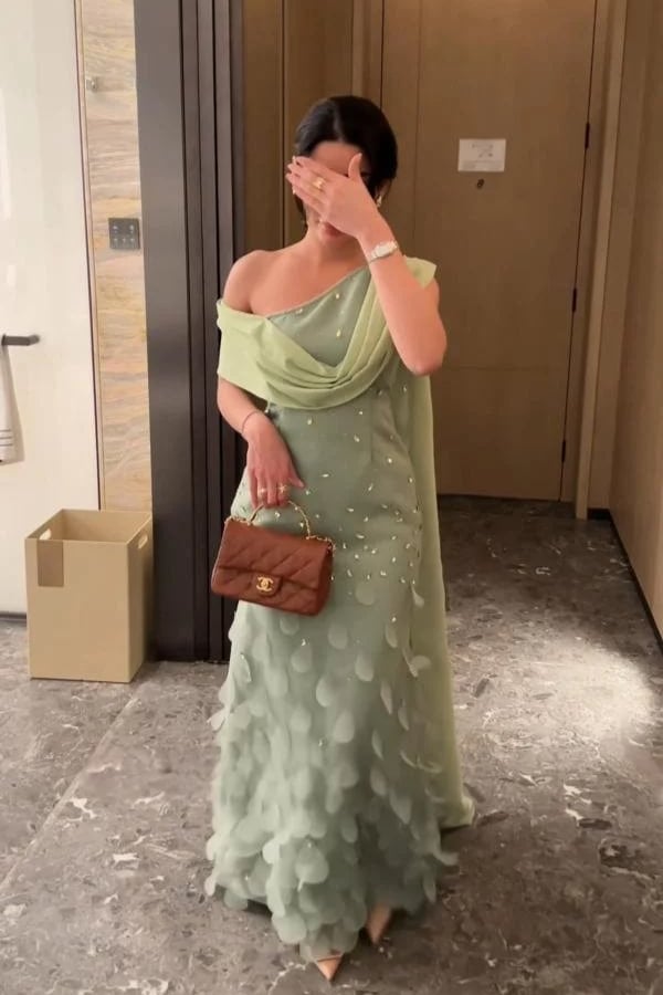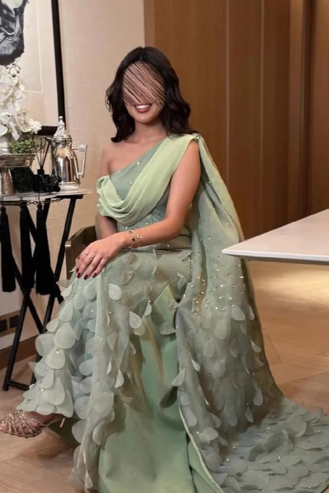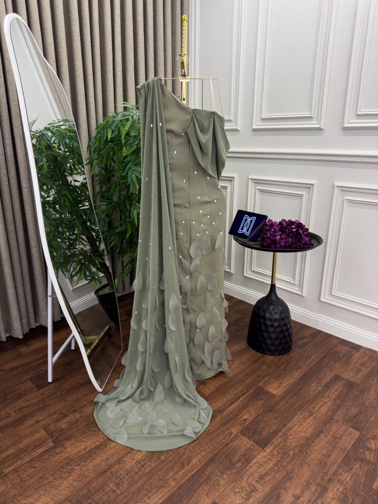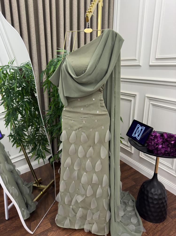فستان سهرة أخضر فاتح بكتف واحد مطرز