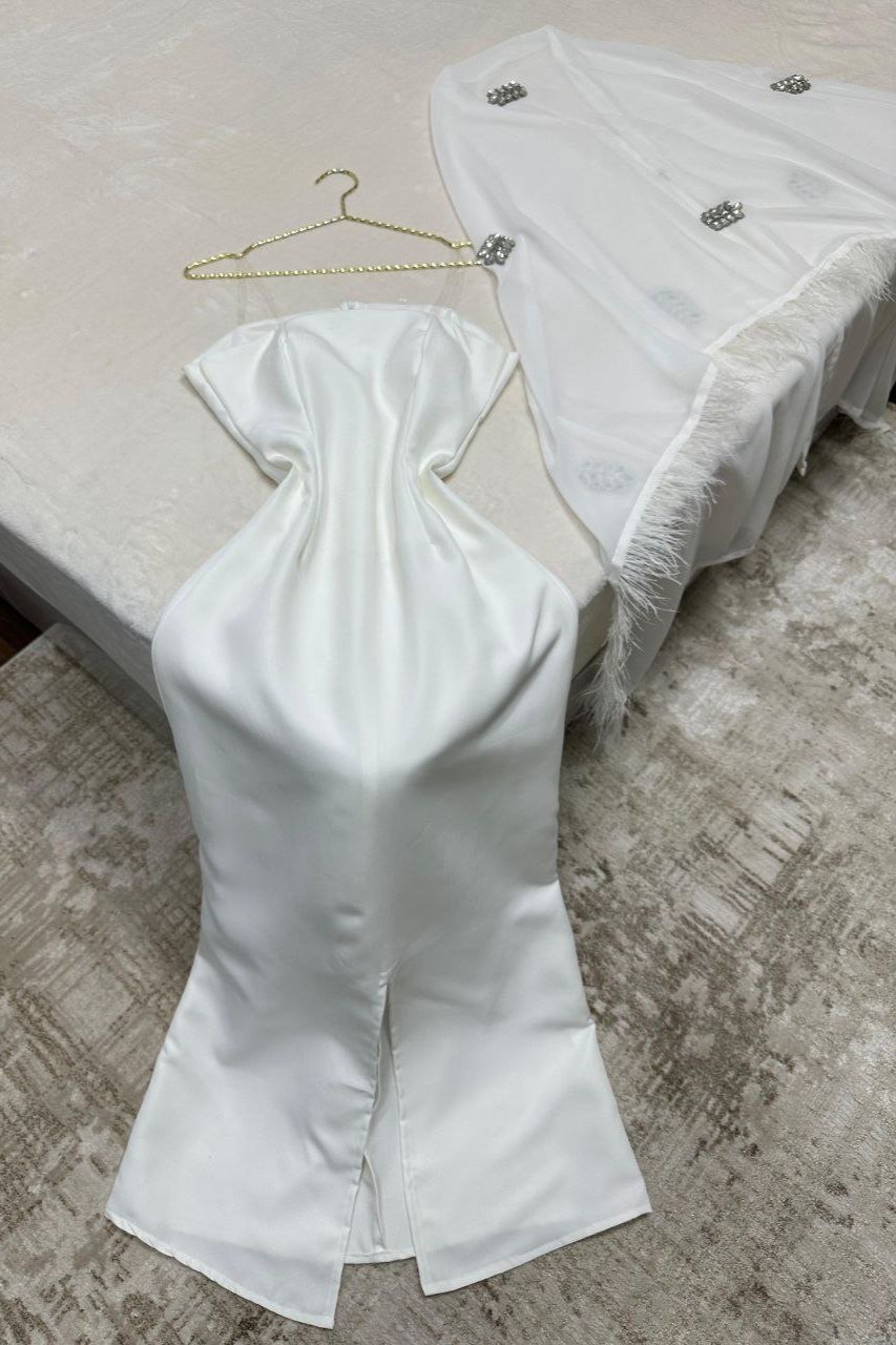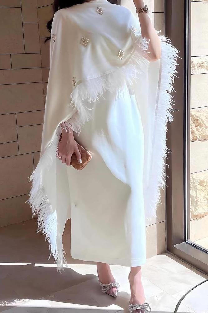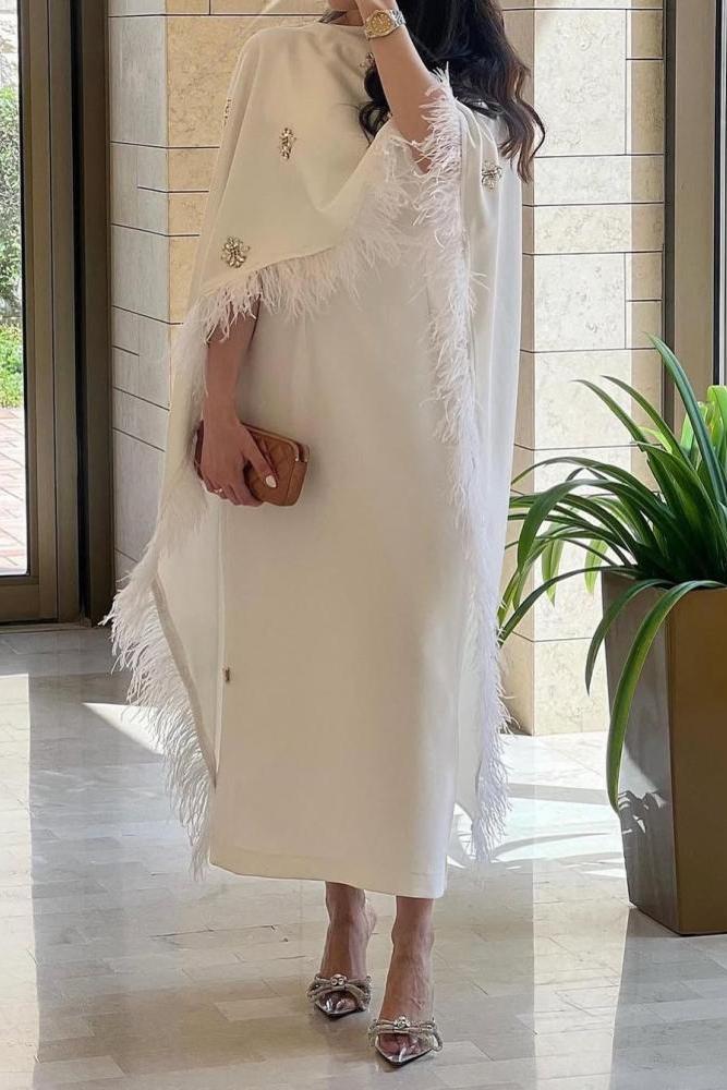 جلابية بيضاء مضيئة تعكس الأنوثة والرقي، مزينة بتفاصيل واضحة من الريش المضاد على لمظهر راقٍ وفريد من نوعه.