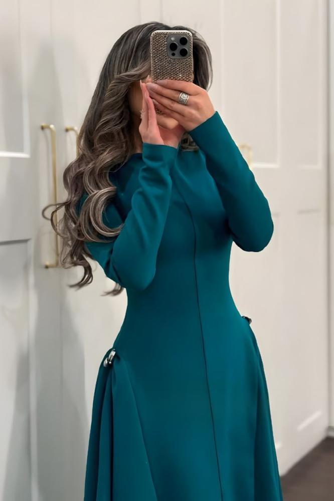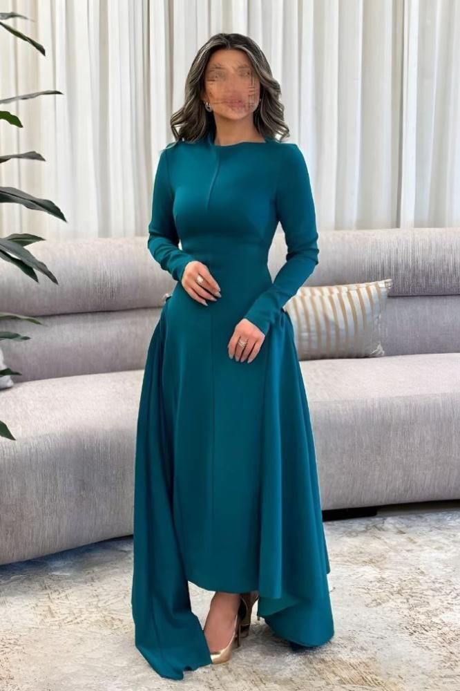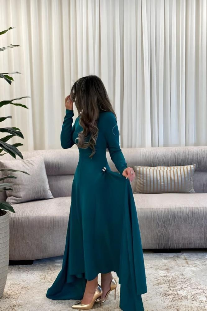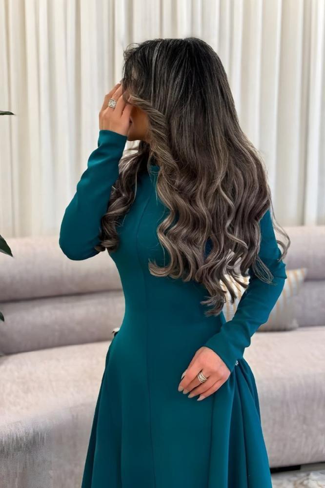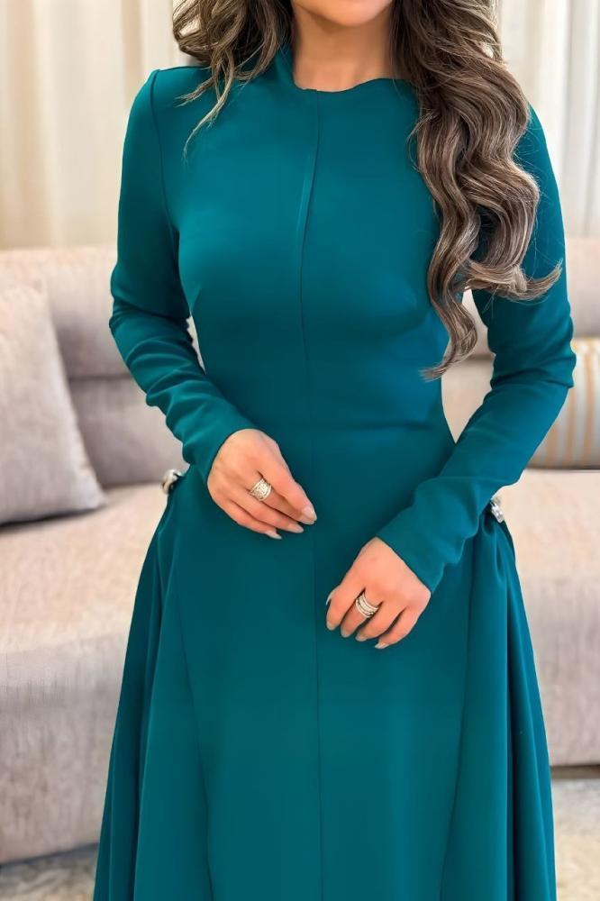 فستان سهرة طويل بأكمام طويلة، يتميز بقصته الناعمة التي تنسدل برقي، مع تفاصيل جانبية أنيقة تضيف لمسة عصرية جذابة.