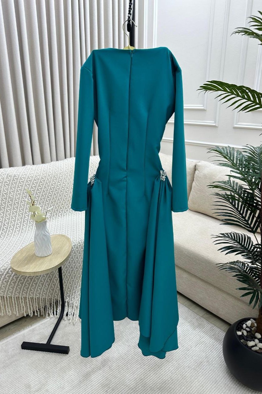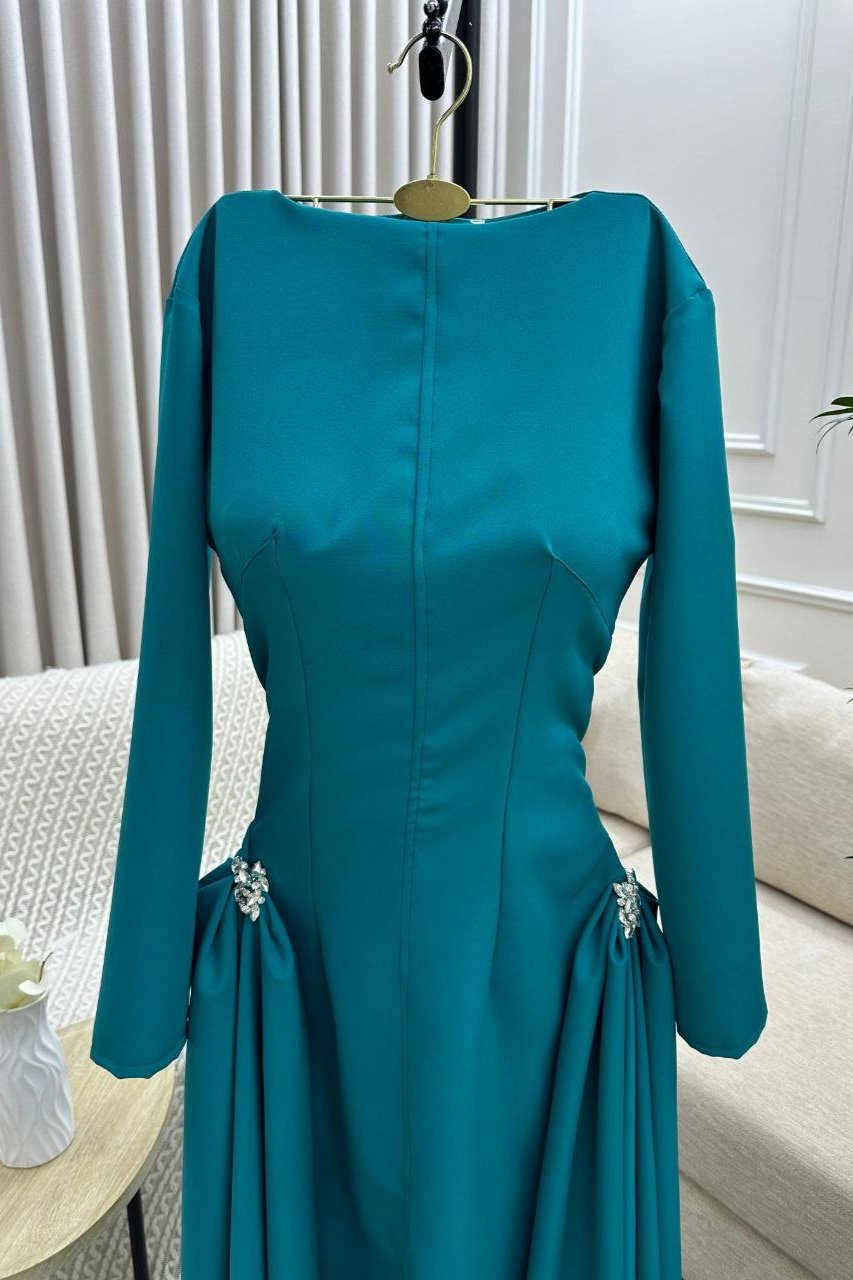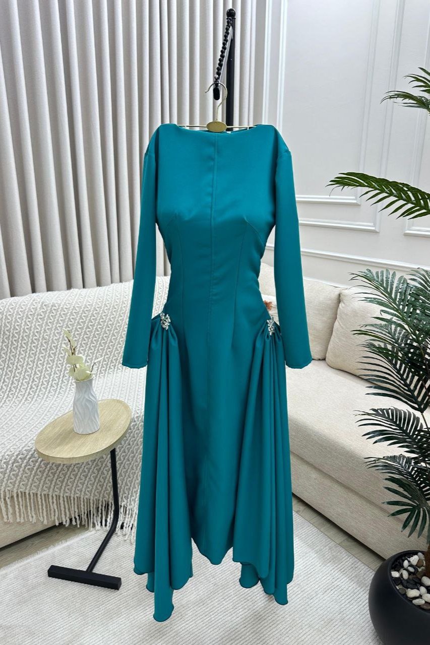 فستان سهرة طويل بأكمام طويلة، يتميز بقصته الناعمة التي تنسدل برقي، مع تفاصيل جانبية أنيقة تضيف لمسة عصرية جذابة.