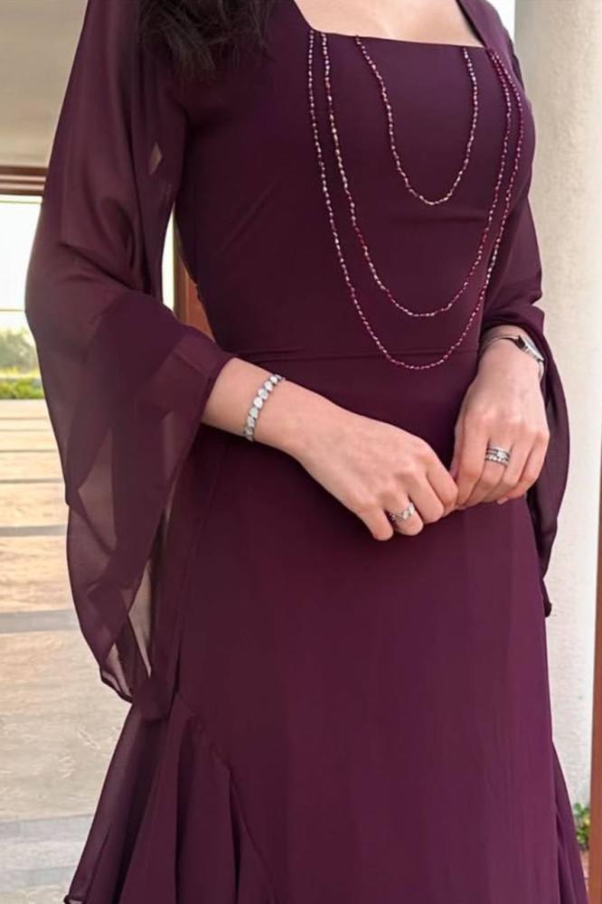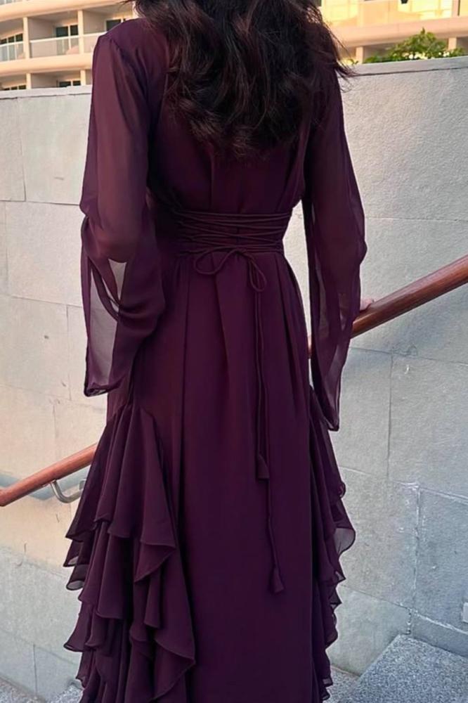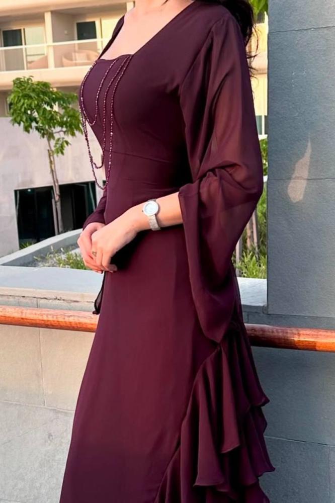 قستان أنيق يتميز بتصميم انسيابي ناعم . يتميز بأكمام واسعة تضفي مظهراً أنثوياً جذاباً. يأتي الجزء السفلي مزيناً بطبقات كشكش جانبية تمنح الفستان حركة ديناميكية وأناقة إضافية. تصميم مثالي للمناسبات الخاصة بفضل بساطته وفخامته في آنٍ واحد.