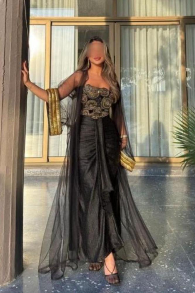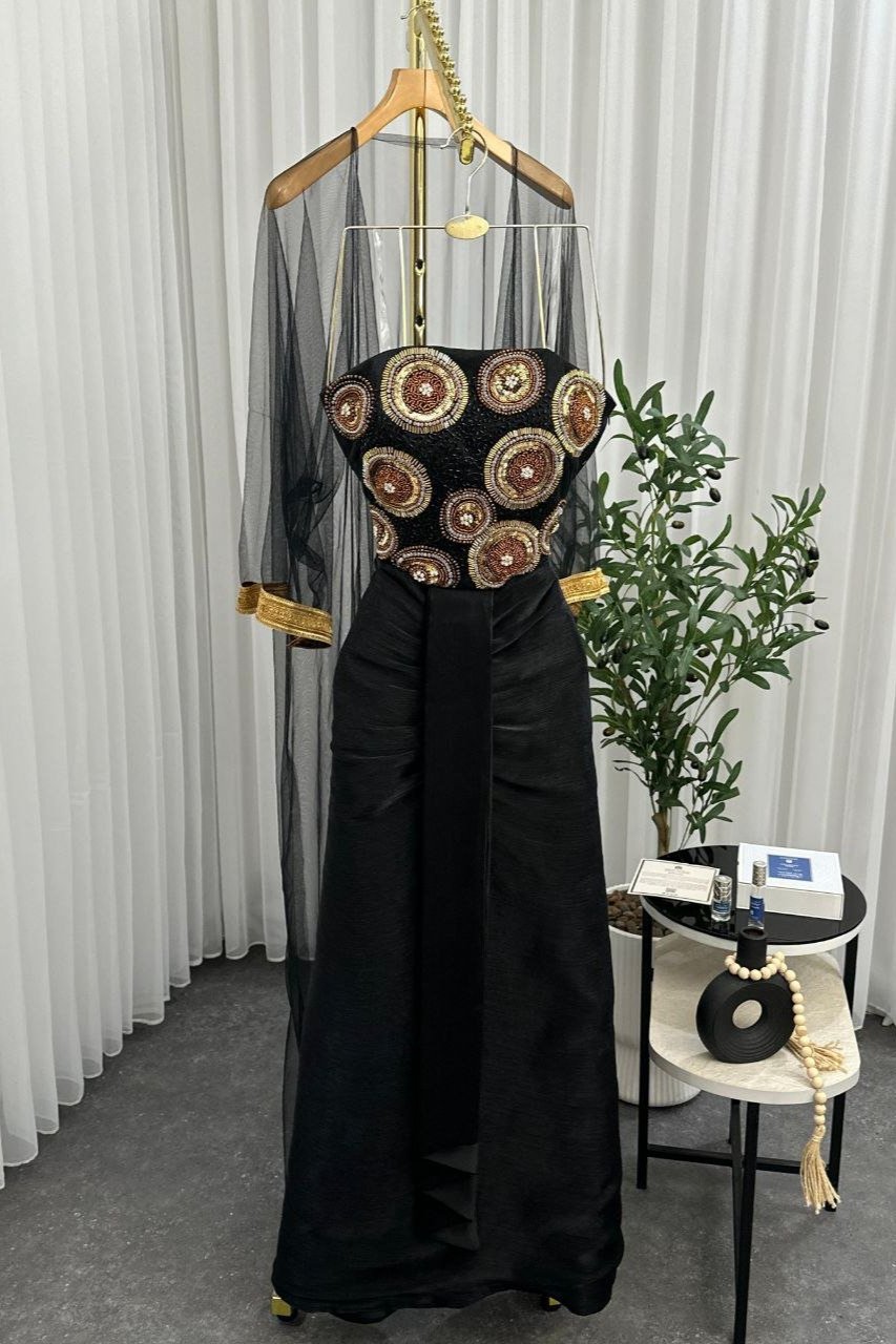 فستان أنيق بتصميم فخم يناسب المناسبات الراقية، يتميز بجزء علوي مزين بتطريز ذهبي فاخر يضفي لمسة ملكية.