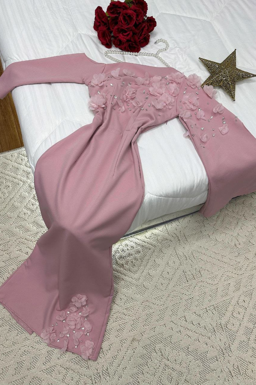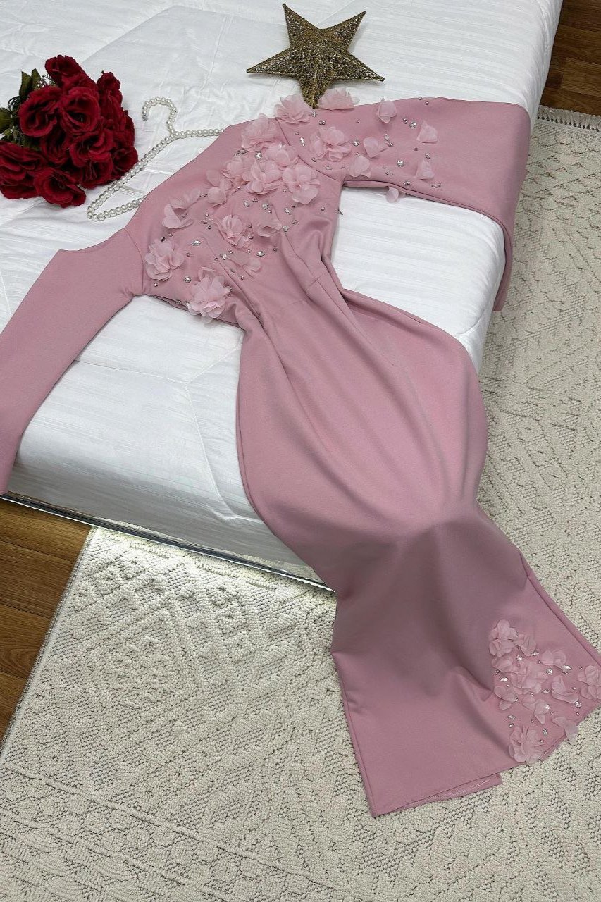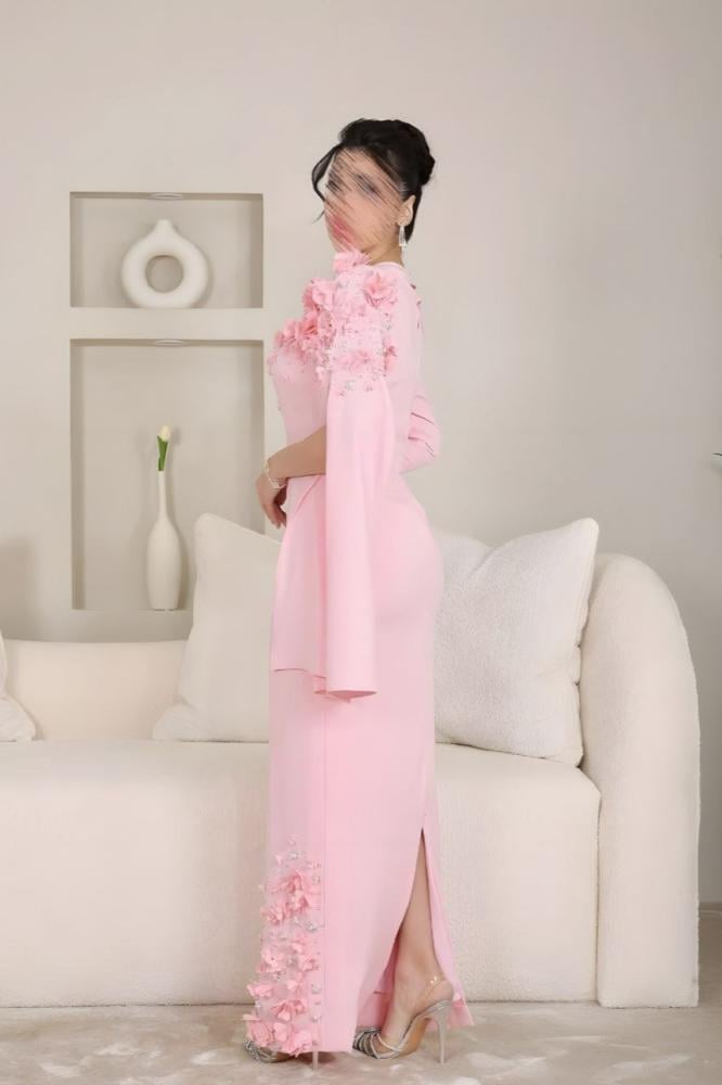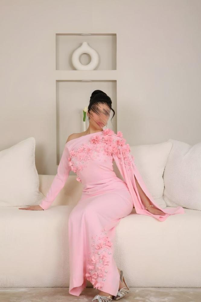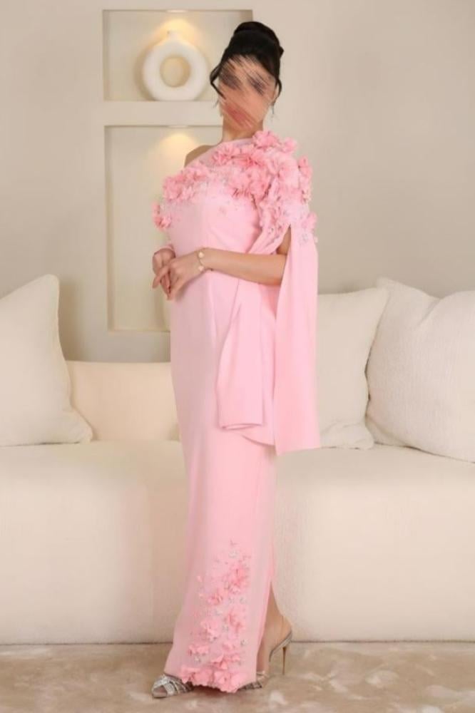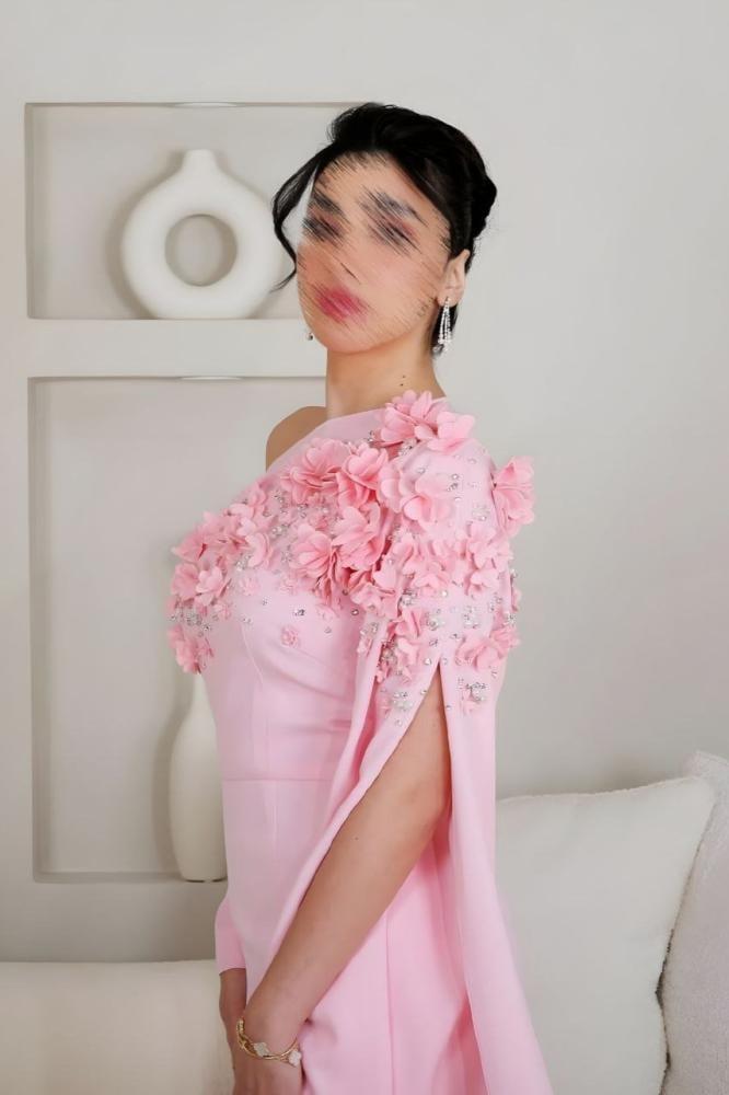 فستان سهرة أنيق بقصة ضيقة وانسيابية تعزز من جمال القوام. يتميز بتصميم كتف واحد مزين بالورود ثلاثية الأبعاد مع تطريز ناعم يضفي لمسة فاخرة. يمتد وشاح جانبي لمظهر راقٍ وفريد، مما يجعله خيارًا مثالياً للمناسبات الفاخرة والسهرات المميزة.