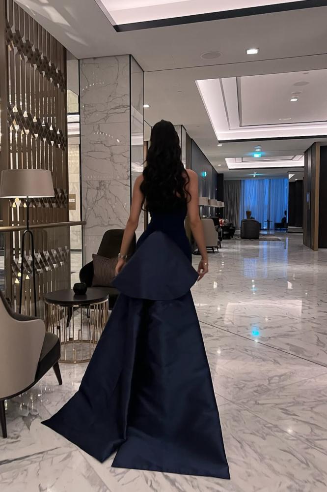فستان سهرة فاخر باللون الكحلي بتصميم كورسيه بدون أكمام مزين بتطريز أنيق يعزز من فخامته.