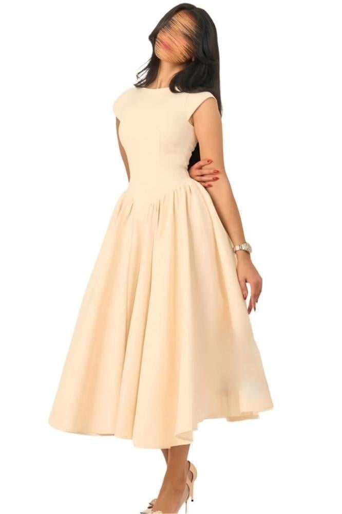 فستان أنيق بتصميم ميدي مميز يمنحك إطلالة أنثوية راقية. يتميز بأكمام قصيرة وقصة ضيقة عند الخصر تبرز جمال القوام،
