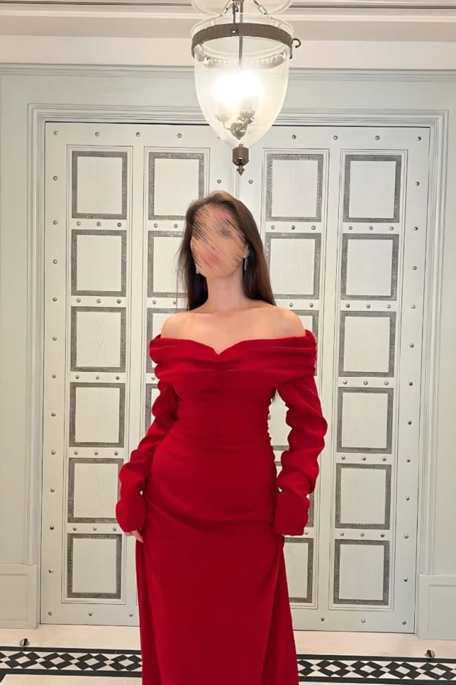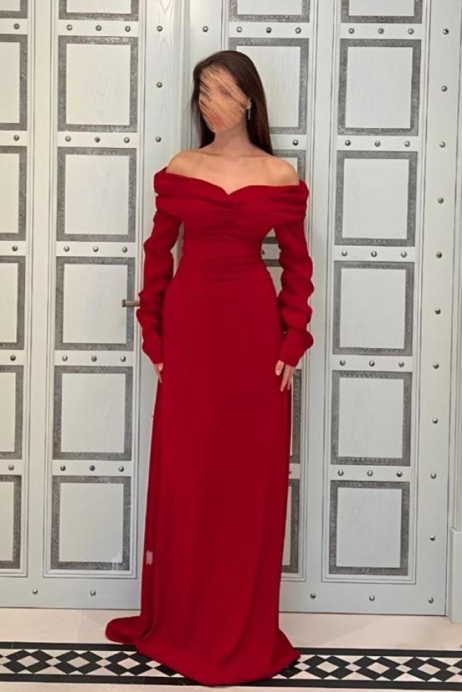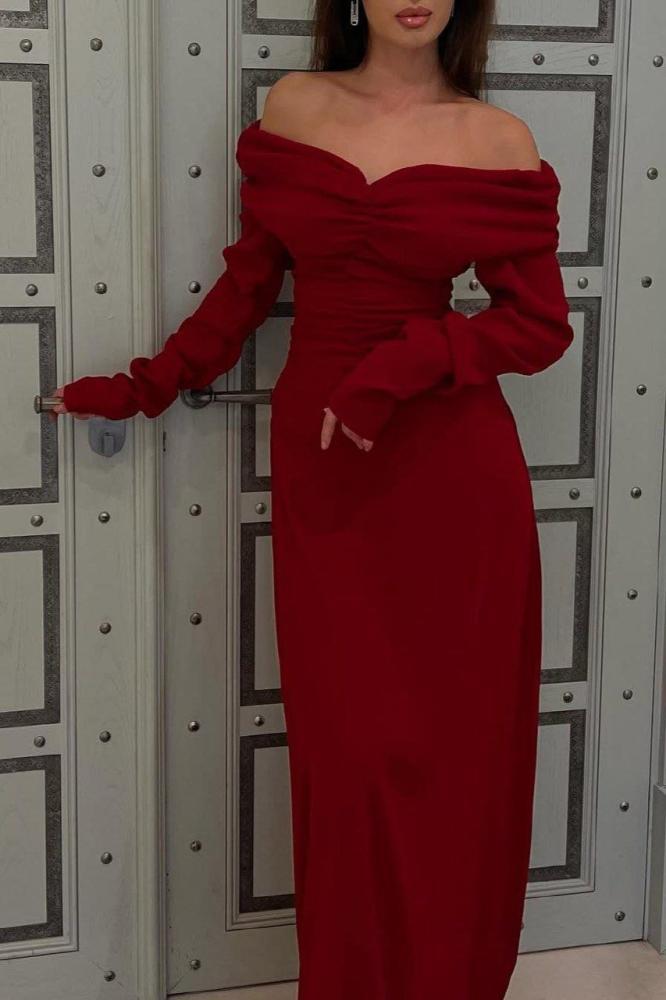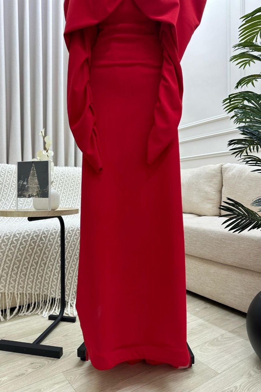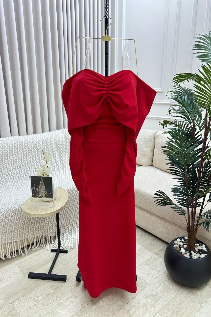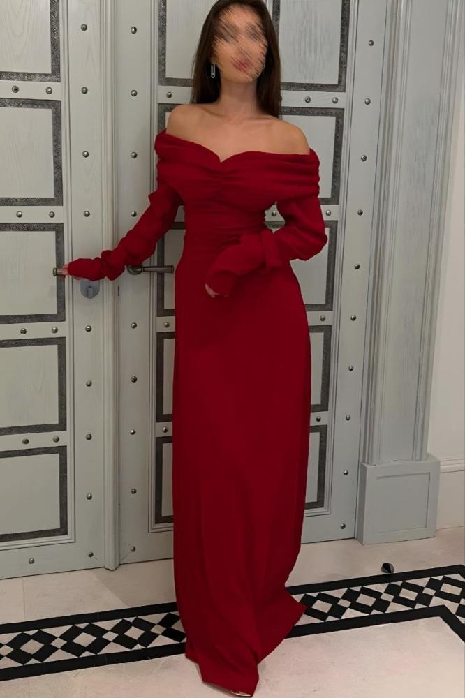 تصميم أنيق وجذاب بفستان طويل بلون أحمر جريء، يتميز بأكمام طويلة منسدلة تضفي لمسة فاخرة، مع قصة مكشوفة الكتفين