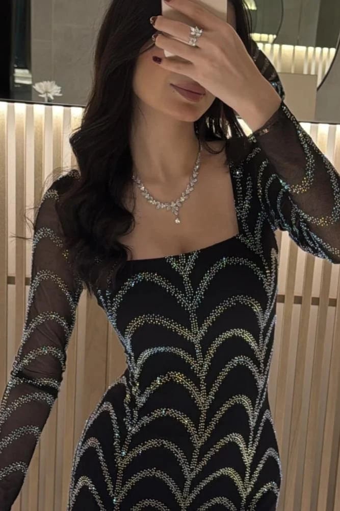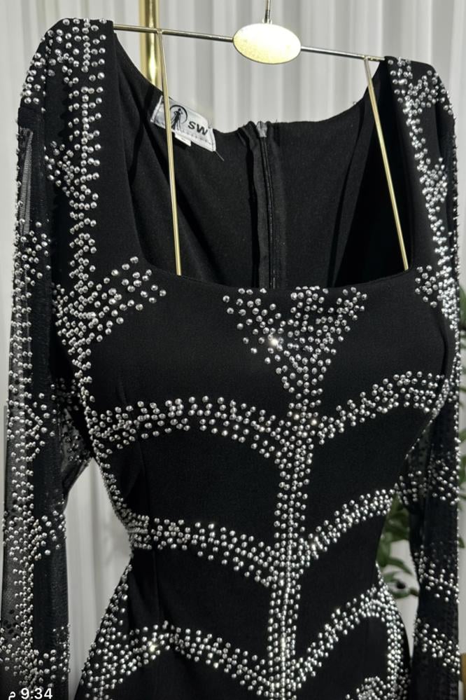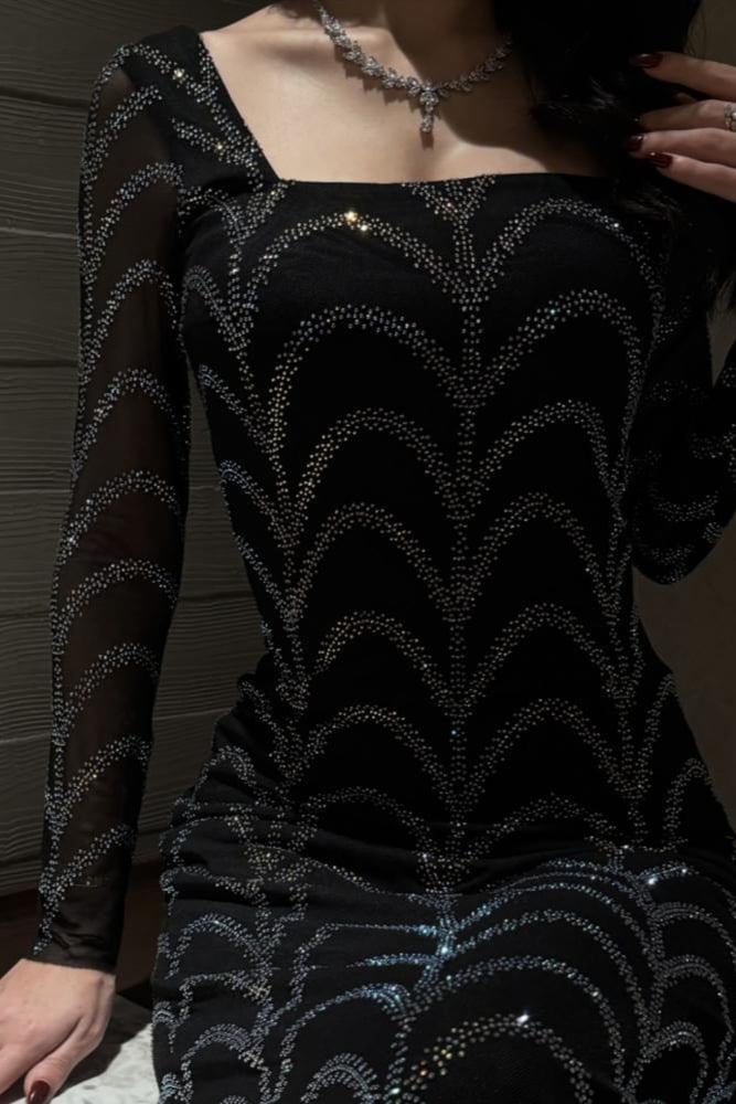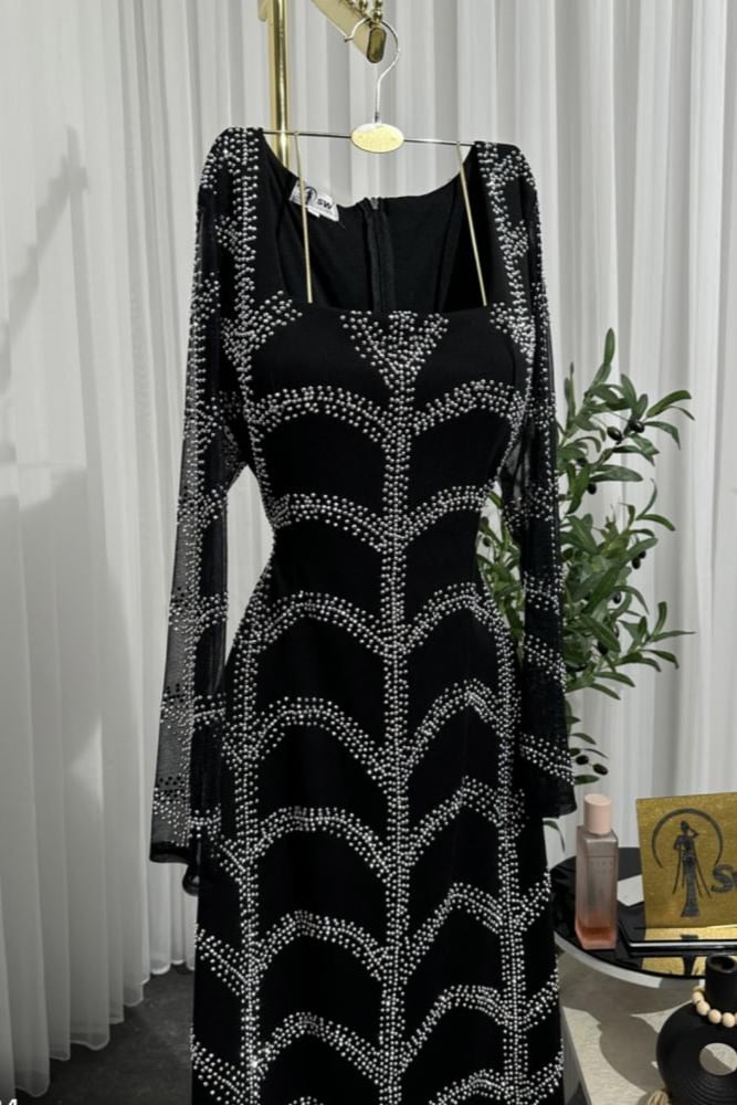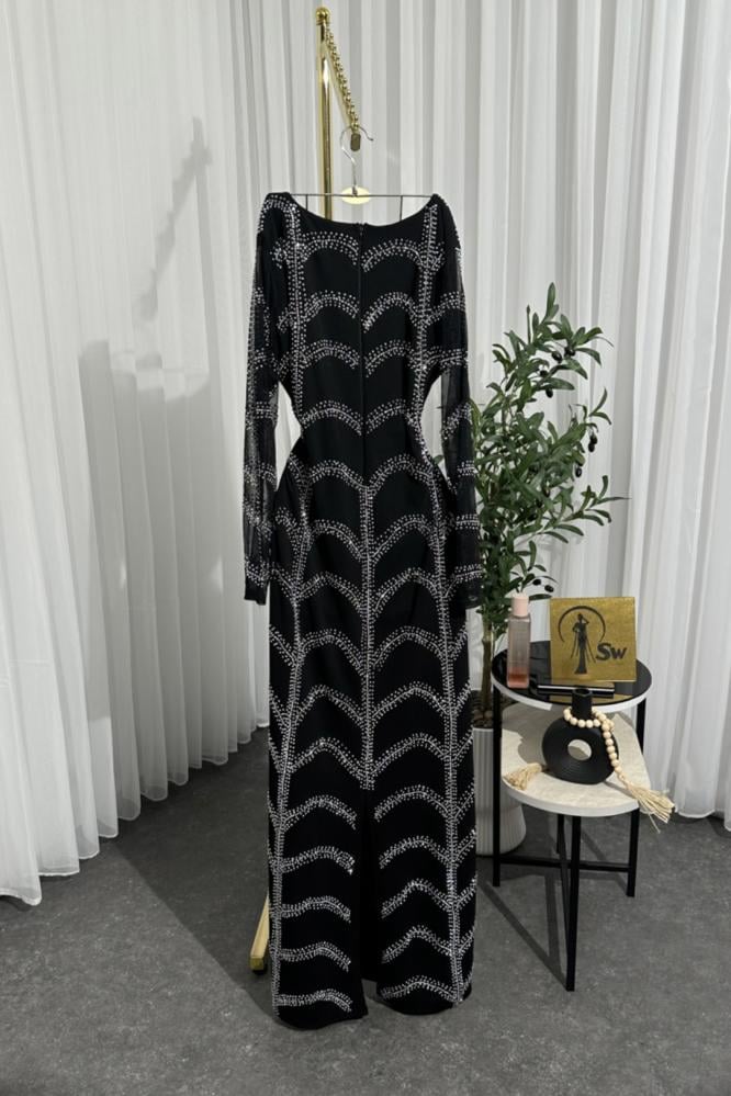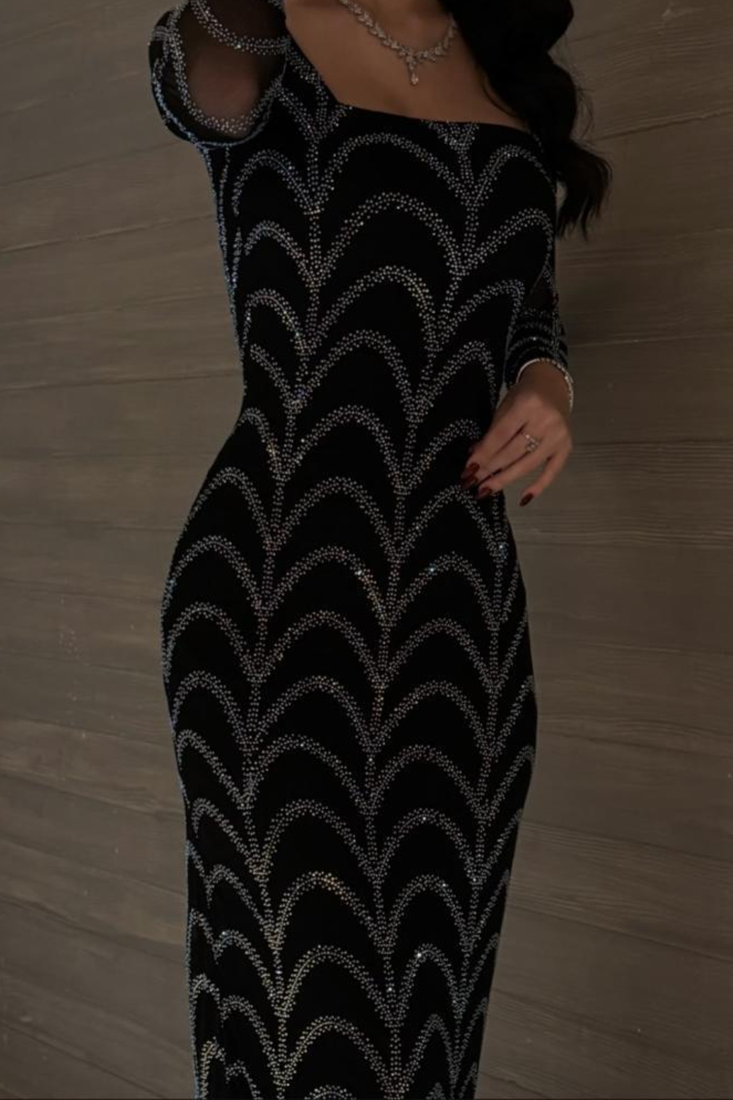 فستان سهرة أسود ضيق مرصع بالكريستال اللامع بأكمام طويلة