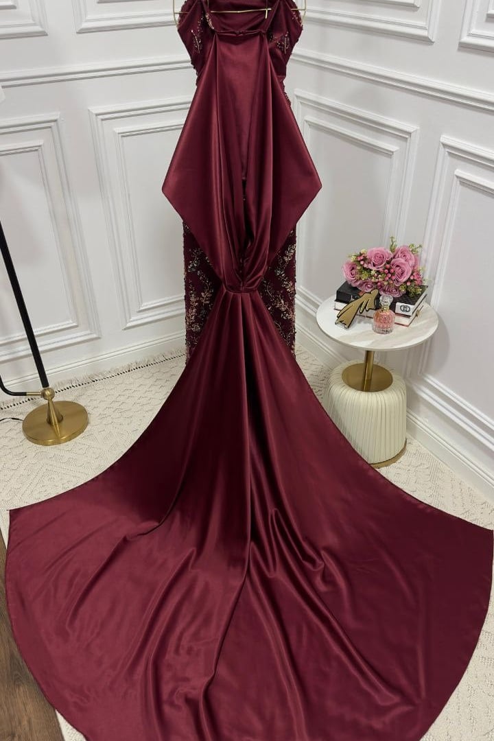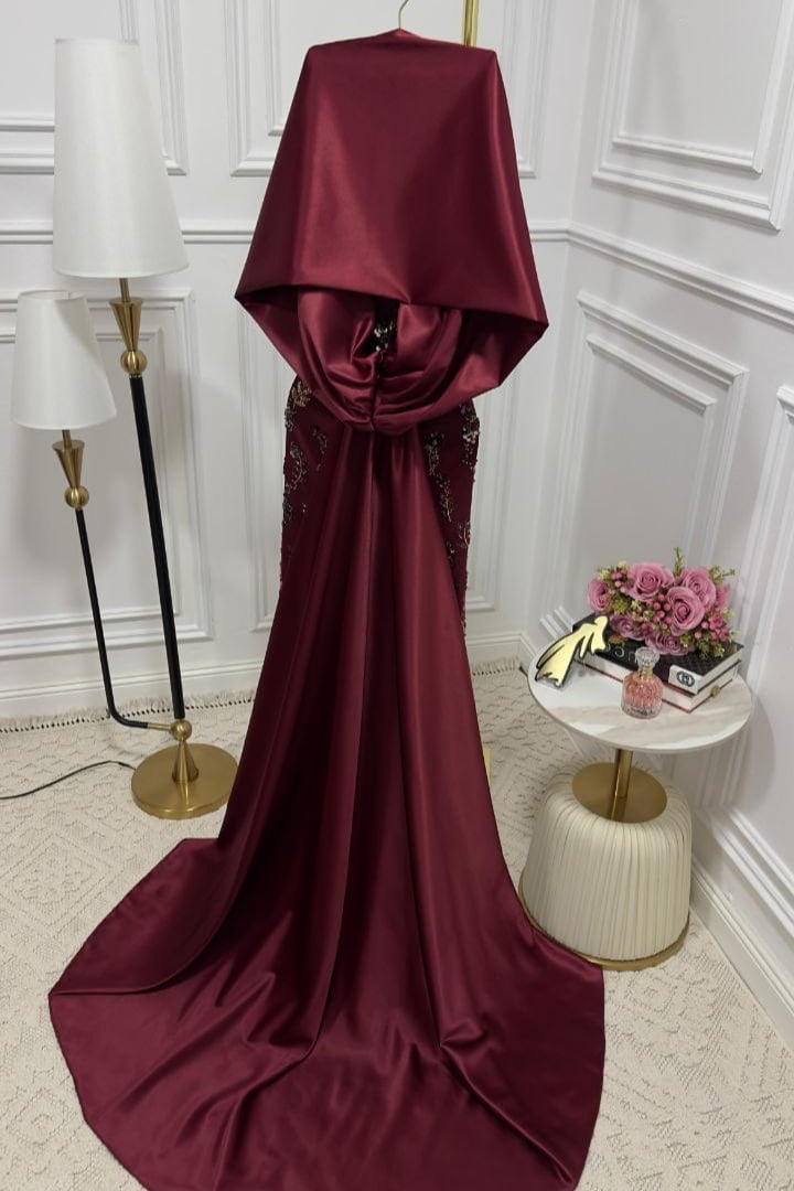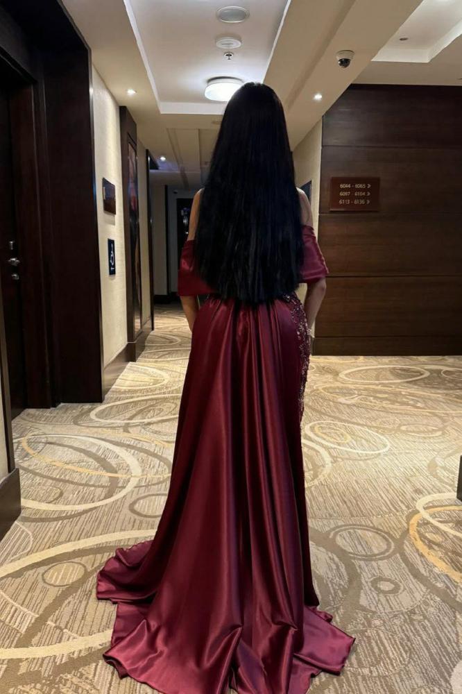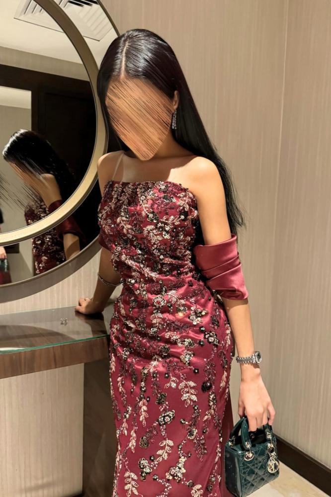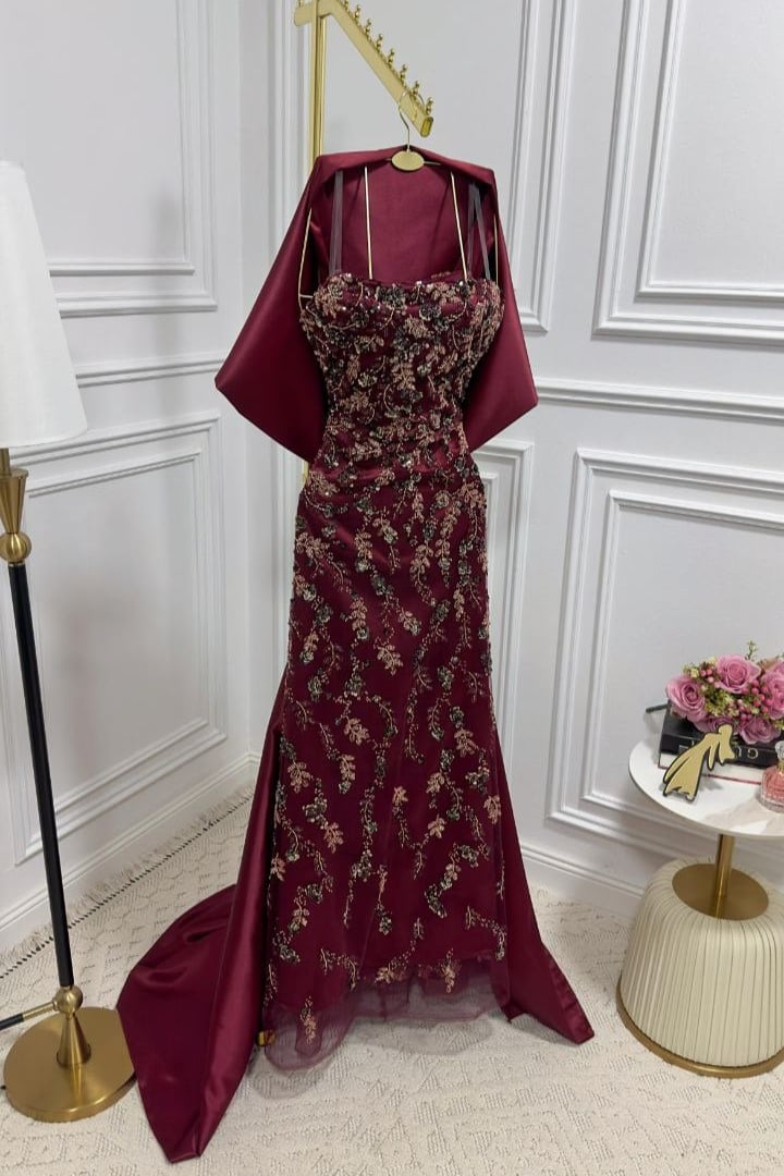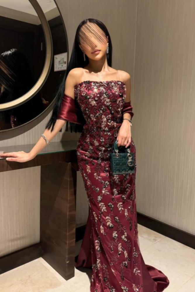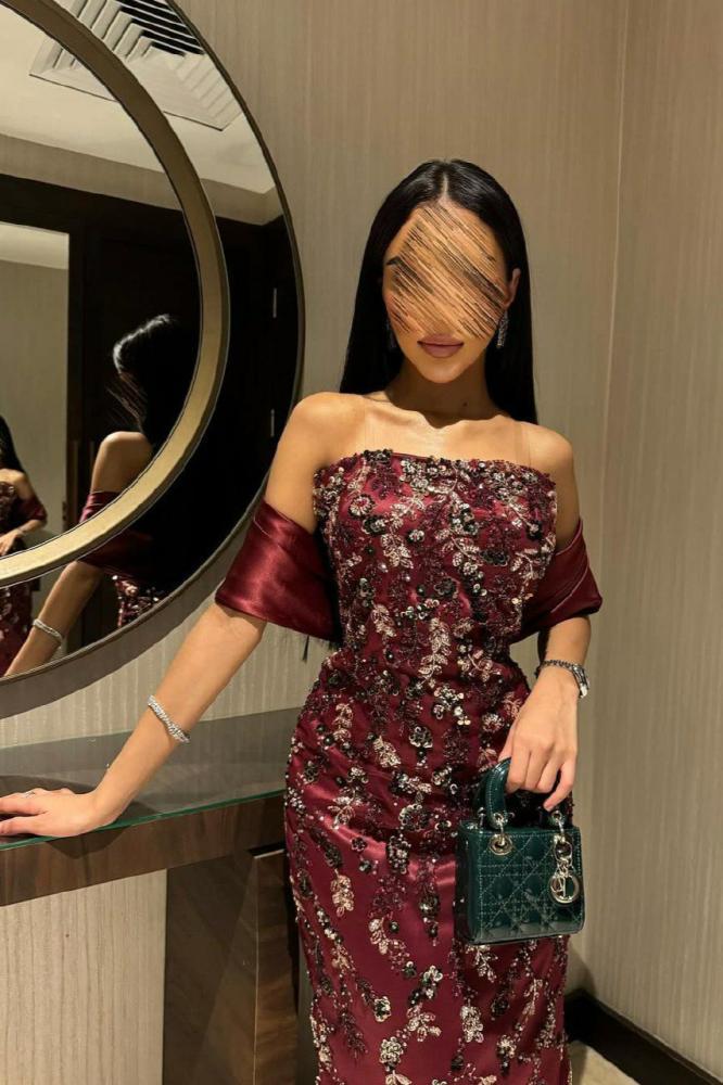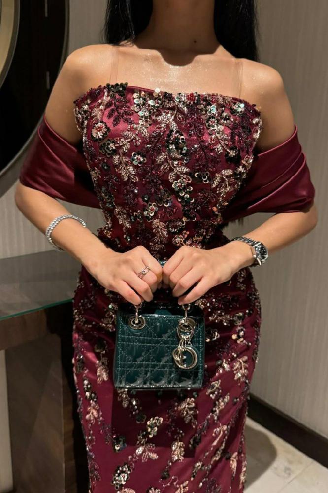 فستان سهرة أنيق بتصميم فاخر مزين بتطريزات فنية تضفي لمسة راقية وساحرة. يتميز بقصة أوف شولدر تعزز الأنوثة بأسلوب جذاب، مع تنورة ضيقة تبرز القوام وانسيابية أنيقة بفضل الذيل الجانبي الطويل. خيار مثالي للسهرات الفاخرة لمن تبحث عن إطلالة راقية وفريدة.